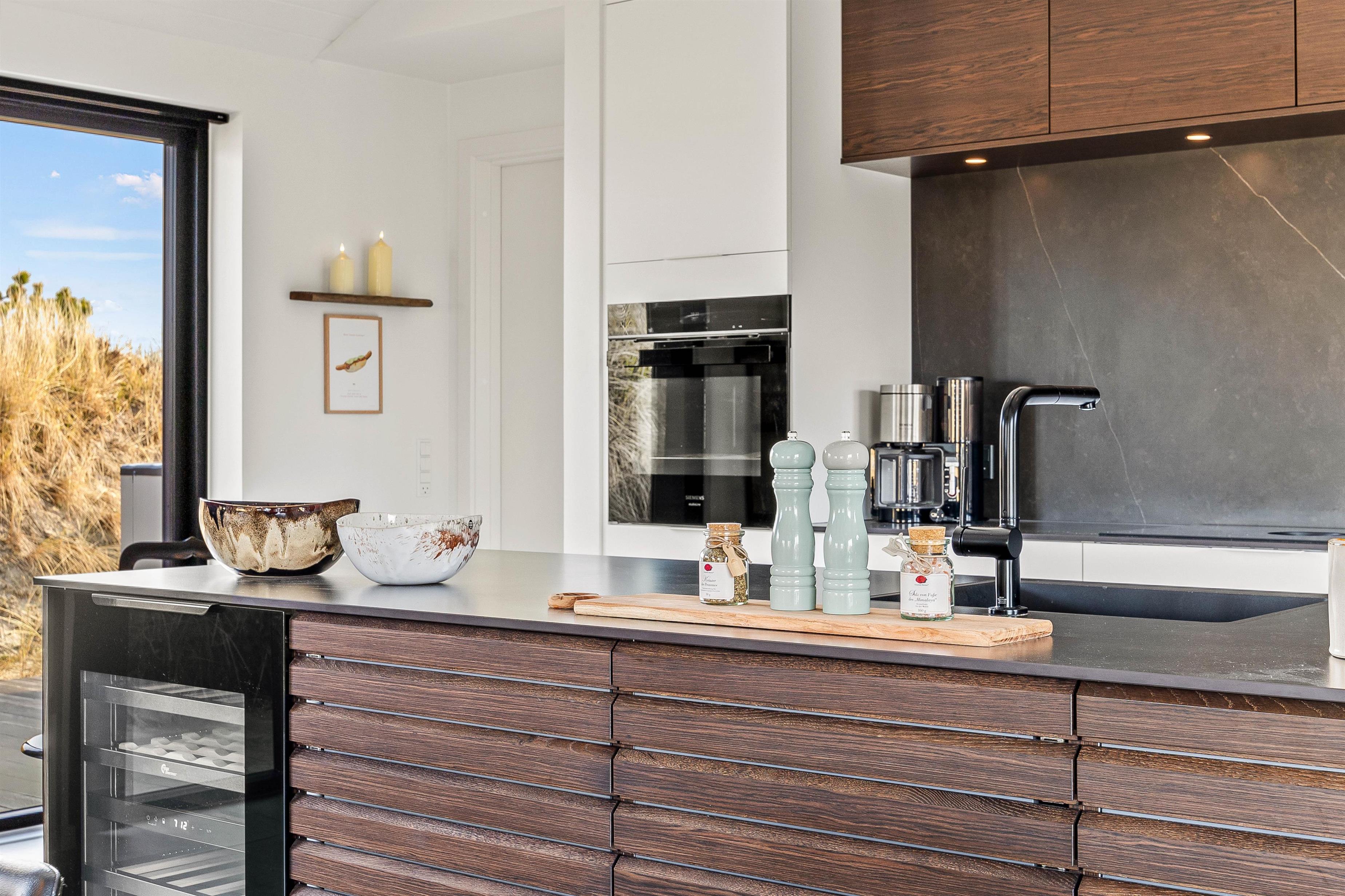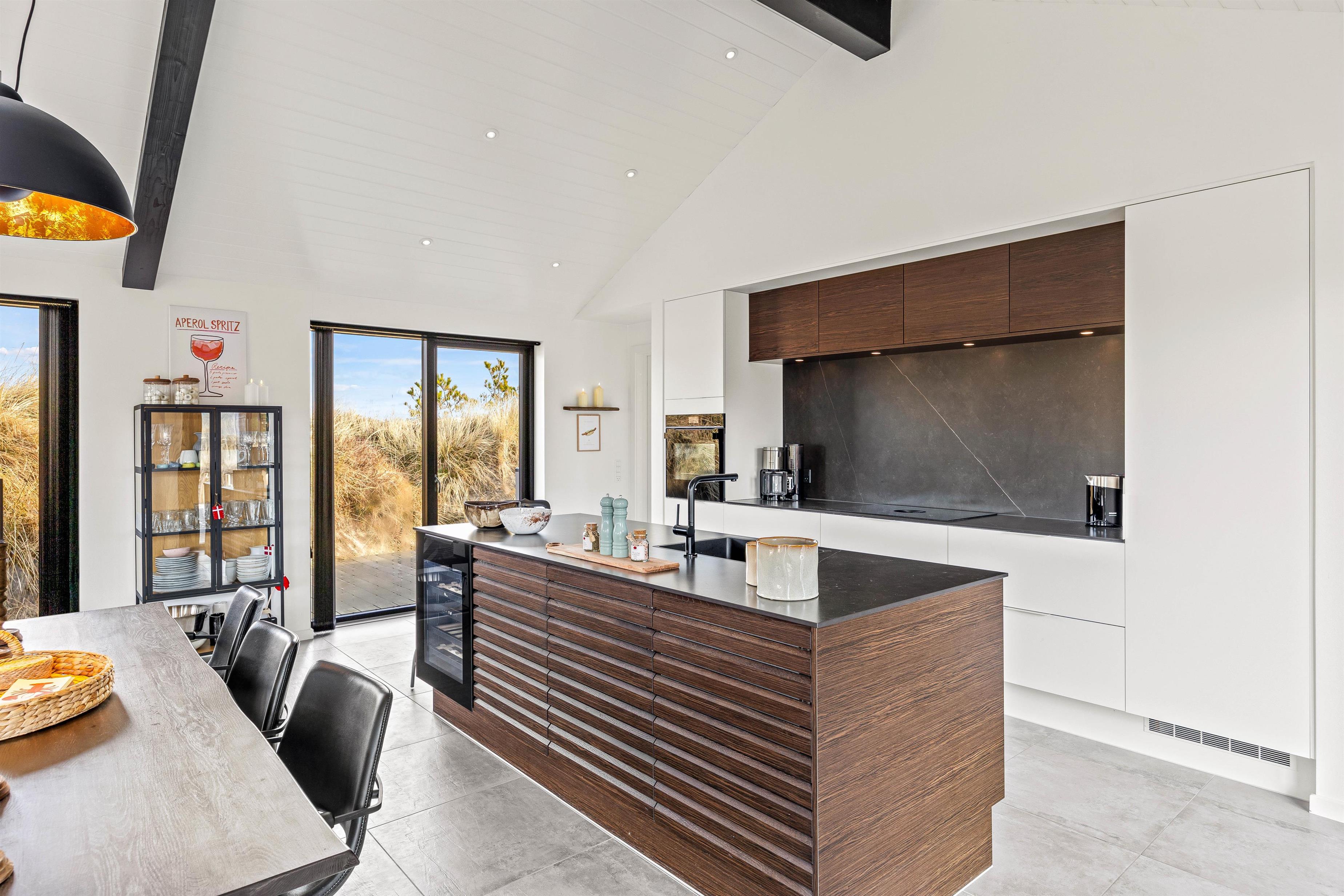 I det 150 kvadratmeter store sommerhus, udgør alrummet hjertet. Her er køkken, spiseplads og stue samlet i ét, og rammerne er derfor sat til mange hyggelige feriestunder med at lave mad, spille spil og se film. Når I har lavet mad i køkkenet, skal opvaskemaskinen nok sørge for at klare den efterfølgende opvask.