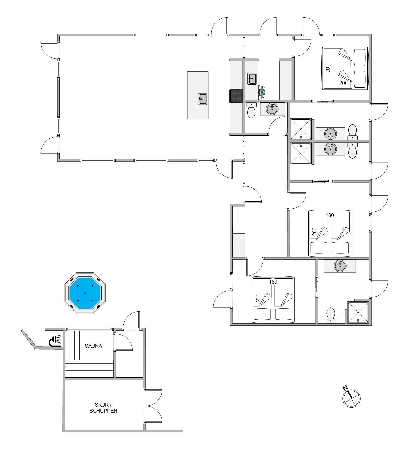 Når I står op efter en god nats søvn, skal I slet ikke bekymre jer om kø til toilettet, for sommerhuset har nemlig hele 3 badeværelser samt 1 gæstetoilet. På både badeværelser, gæstetoilet, soveværelser og i stuen er der gulvvarme, så I slipper for kolde tæer. Derudover har sommerhuset også en energibesparende varmepumpe, der sørger for et godt indeklima hele året rundt.