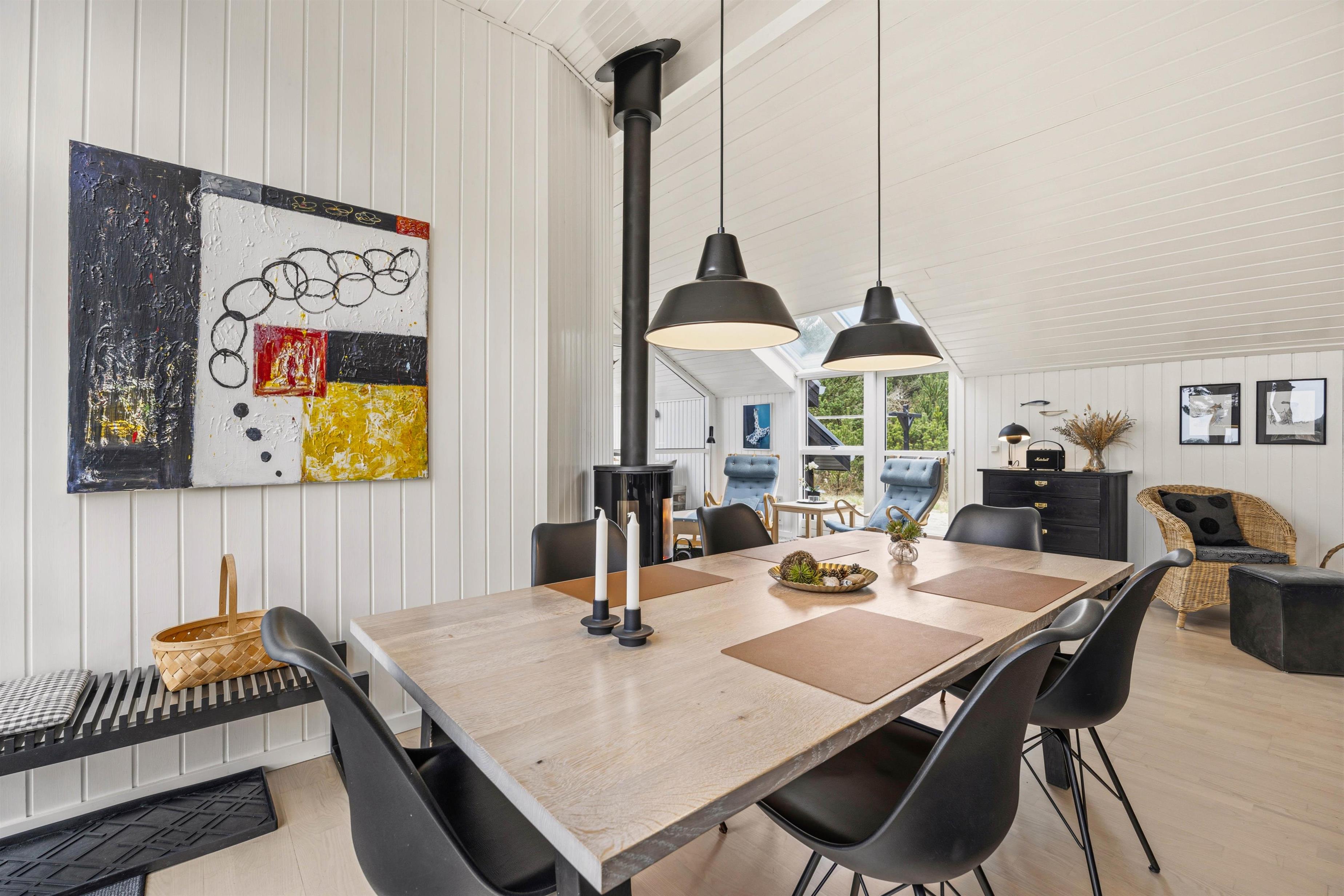 Både køkken, stue og spiseplads er samlet i det samme åbne rum, som giver gode betingelser for masser af samvær, selv når I hver især laver noget forskelligt. I ferieboligen er der også en varmepumpe, der sørger for en behagelig temperatur indenfor hele døgnet. Når der skal være ekstra hyggeligt, kan I tænde op i brændeovnen og nyde varmen fra de knitrende flammer.