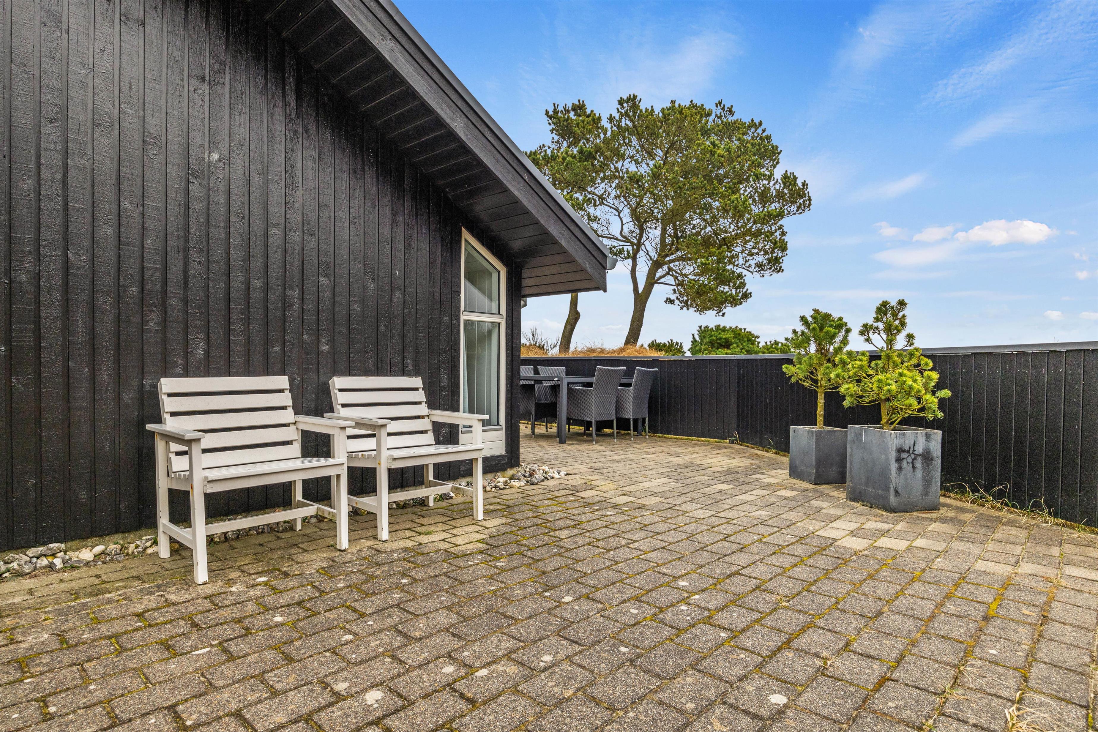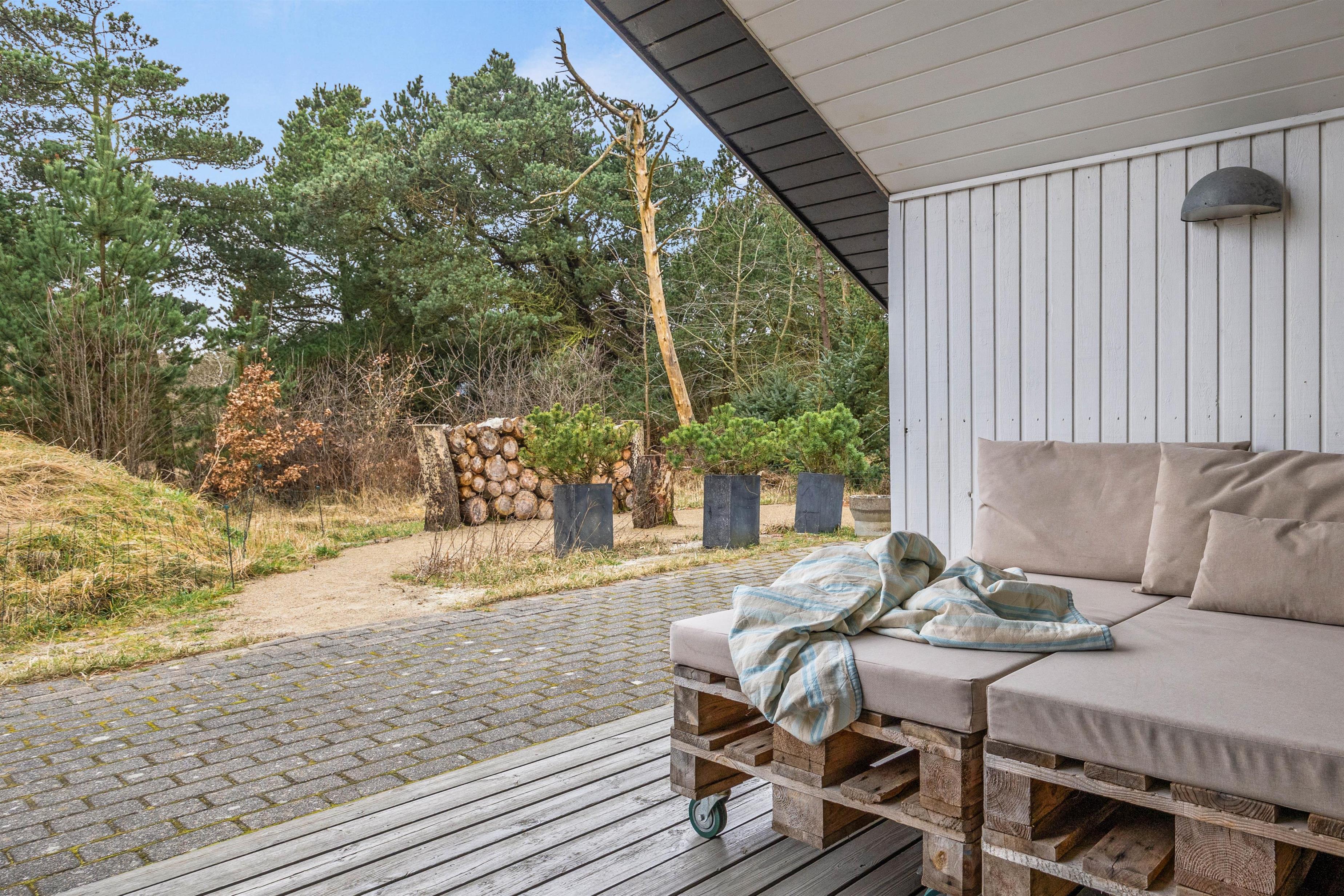 Rund om hele huset er der en flisebelagt terrasse, så uanset hvordan solen står, kan I altid finde et spot, hvor den peger i jeres retning. I den ene ende af huset er der en træterrasse under udhænget, hvor I finder ly og læ, så I kan nyde kaffen udendørs uanset vejret. Huset har både grill, møbler, solvogne og parasol til fri afbenyttelse.