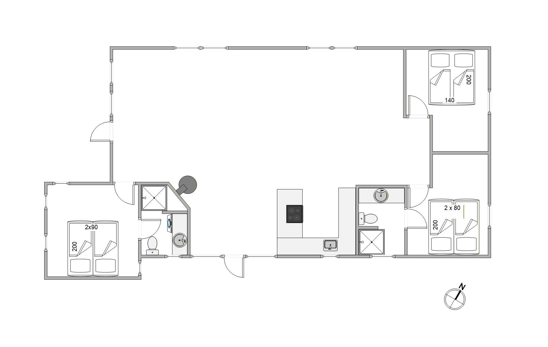 Sommerhuset, der blev renoveret i 2017, har tre værelser med hver en dobbeltseng. 2 værelser har eget badeværelse, en med gulvvarme, så der bliver ikke kø til toilettet eller morgenbadet.
