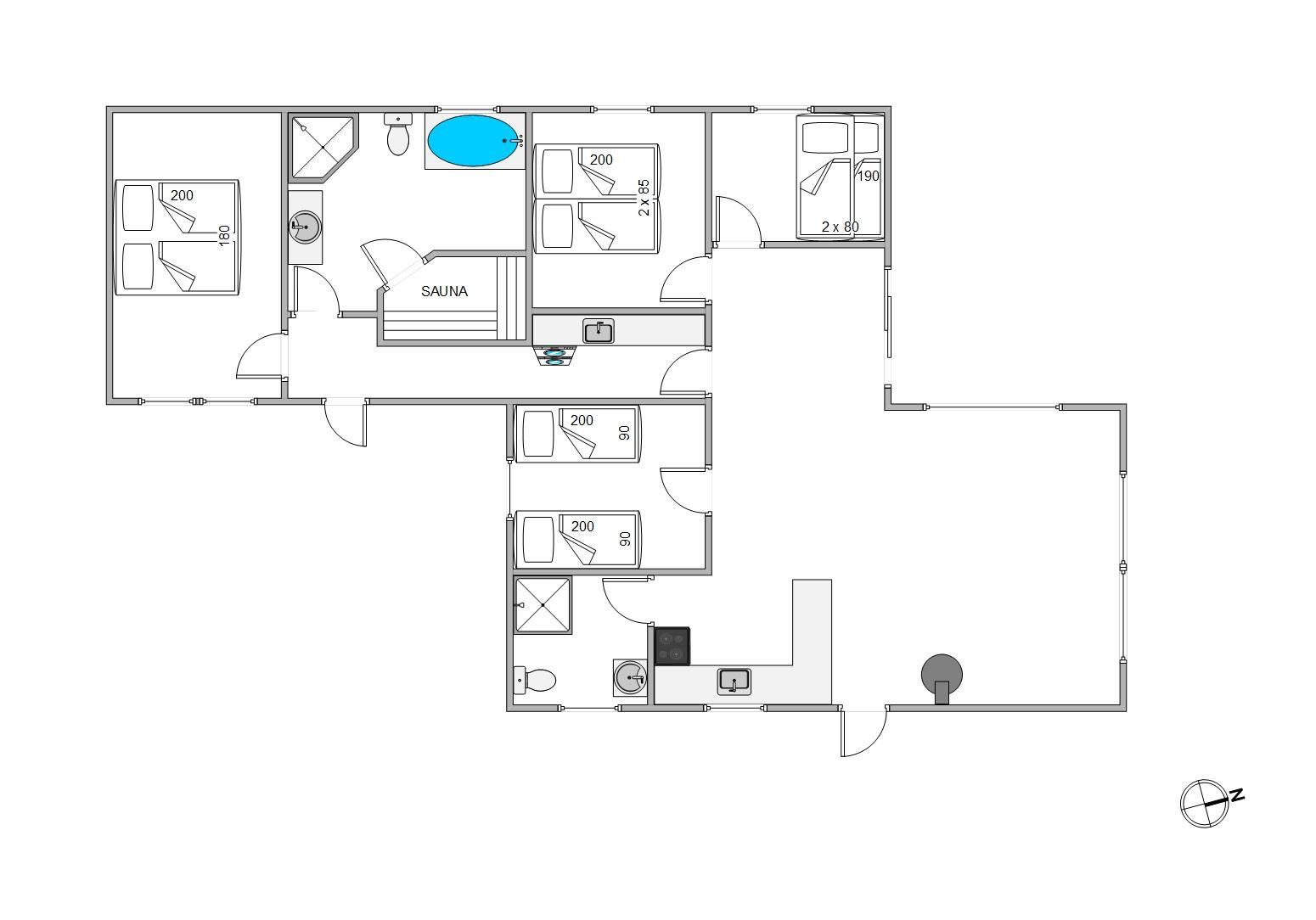 De fine soveværelser rummer god plads til 6 personer, og med hele to badeværelser slipper I for de lange toiletkøer om morgenen. På det største badeværelse finder I en lækker wellnessafdeling med sauna og badekar, hvor I rigtig kan koble af og få et pusterum fra den travle hverdag. Udenfor finder I også en dejlig udendørs bruser*.