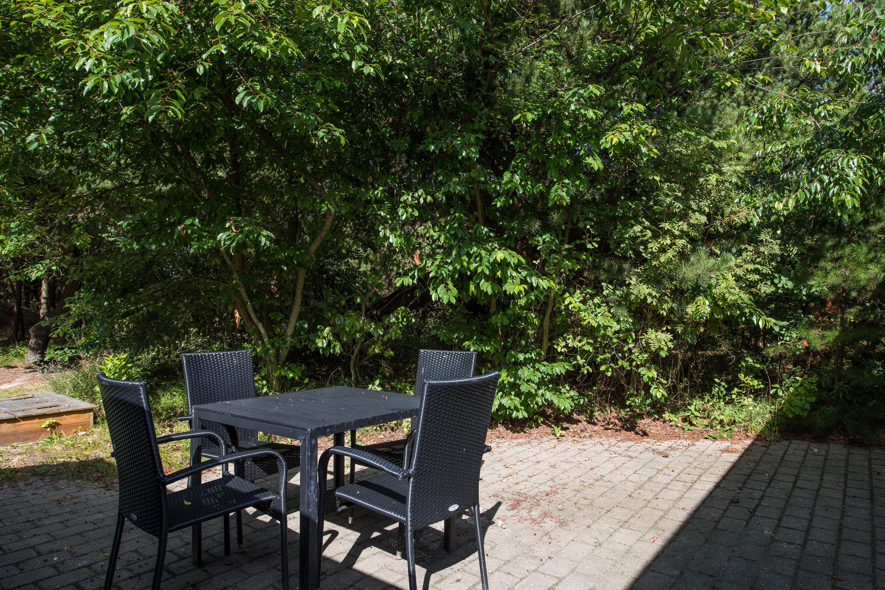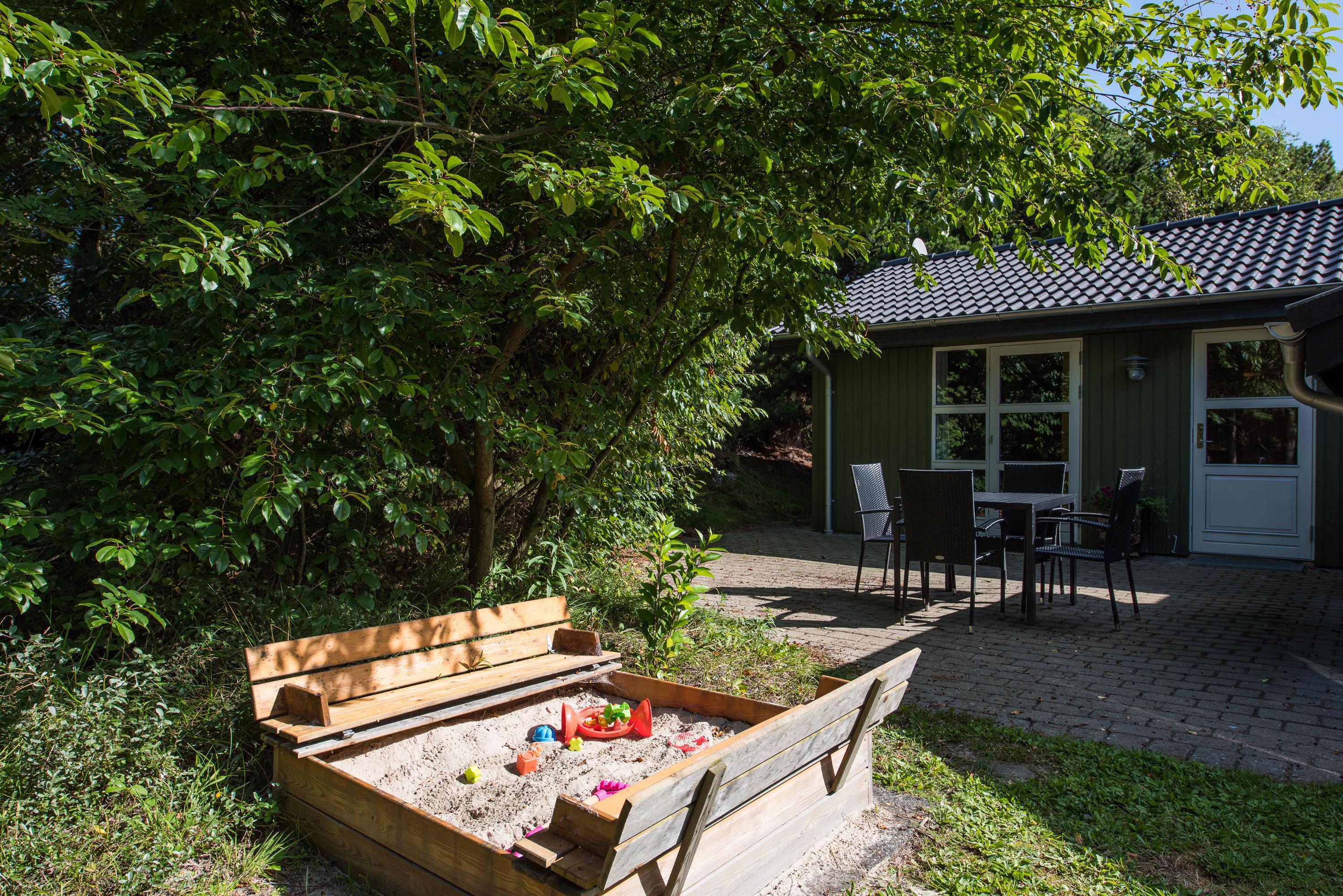 Feriehuset har en fantastisk ugeneret beliggenhed på en stor plænegrund omkranset af høje træer, og på den fine terrasse kan I nyde solen og fuglenes fløjten i god ro og fred fra liggestolene. Her er også tænkt på de mindste feriegæster, og med en sandkasse og et gyngestativ på grunden skal de nok blive holdt godt beskæftiget, mens I slapper af.