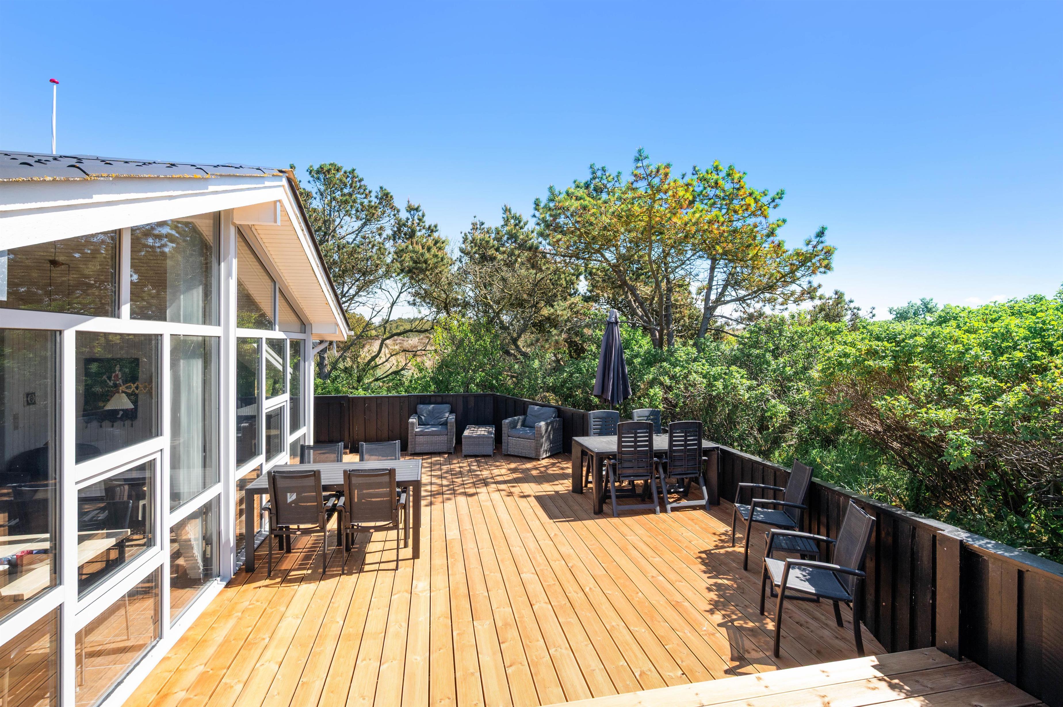 Beliggende på en 1400m2 natur- og klitgrund, er dette skønne sommerhus omgivet af smuk og fredfyldt natur, og vil I i den grad kunne slappe af og koble fra i rolige omgivelser. Her kan I nyde jeres morgenkaffe i de komfortable havemøbler på terrassen, imens I kan høre lyden af havets bølger, der rammer stranden. Hyggelige grillaftener kan nydes på den lukkede terrasse, mens I beundrer udsigten og solnedgangen over det naturskønne område i og omkring Henne Strand.
