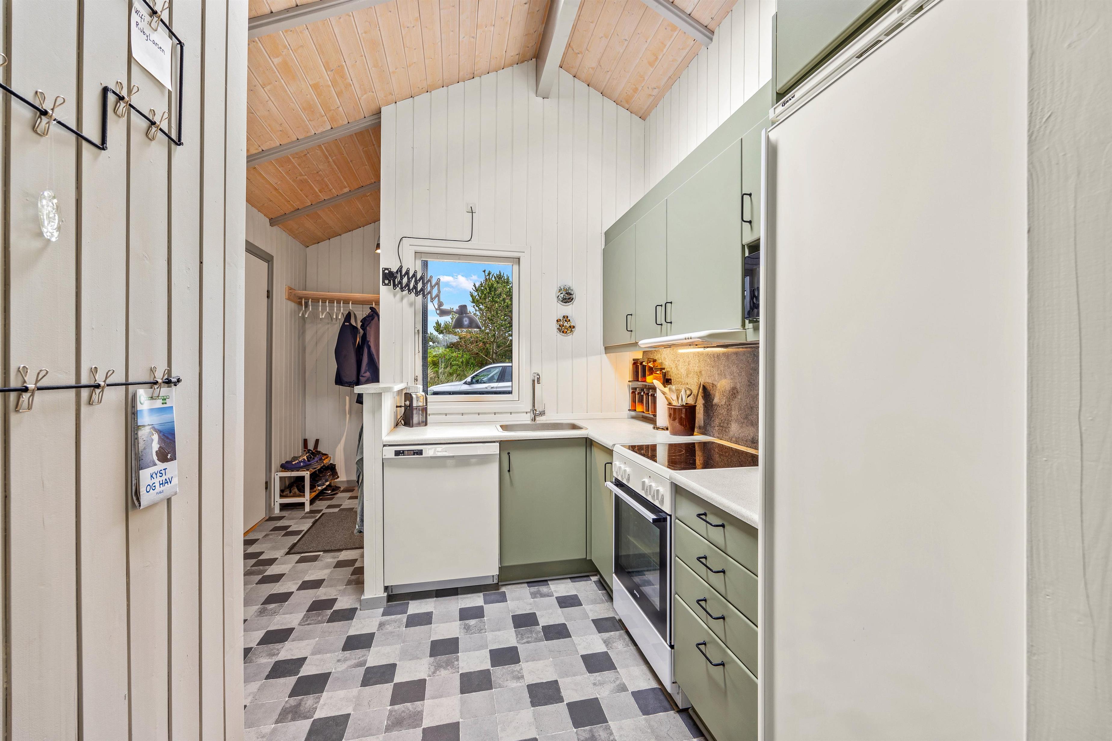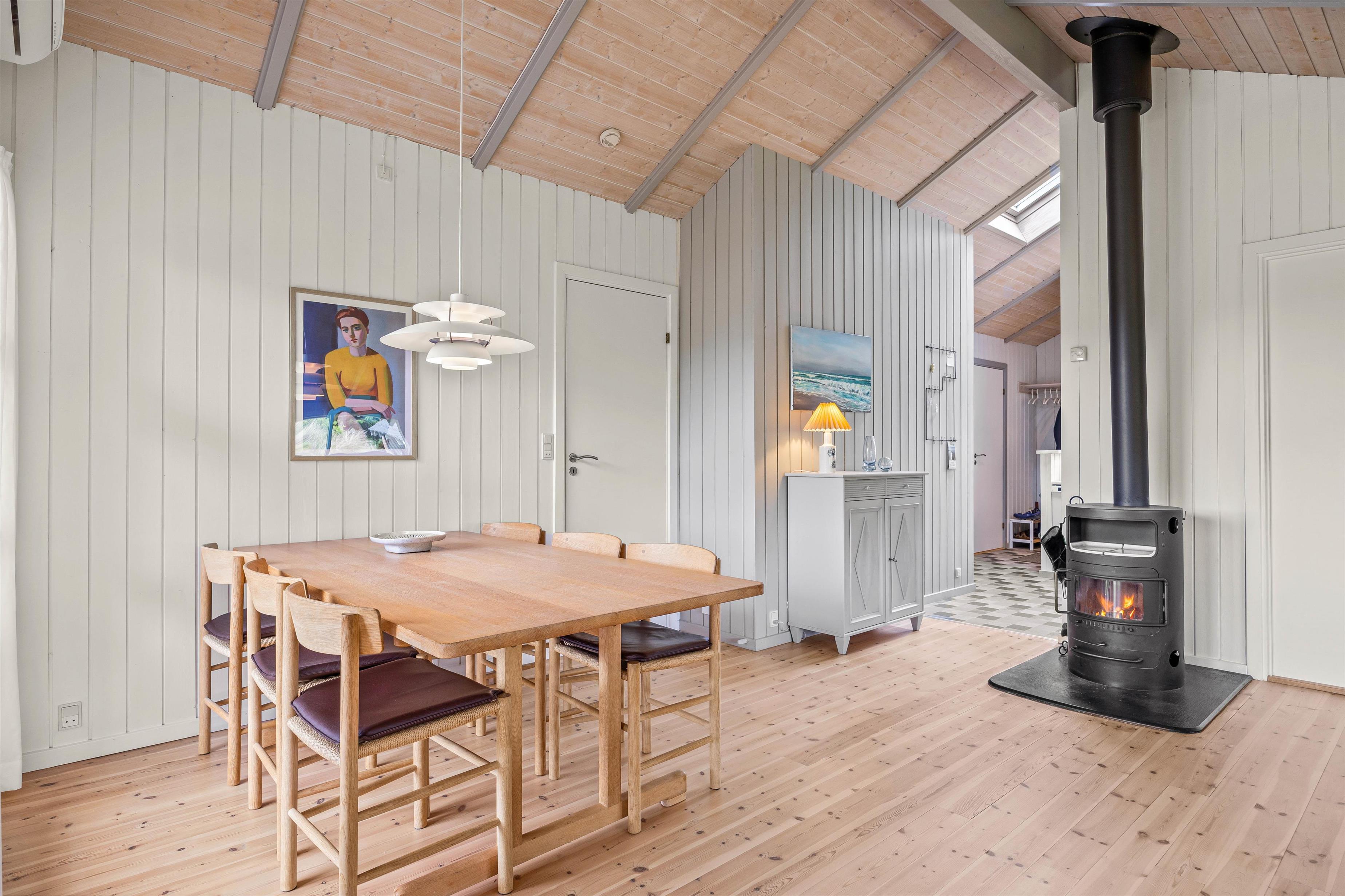 Hjertelig velkommen på Mågevej 3! Et klassisk feriehus, hvor man mærker varmen med det samme! Her er loft til kip, komfortable møbler og lyst med de hvide træpaneler. Fra det velfungerende køkken med opvaskemaskine er det åbent ind til den kombinerede spisestue og stue. Særligt her vil I helt sikkert komme til at tilbringe mange timer sammen med spil, film og lækre måltider. Sæt jer godt til rette i stuen med en god bog, mens brændeovnen spreder varme og glæde på de koldere dage. Her er såmænd også en varmepumpe, der sørger for et godt indeklima.