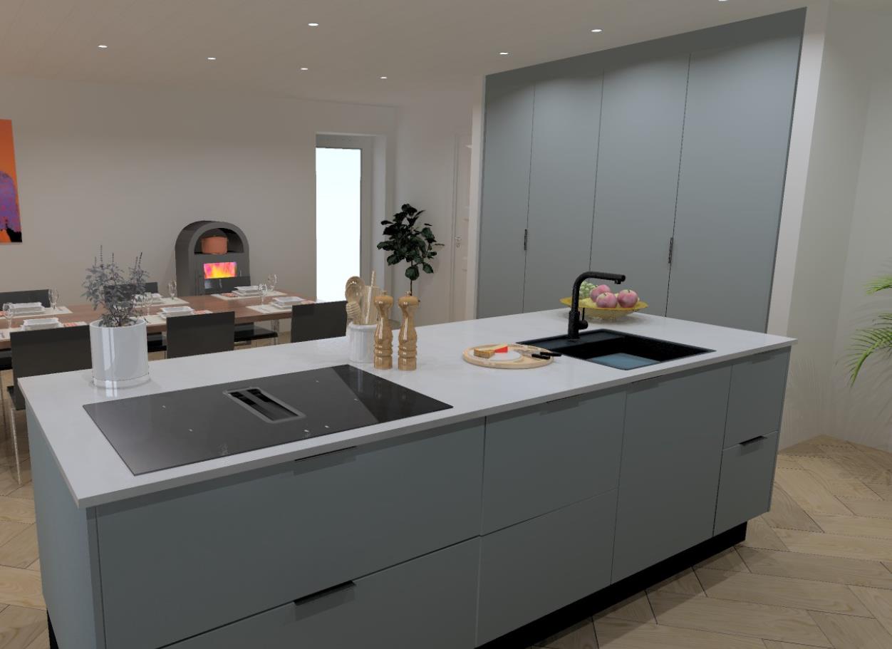 Det åbne køkken er fuldt udstyret med bl.a. opvaskemaskine, mikrobølgeovn, køle-/fryseskab og induktionskomfur – her er der alt, hvad I behøver for at lave lækre måltider. Der er vinkøleskab, så den medbragte vin kan nydes med den rette temperatur.