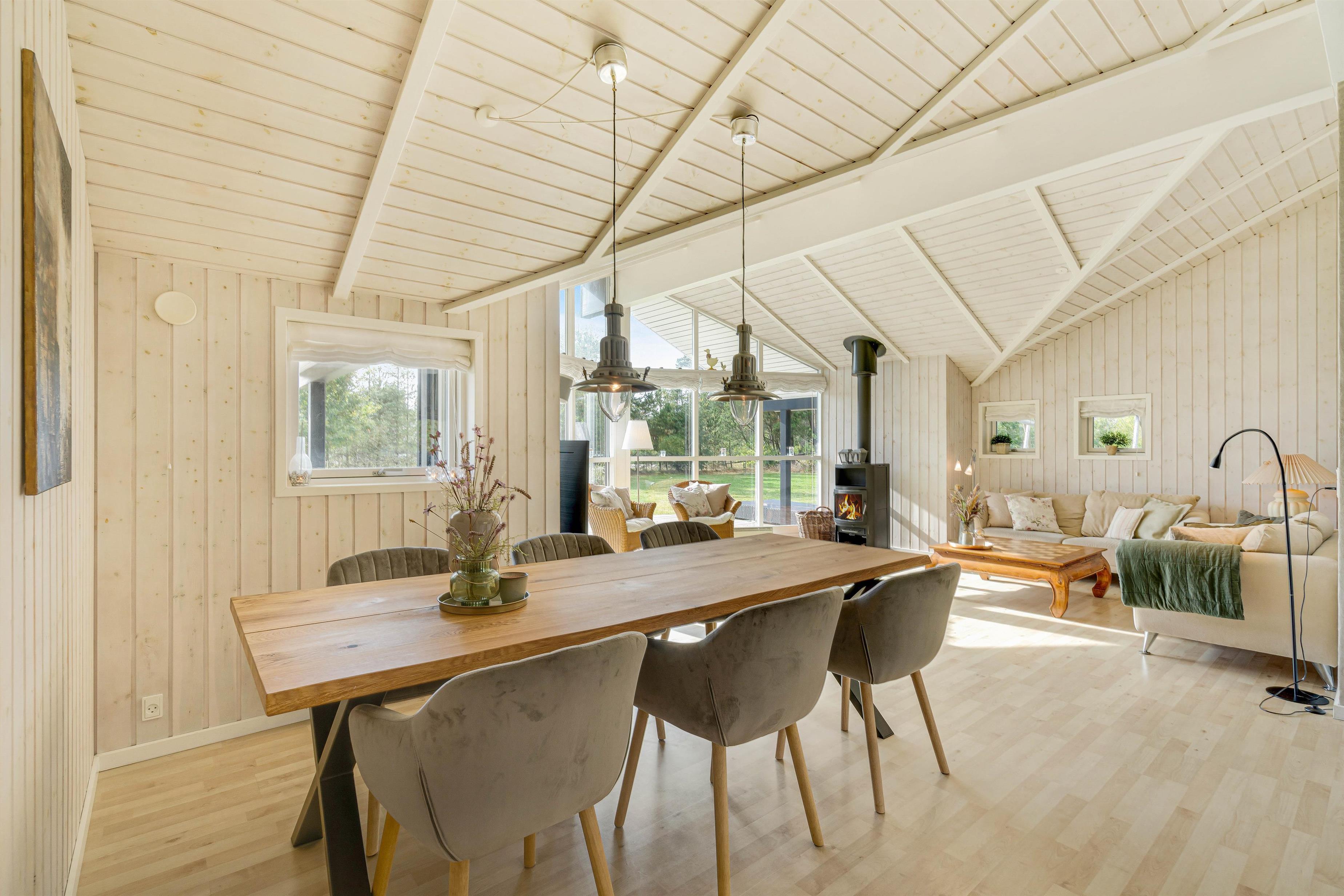 Hjertet i feriehuset er alrummet, der forener køkken, spiseplads og stue, hvor I kan samle familien til hyggelige stunder med spil og film, mens opvaskemaskinen klarer opvasken efter madlavningen. Der står desuden en brændeovn i alrummet, som fuldender den hyggelige feriestemning. Fra alrummet er det også muligt at kravle op på en hems, som vil blive et sikkert hit blandt børnene.