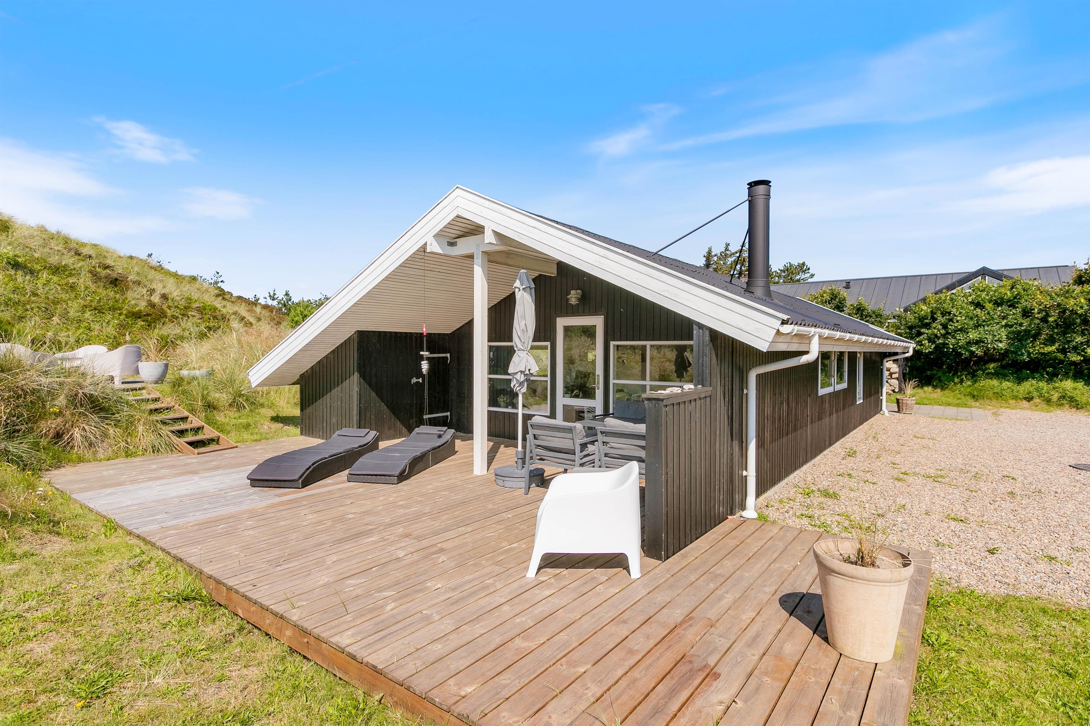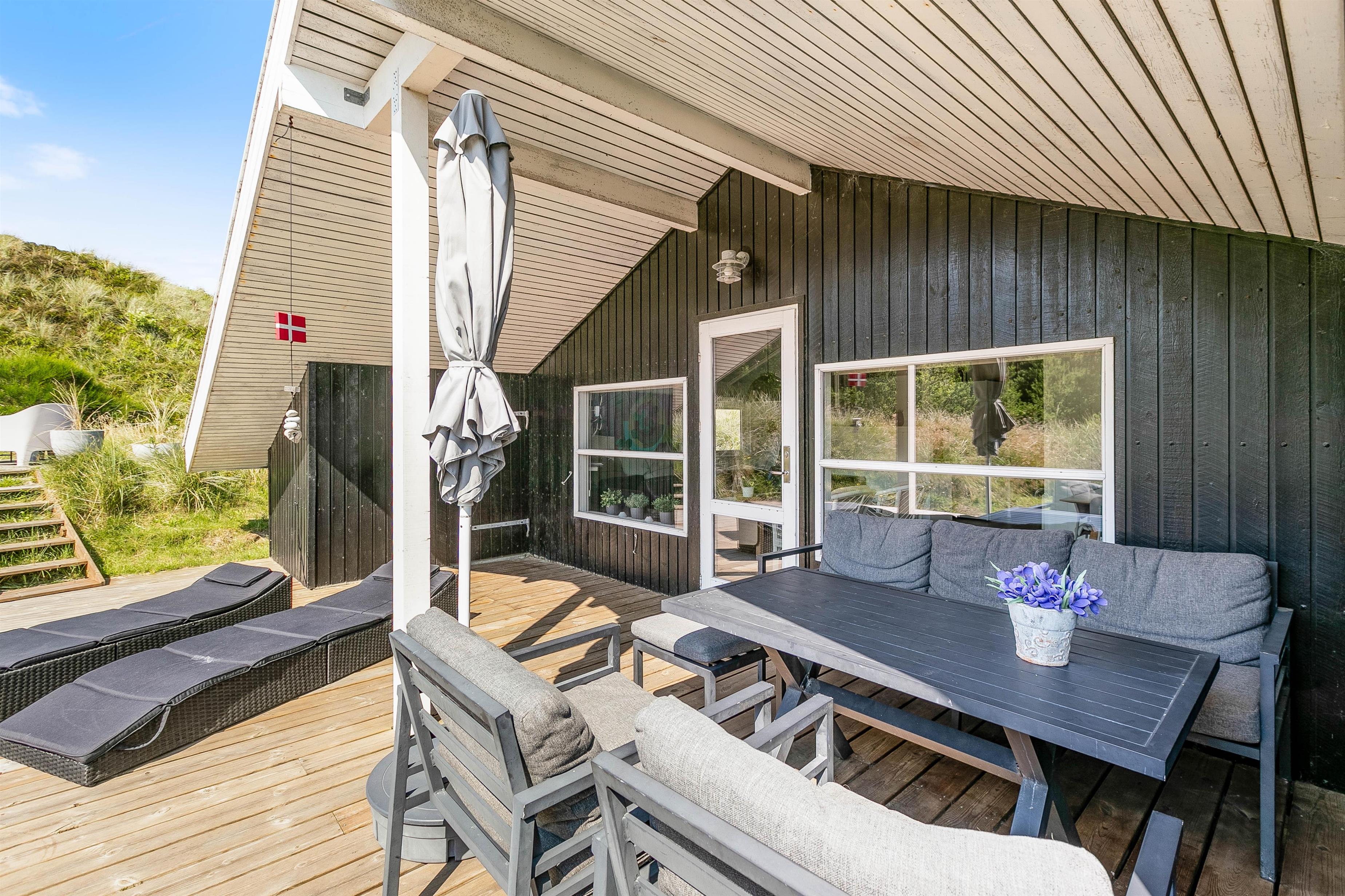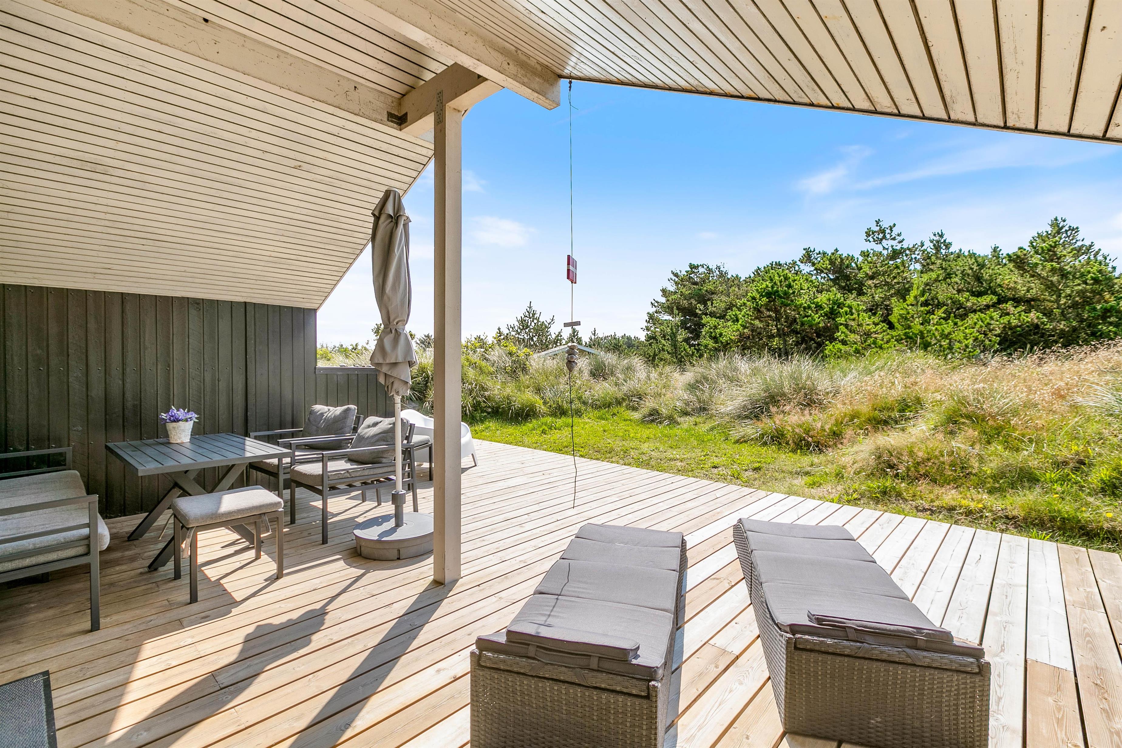 Fra stuen er der udgang til den flotte træterrasse, som er delvist overdækket, så I også kan finde skygge eller nyde udelivet i regnvejr. Rundt om huset finder I flere dejlige terrasser, så I altid har mulighed for at finde en dejlig plads under solen. Læn dig tilbage, nyd en bog og frisk kop kaffe i havemøblerne, solbad eller gå op ad trappen til den højere terrasse, hvorfra den fantastiske udsigt kan ses. Om aftenen kan I tænde op i grillen og slappe af under den overdækkede del af terrassen med et glas vin i hånden.