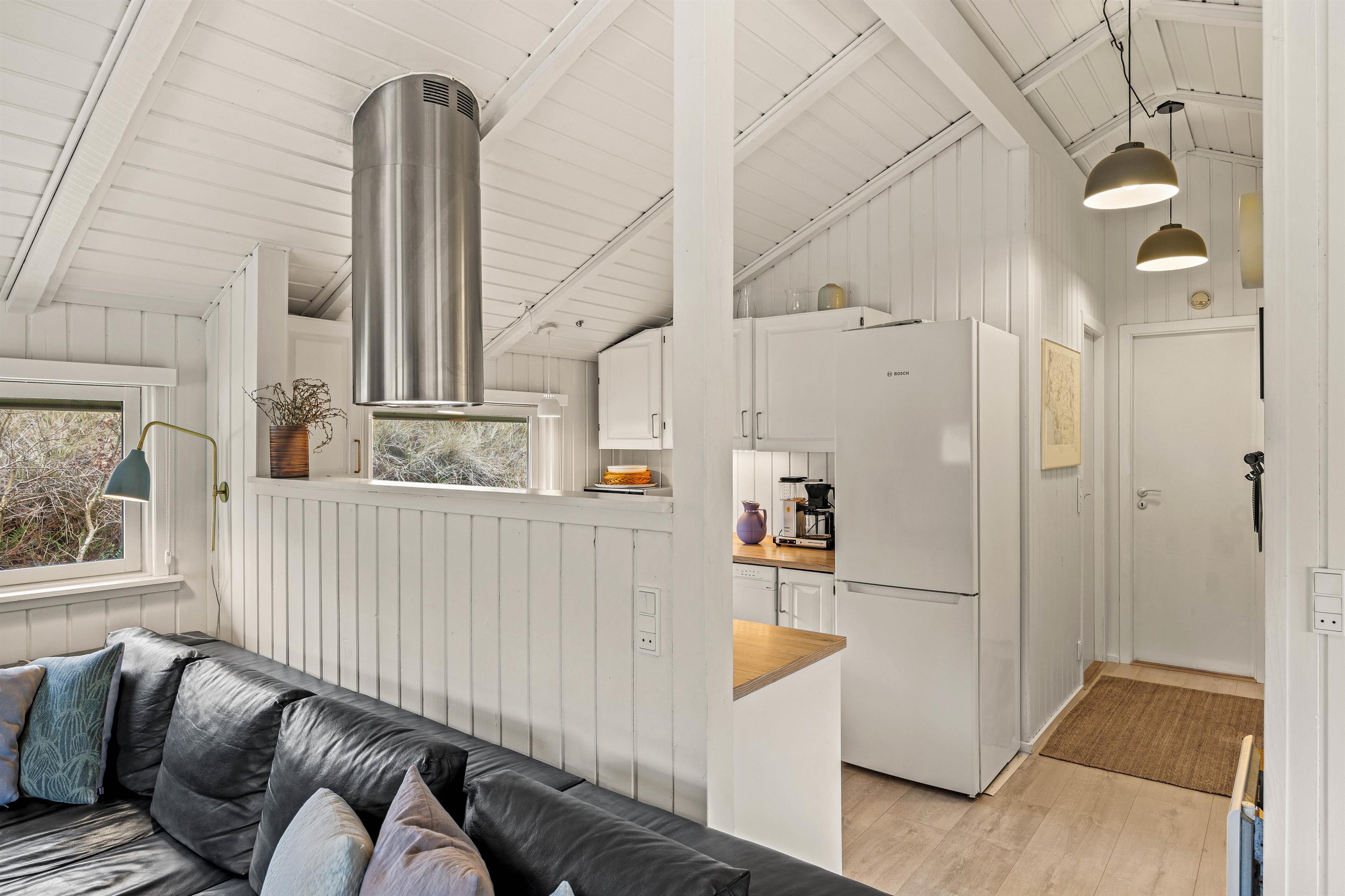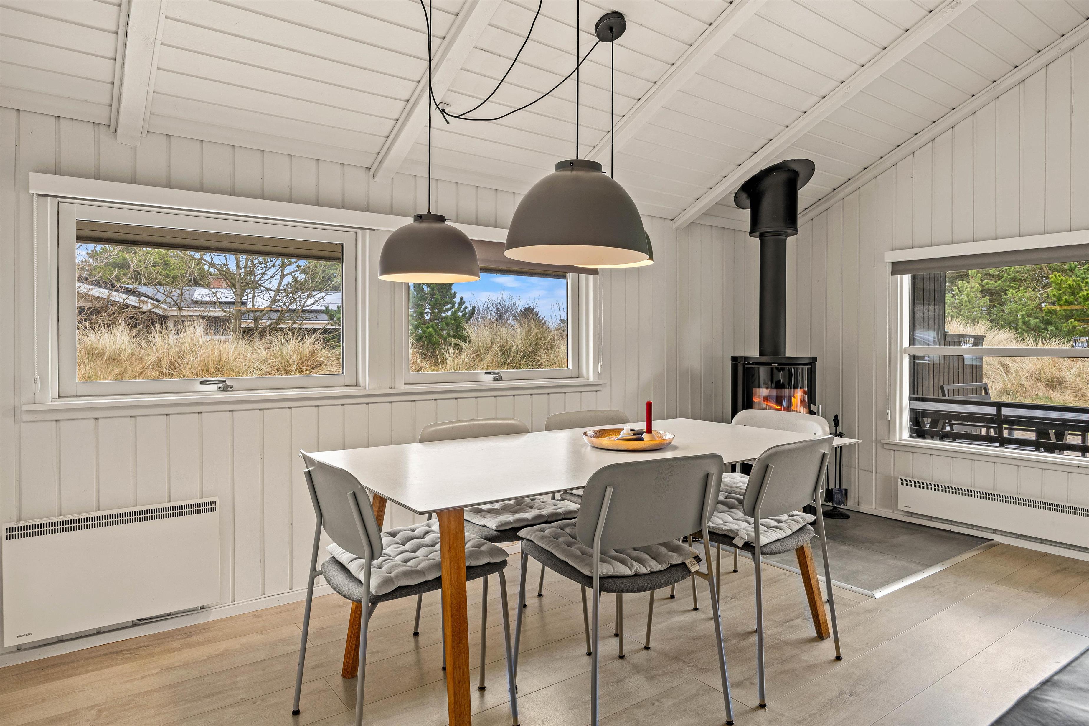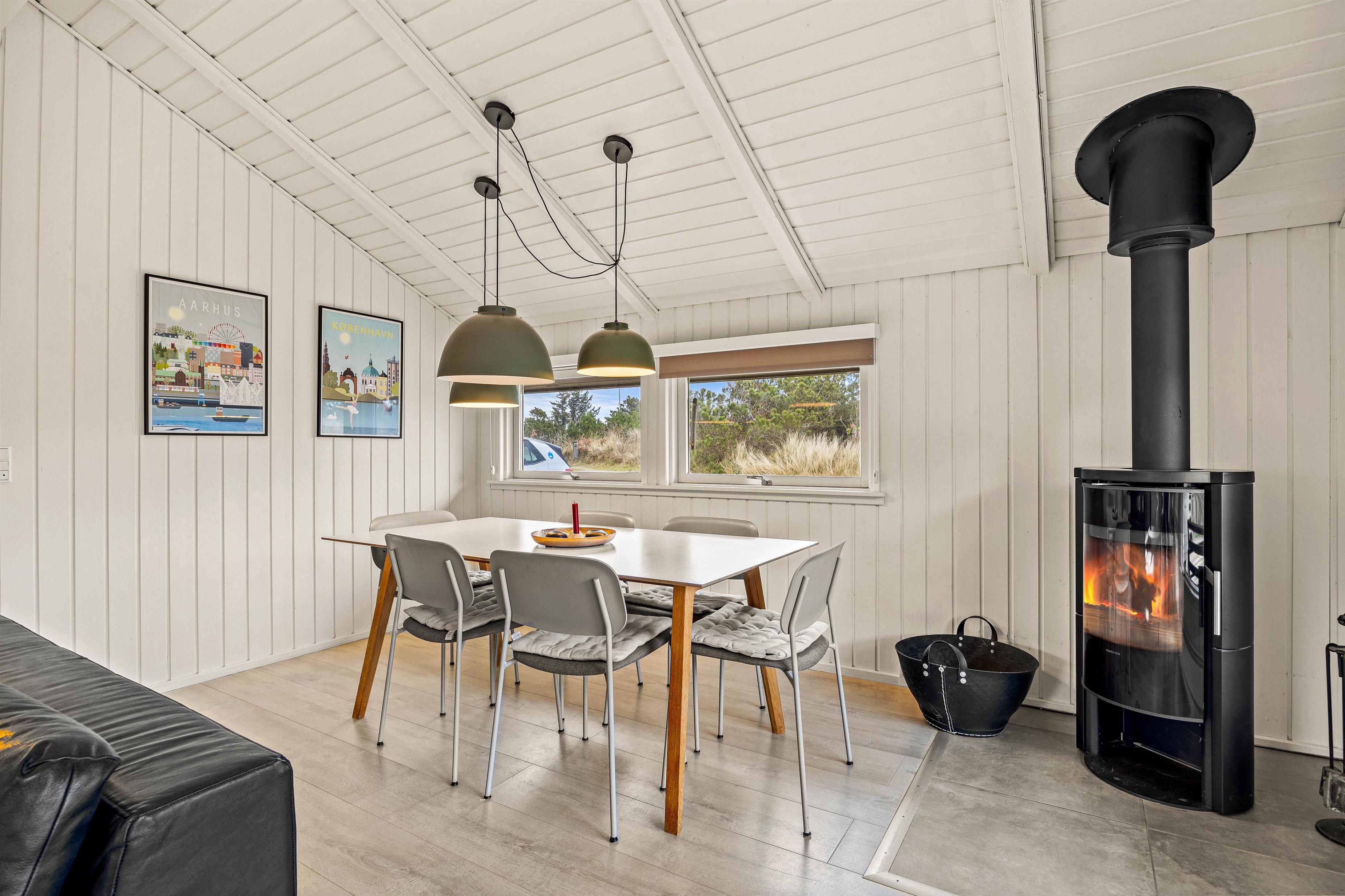Den knitrende brændeovn er at finde i det dejlige opholdsrum, hvor stue og køkkenet er i åben forbindelse. På den måde kan hele familien snakke og grine sammen på tværs af rummet. Også her er der rig mulighed for at nyde et glas vin sammen ved spisebordet eller spille brætspil sammen.