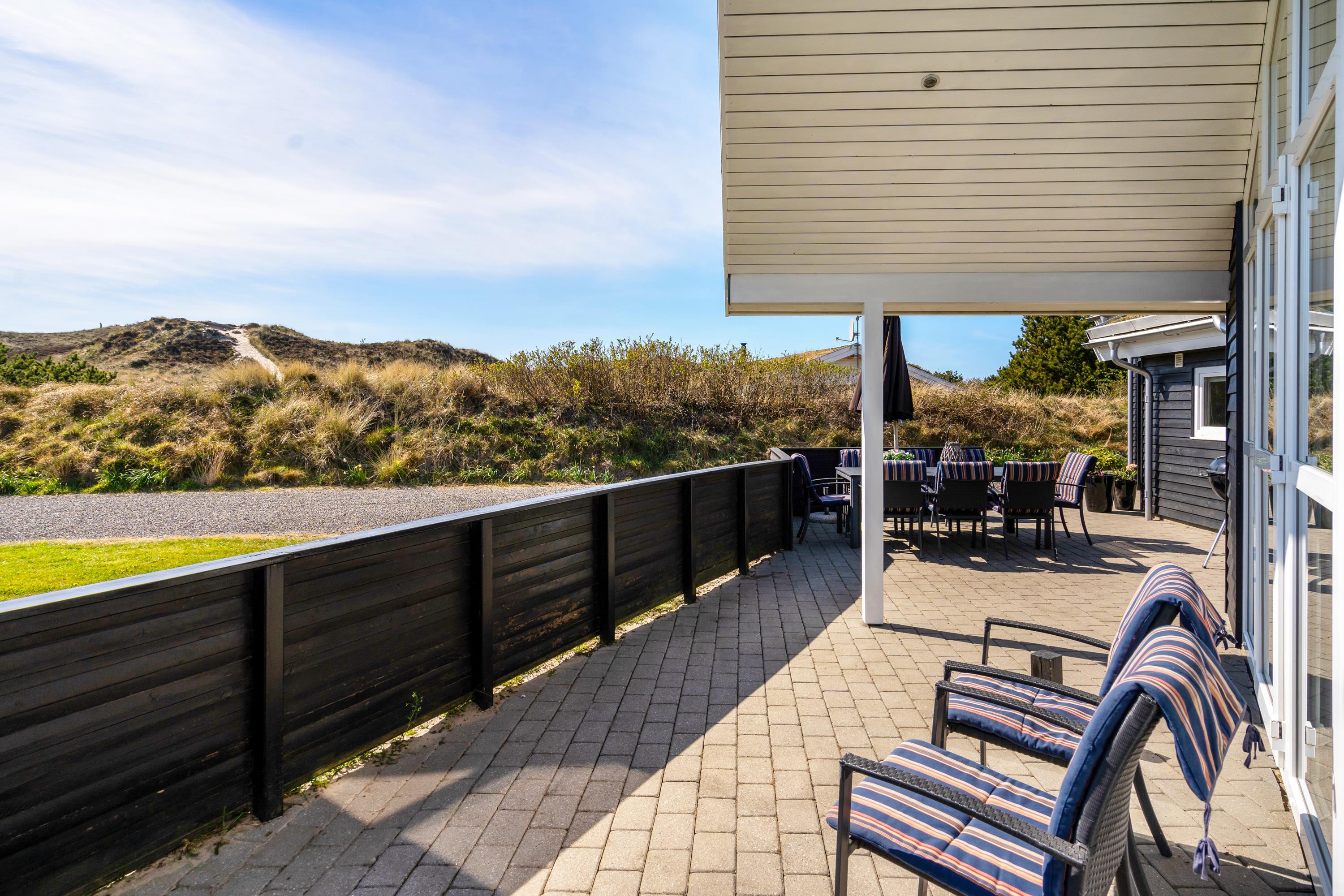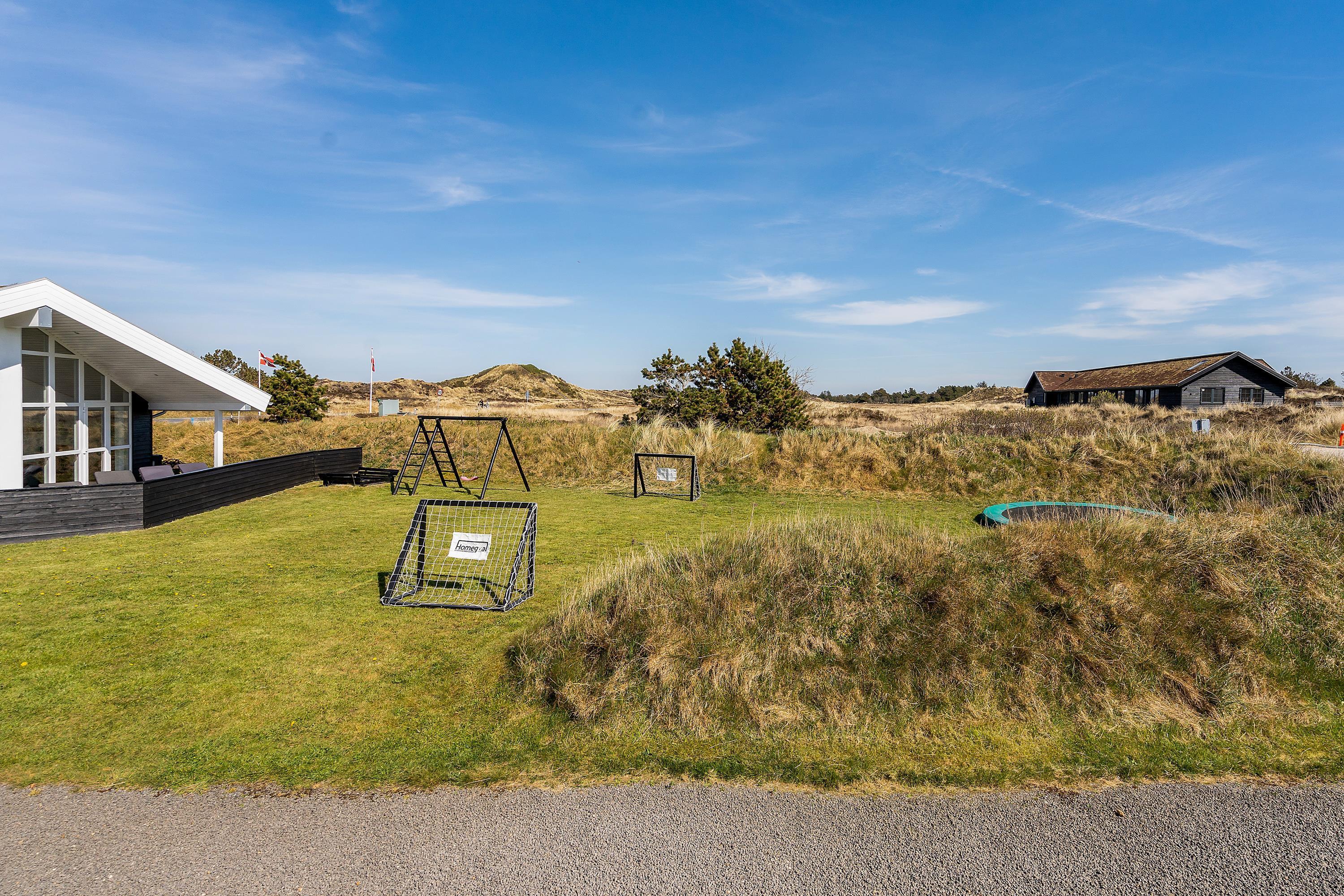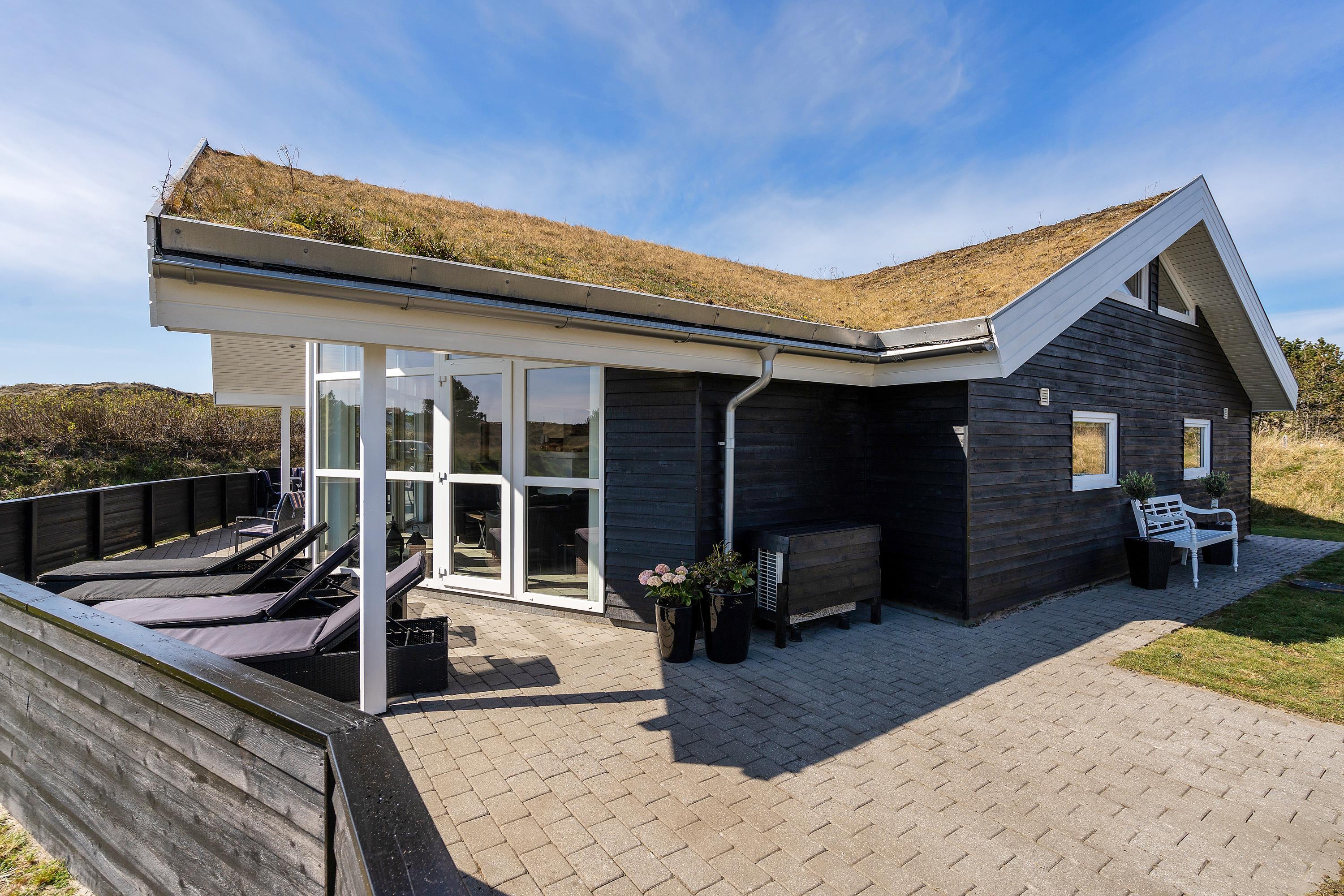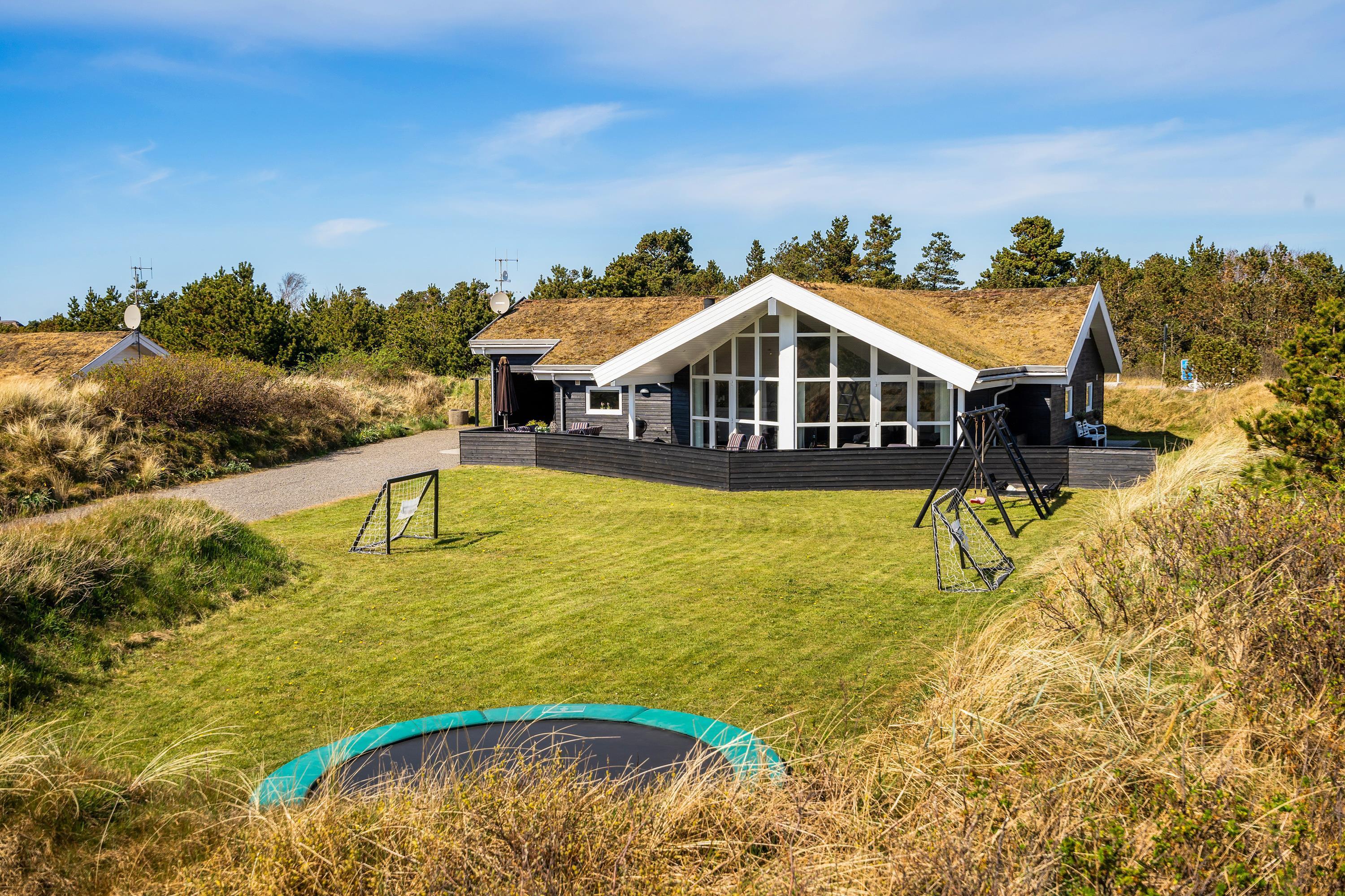 Rundt om det smukke sorte feriehus med græstag snor en stor lækkert terrasse sig. Her er masser af plads og de passende møbler til at dase i solen eller samles til en lækker grillet middag. Den store grund er beskyttet med et dige, og her kan der leges. En trampolin, et par fodboldmål og et gyngestativ sørger for, at børnene aldrig keder sig.
