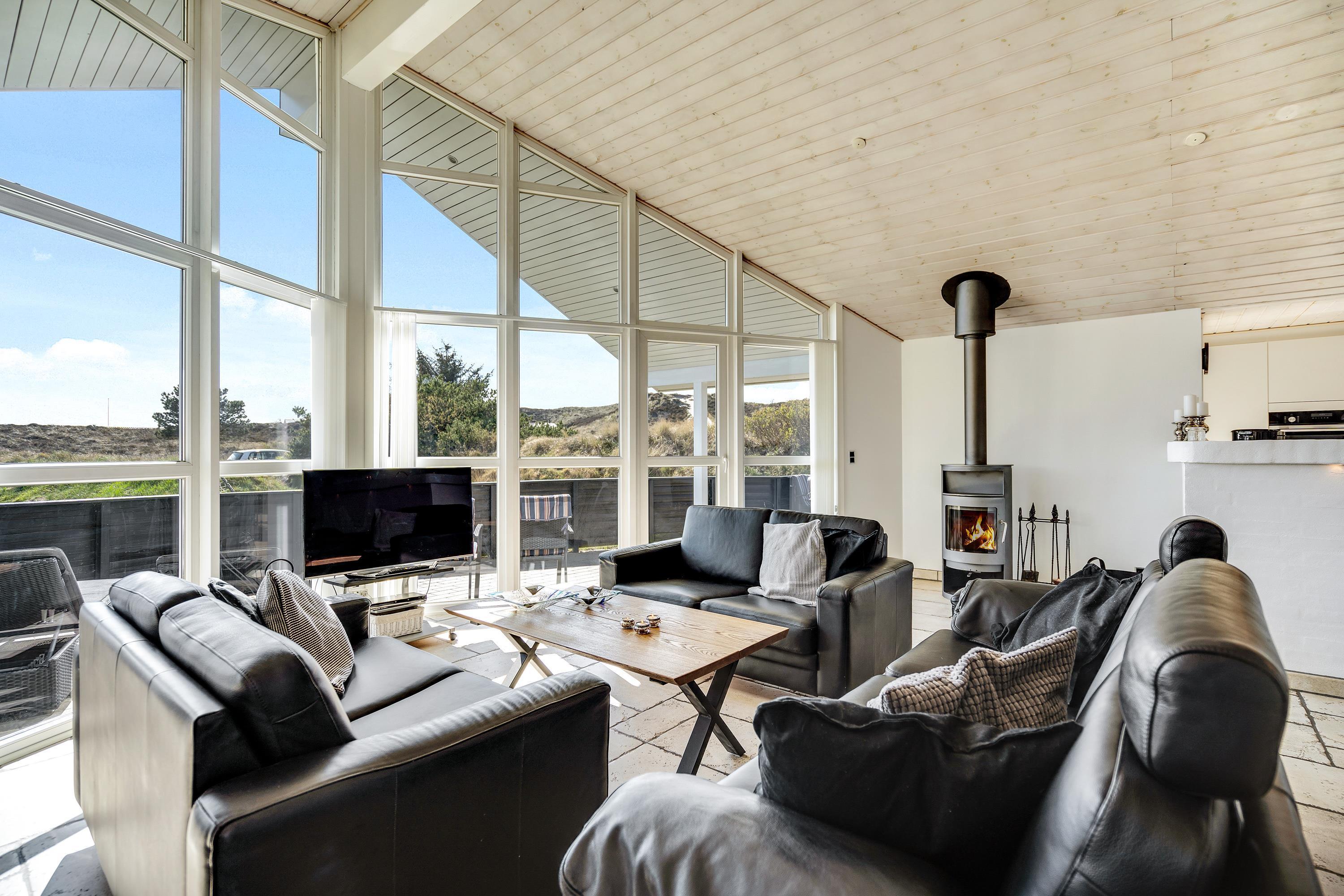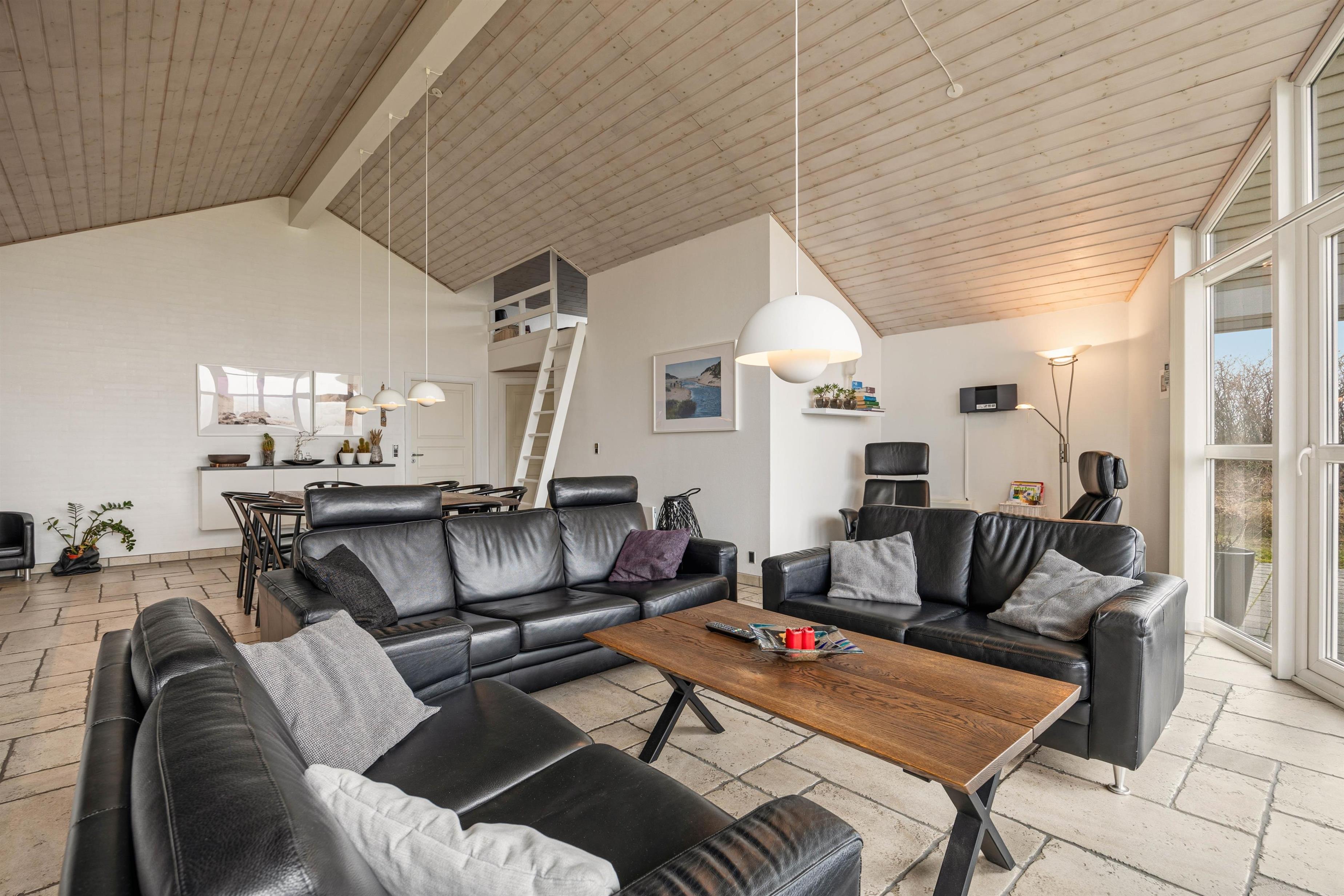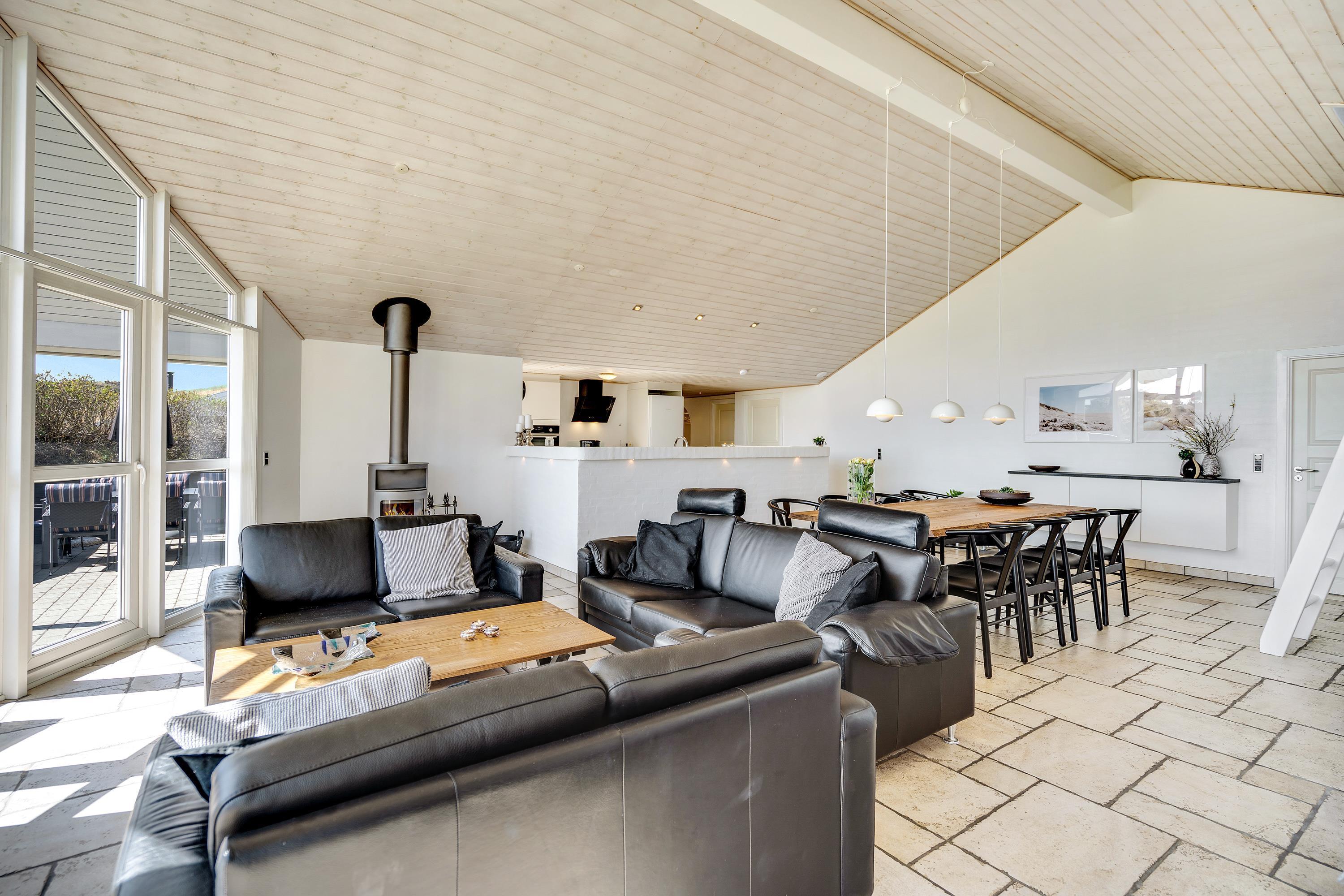 Køkkenet, der er stort, flot og moderne, indbyder til fælles madlavning. Efterfølgende kan der slappes af i de bekvemme møbler i stue-alrummet – hvor især de to lænestole er perfekte til at trække sig tilbage med den nyeste krimi eller avisen og lidt lækkert til ganen.