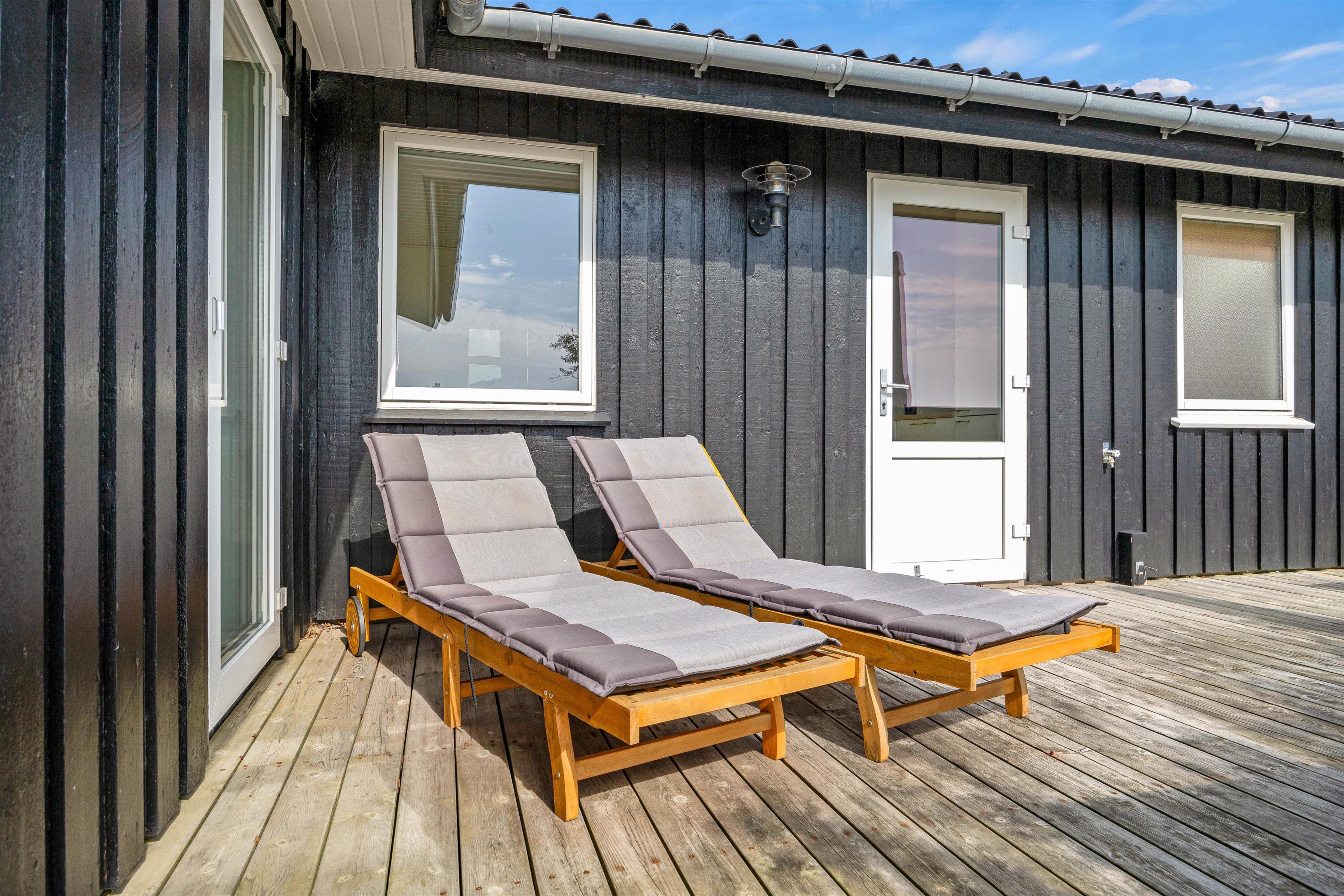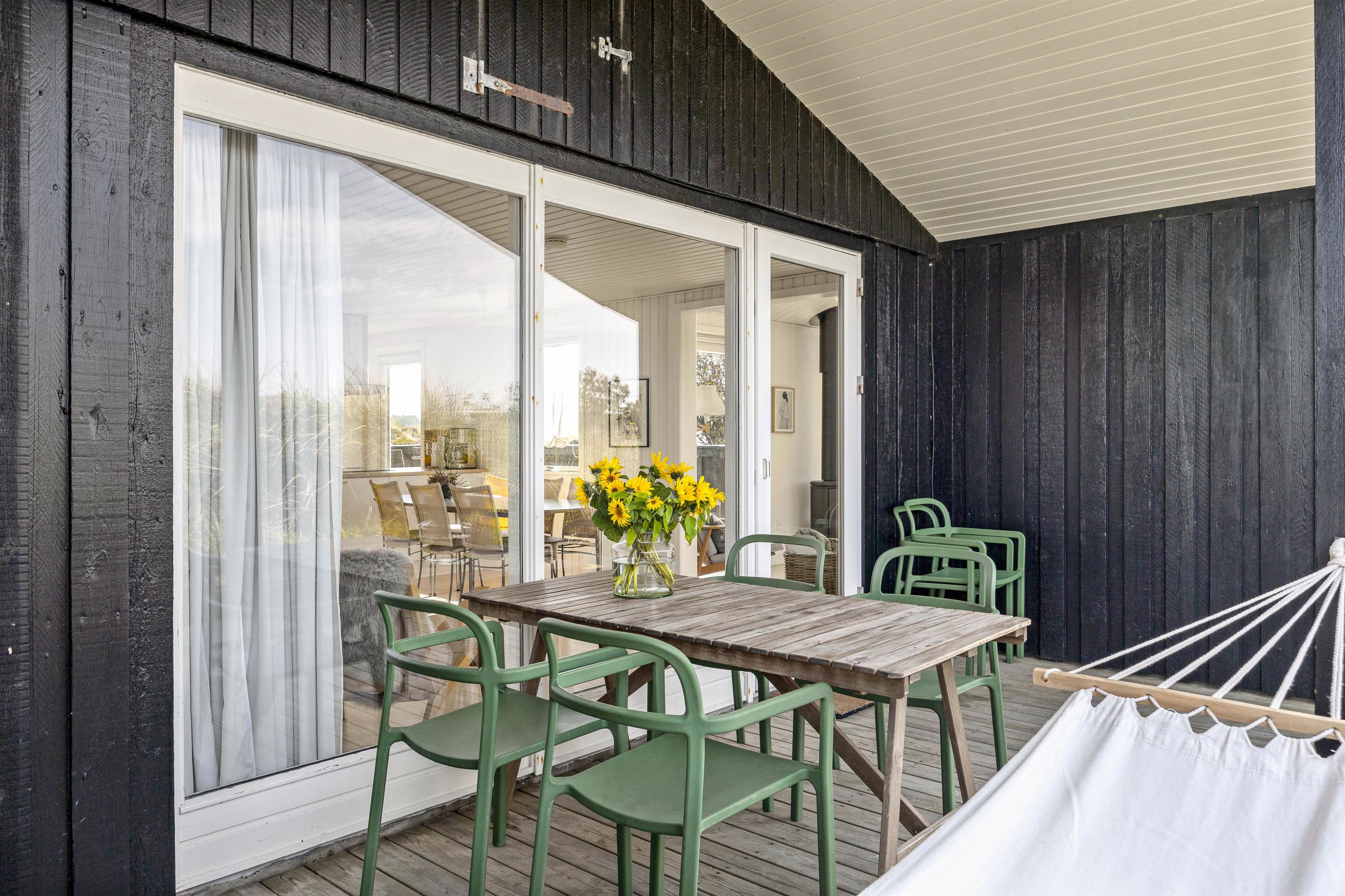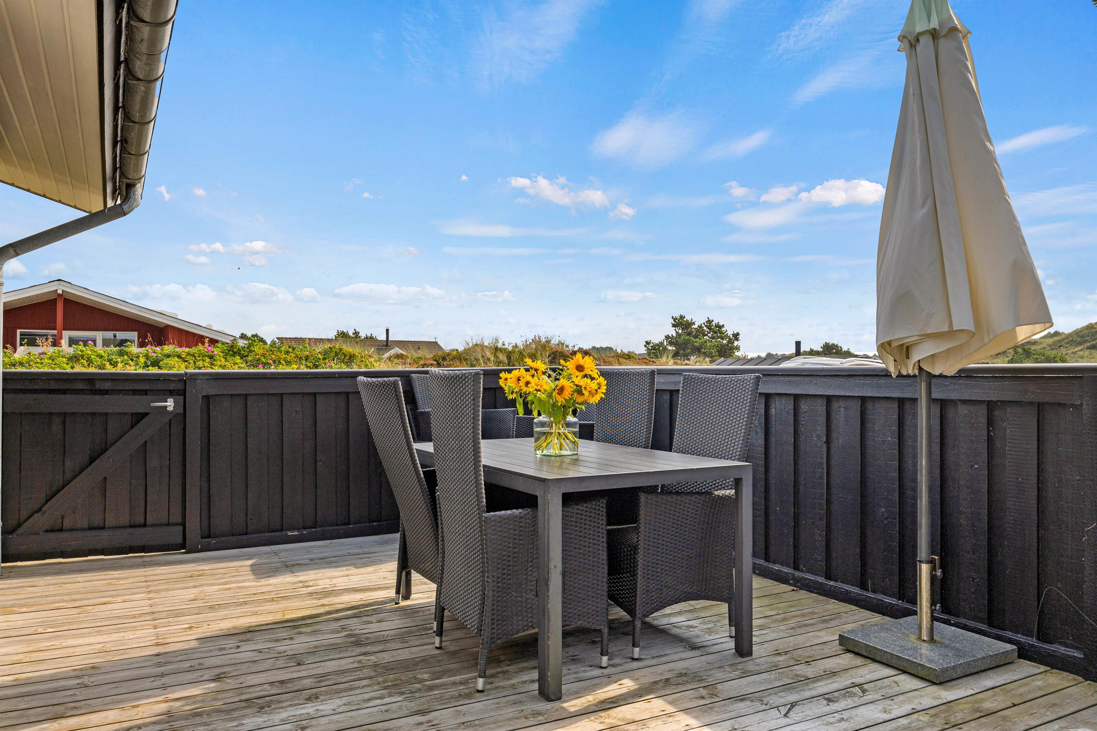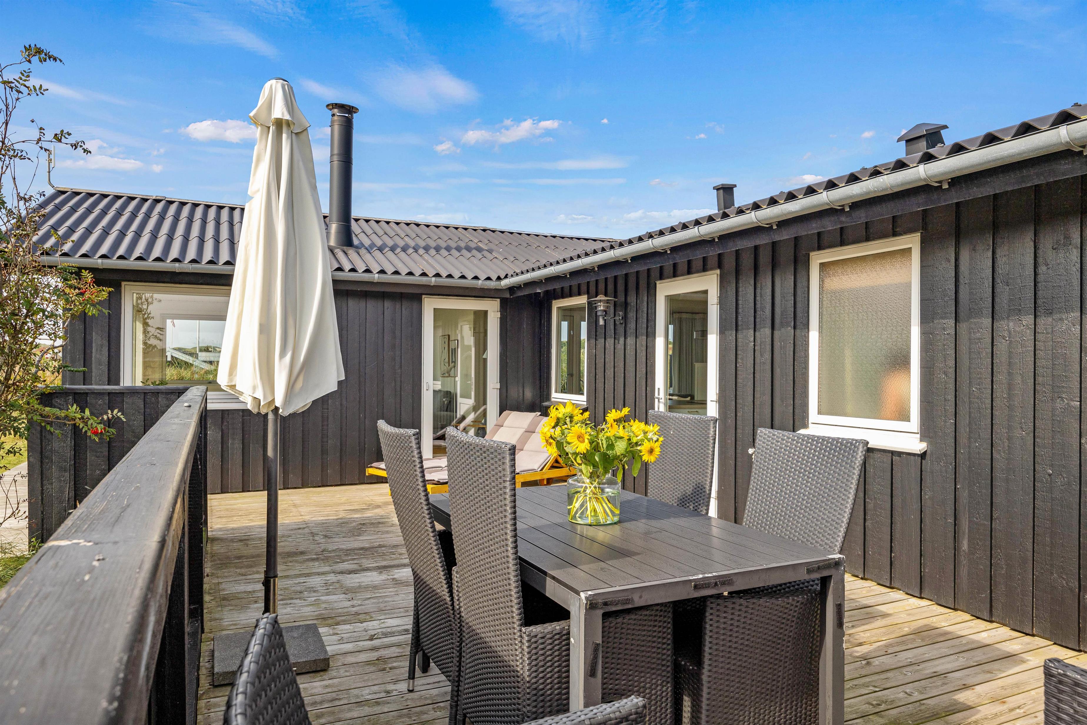 Også udenfor findes der nogle dejlige hjørner, hvor I kan nyde ferien. Om sommerhuset finder I en stor, afskærmet træterrasse mod syd samt en overdækket terrasse mod vest. På den måde har I mulighed for at nyde flest mulige solskinstimer. Havemøblerne står allerede klar til jer.