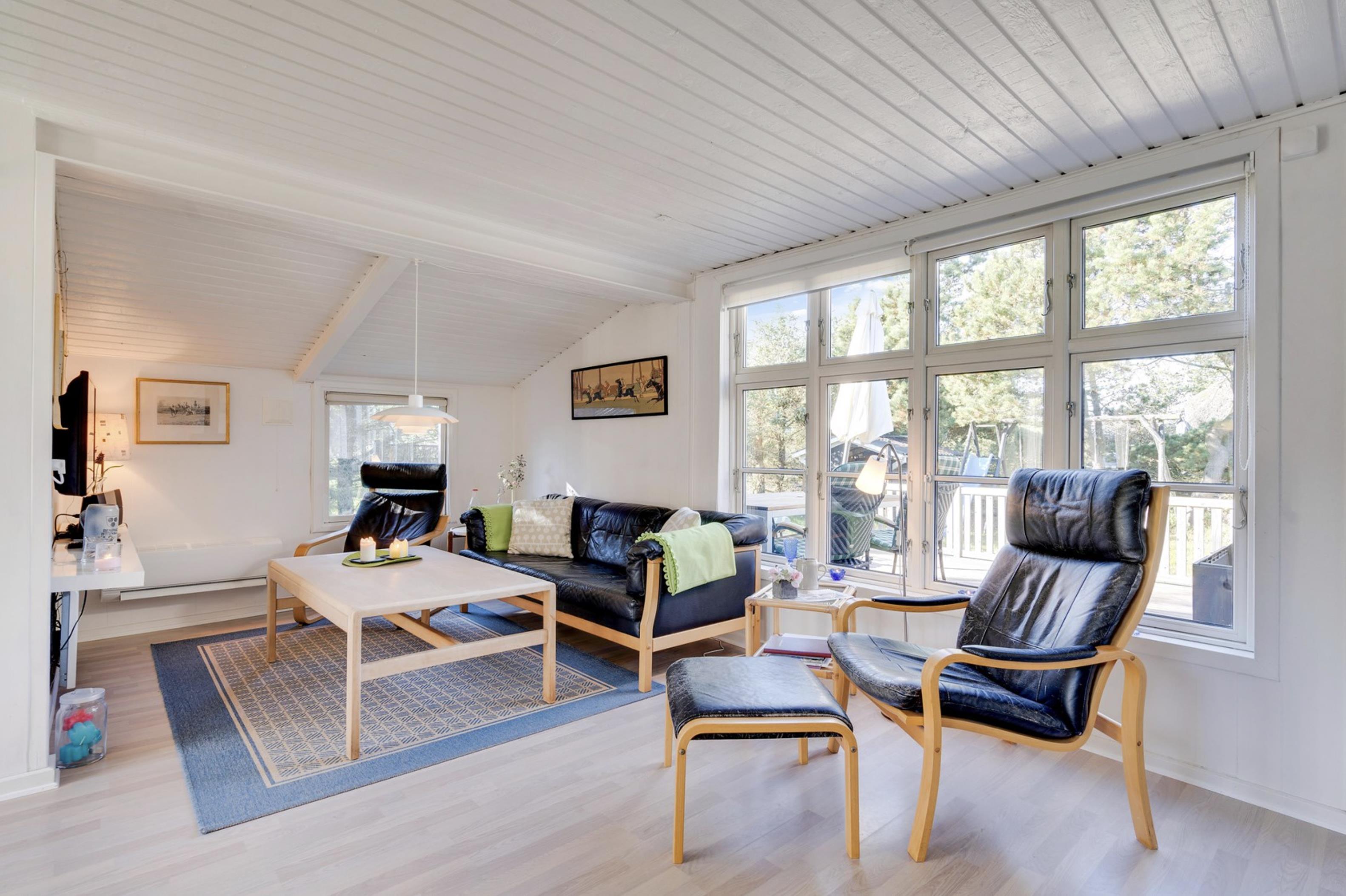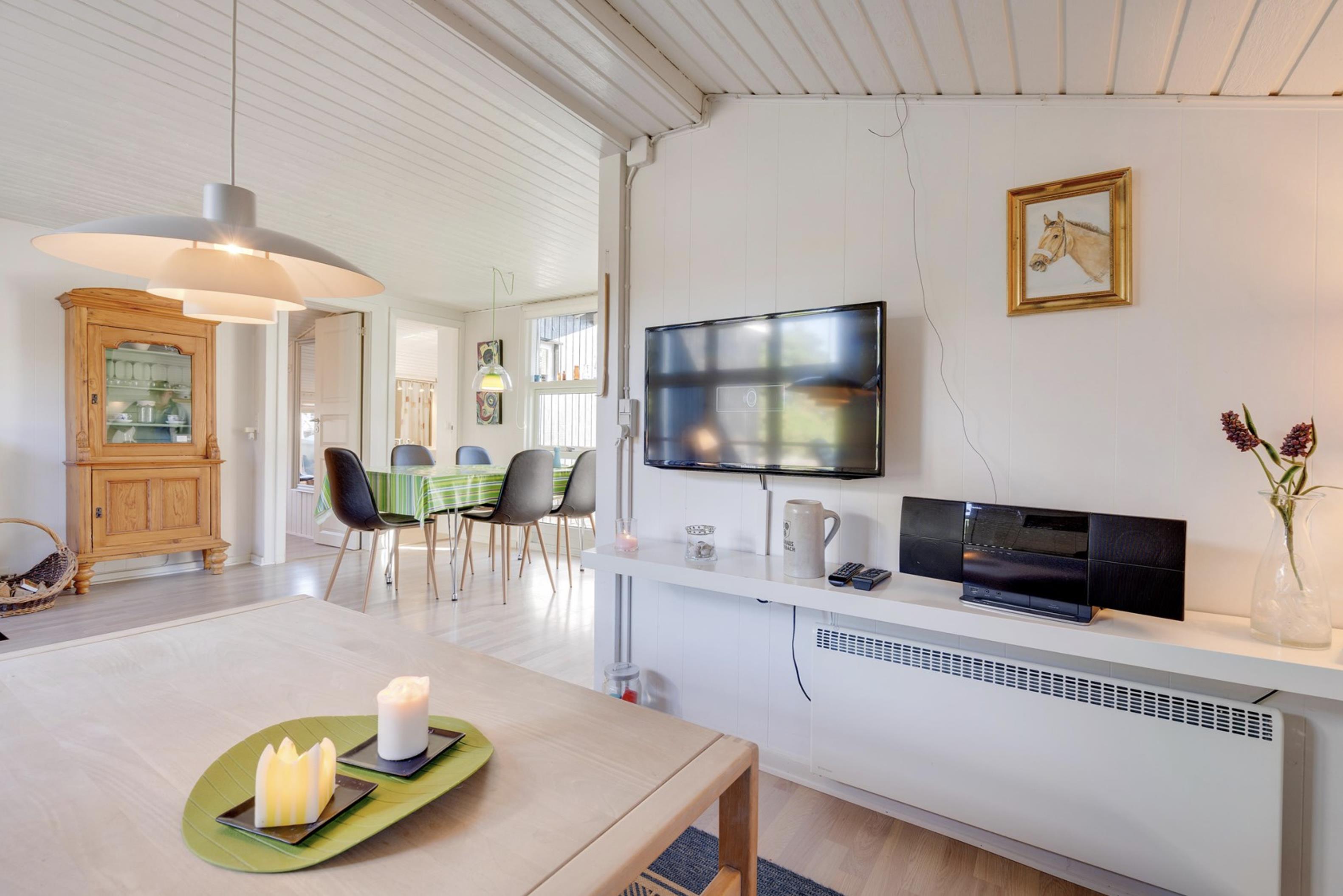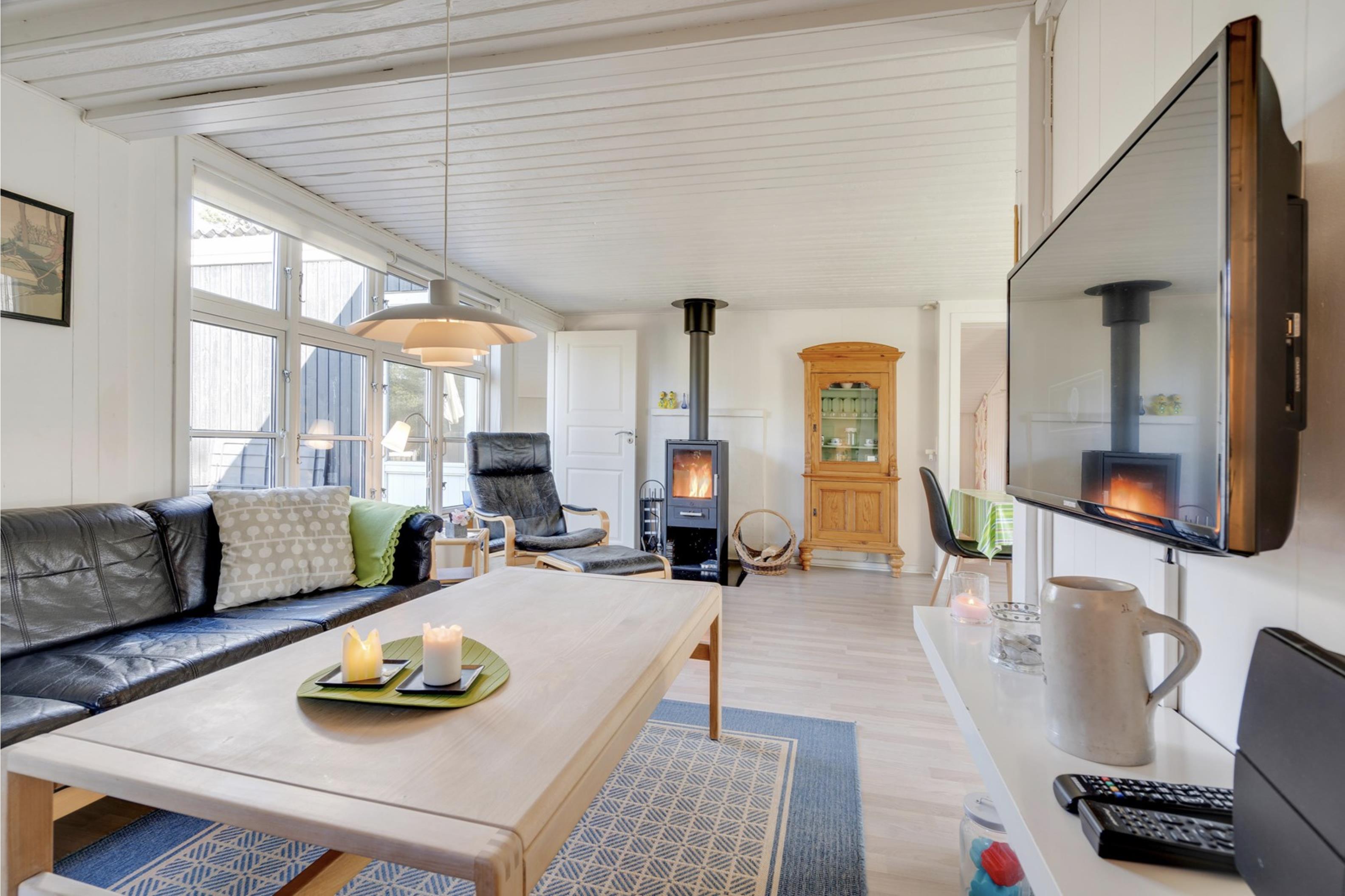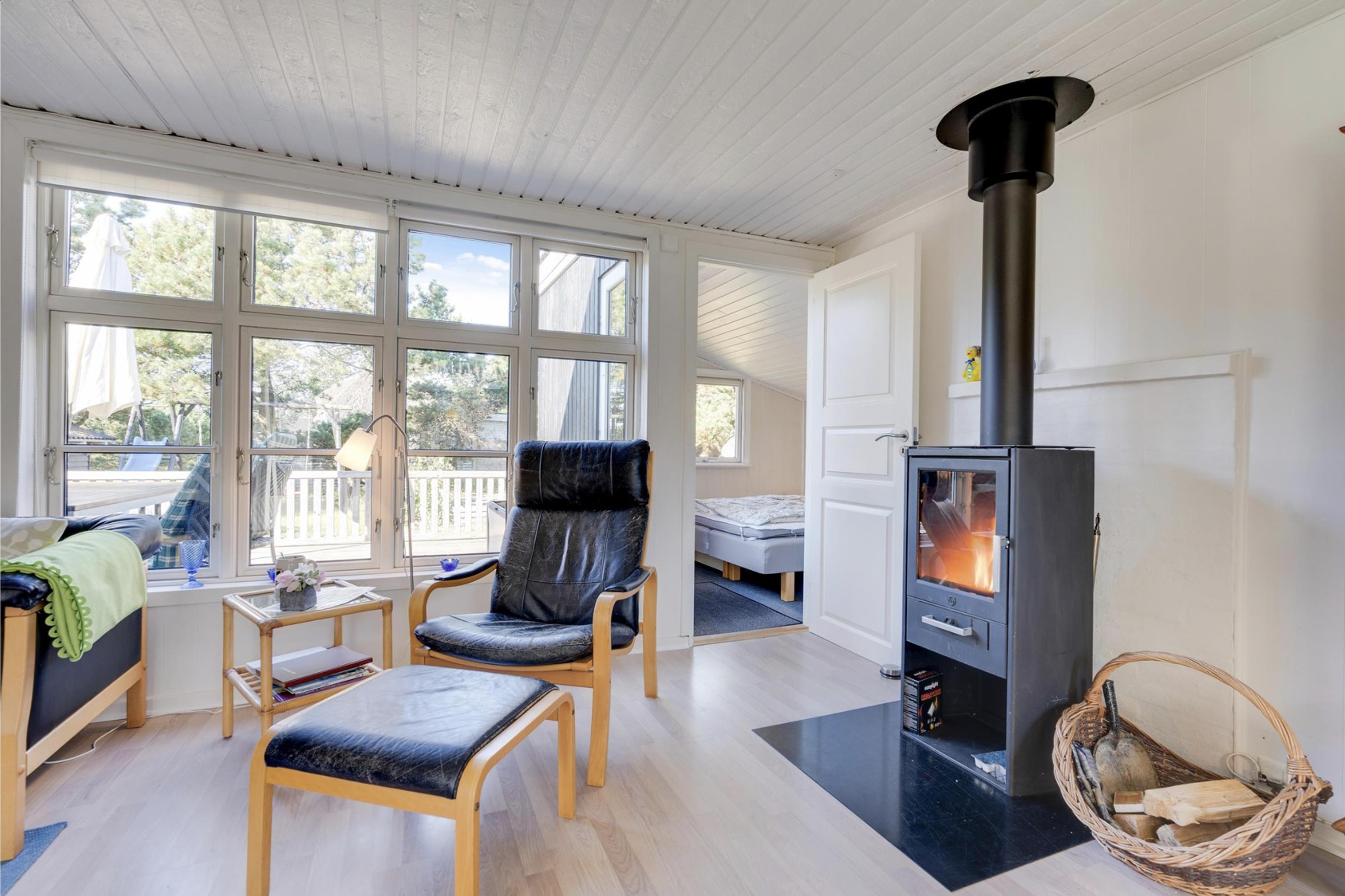 Sommerhusets lyse og moderne indretning gør, at I straks vil føle jer godt tilpas. Den lyse og velindrettede stue ligger i forlængelse af den fine spisestue. Sommerhusets køkken er veludstyret, og her er både opvaskemaskine samt et praktisk køleskab med fryseboks. Den hyggelige pejs vil sprede feriehygge og varme, i huset.