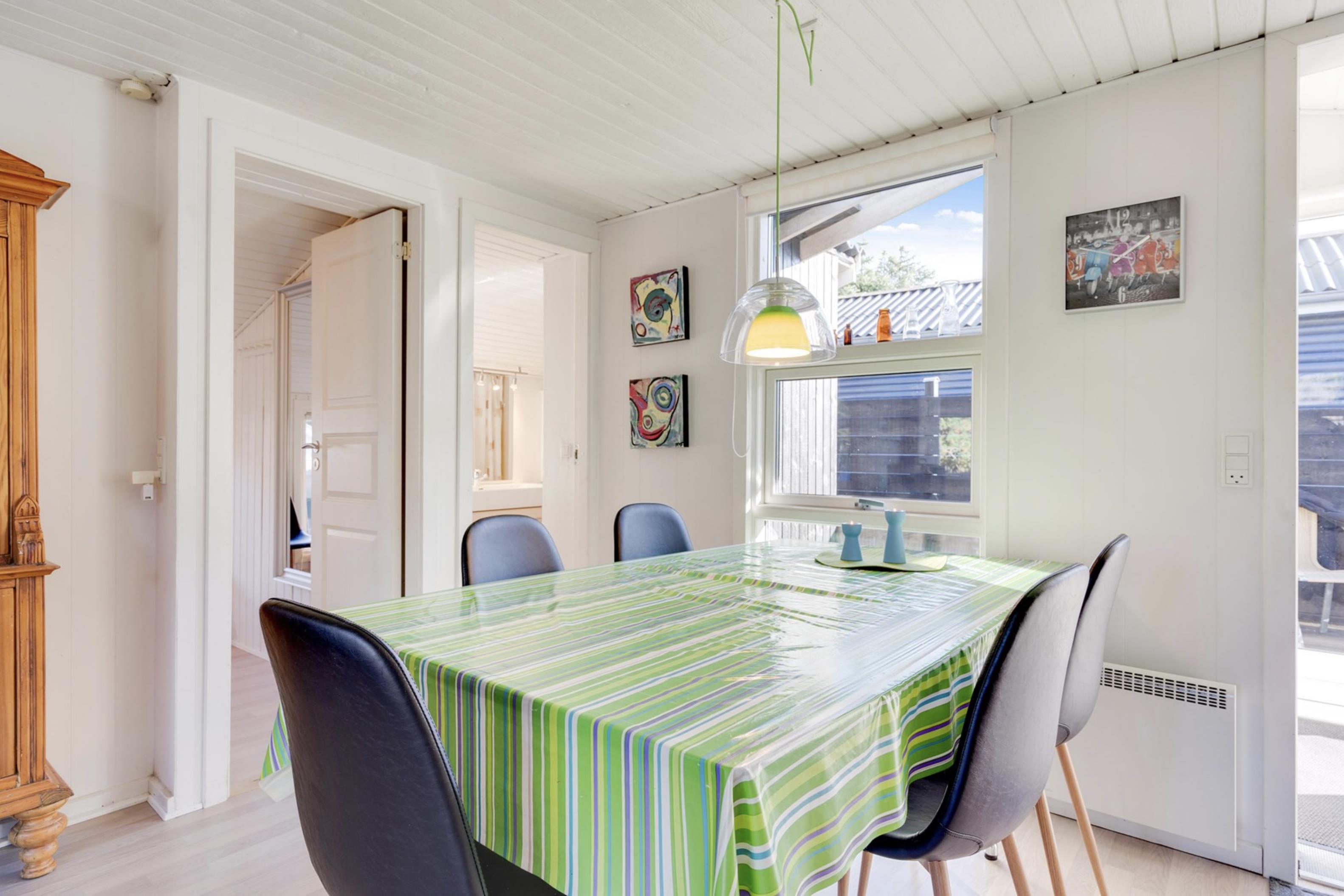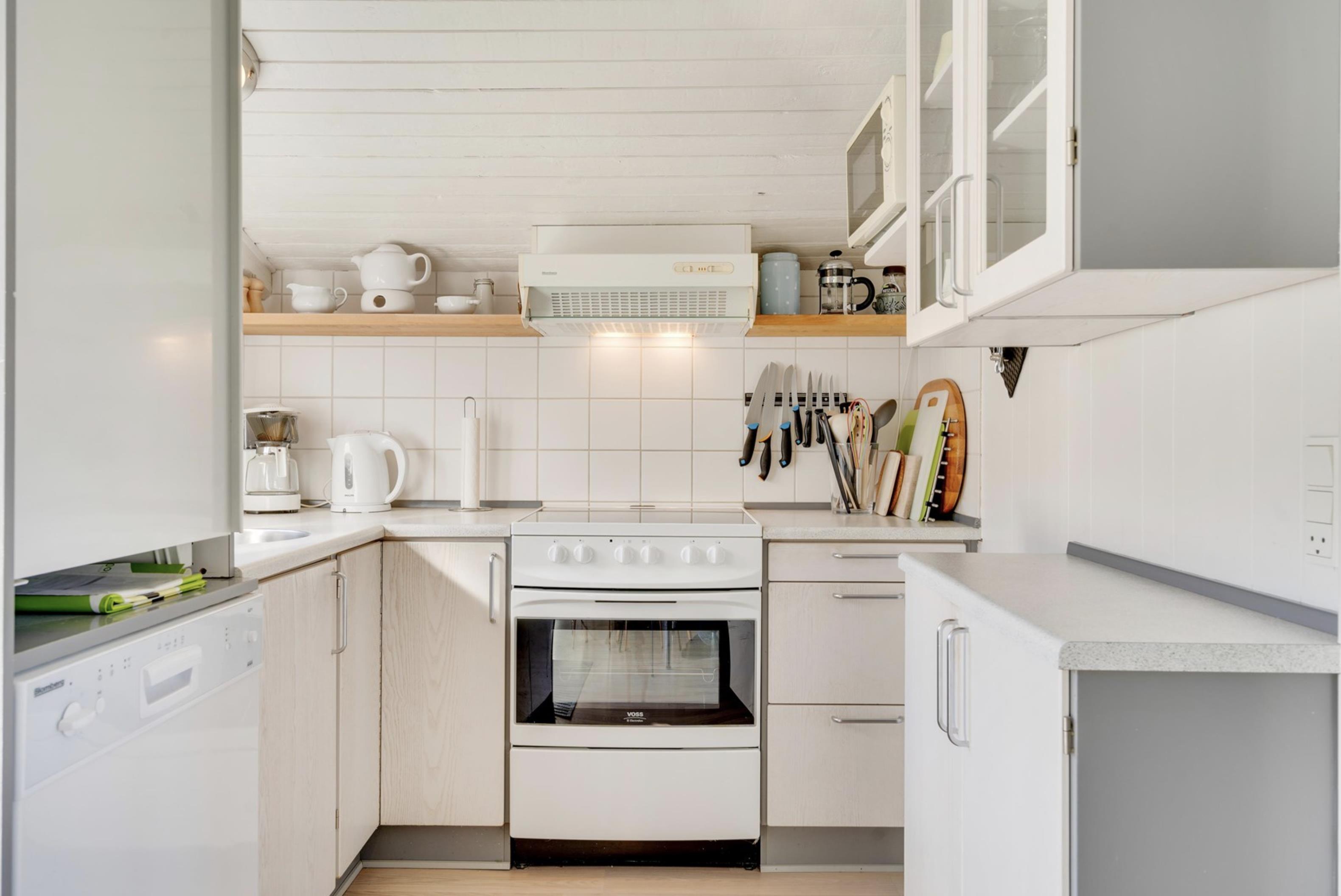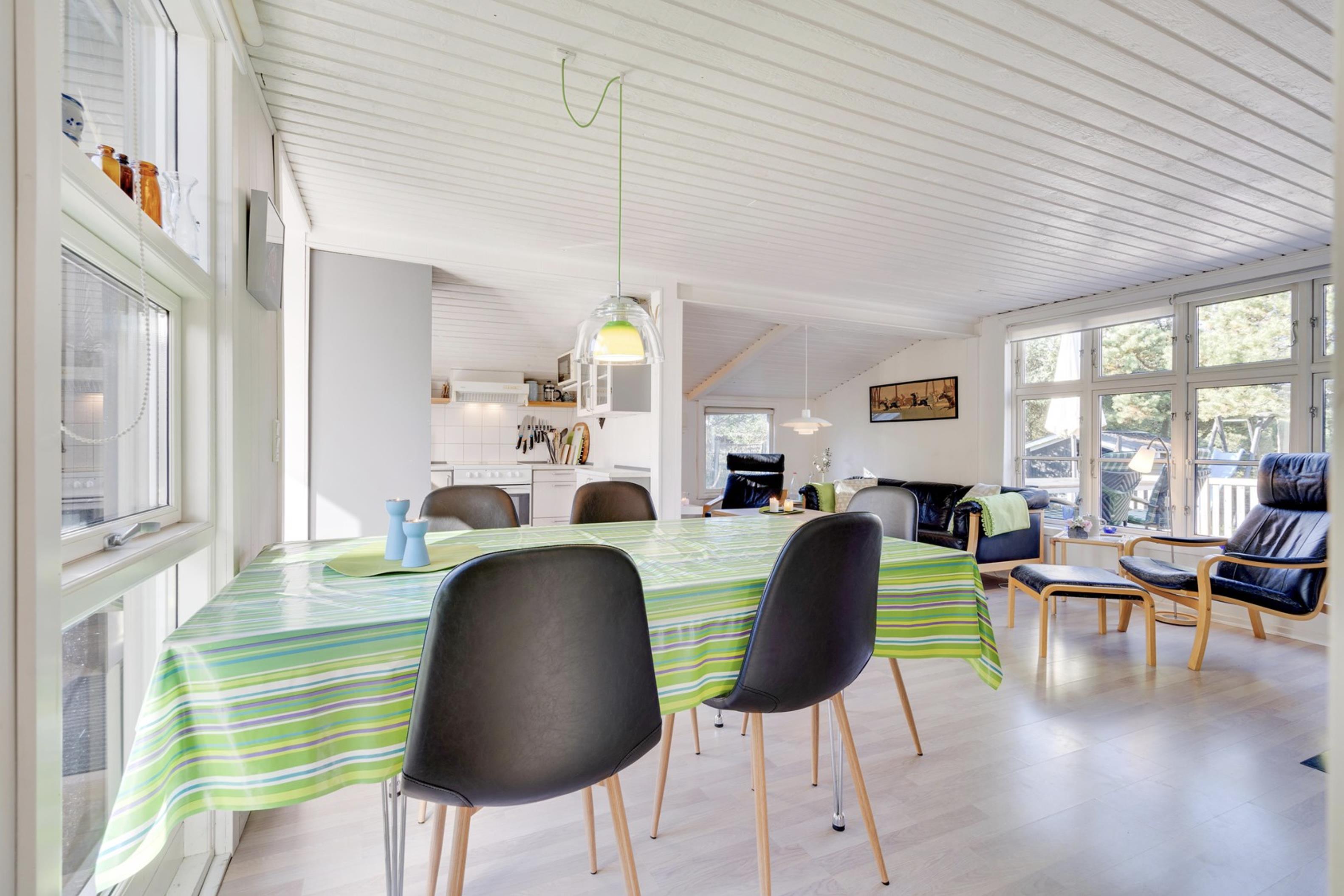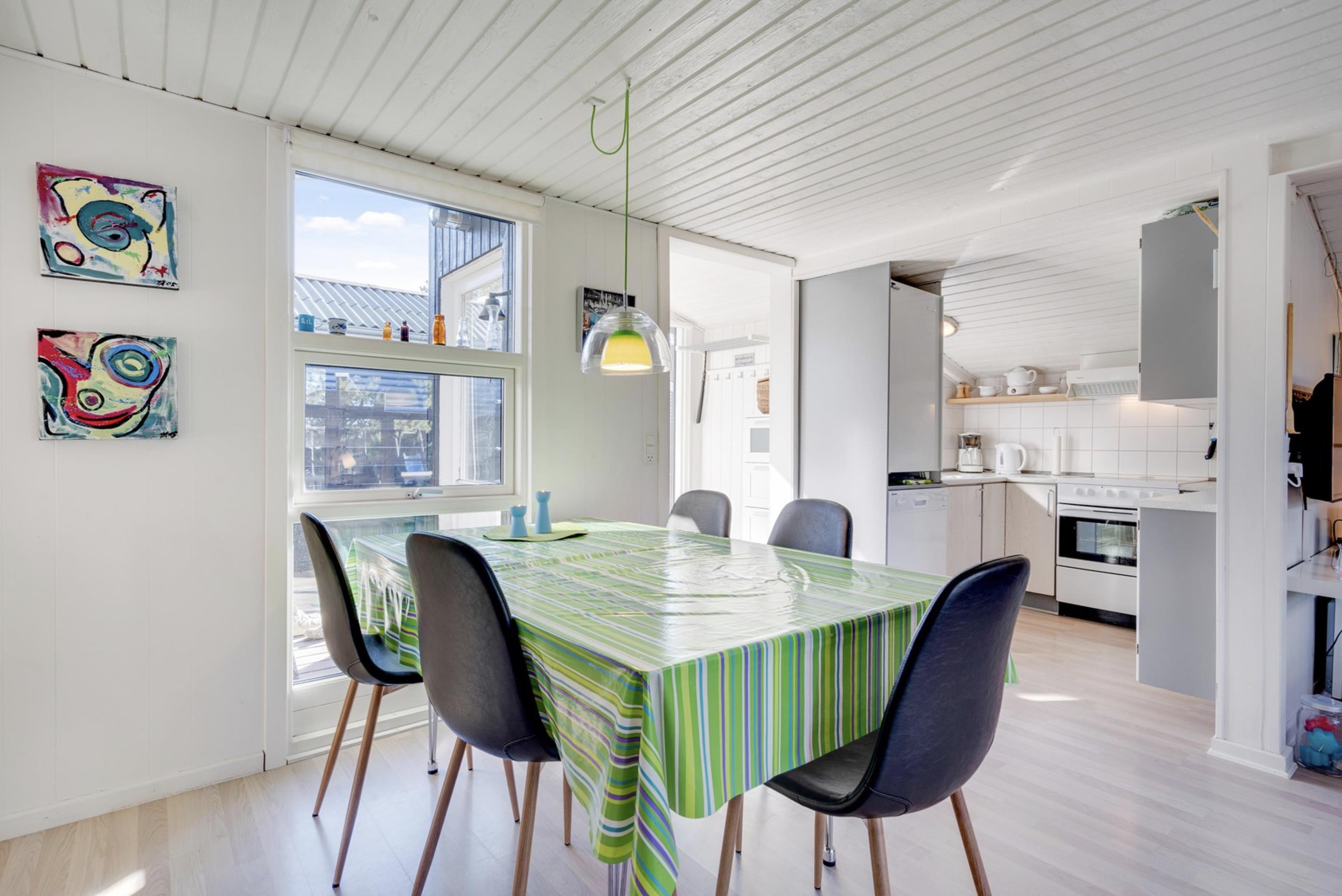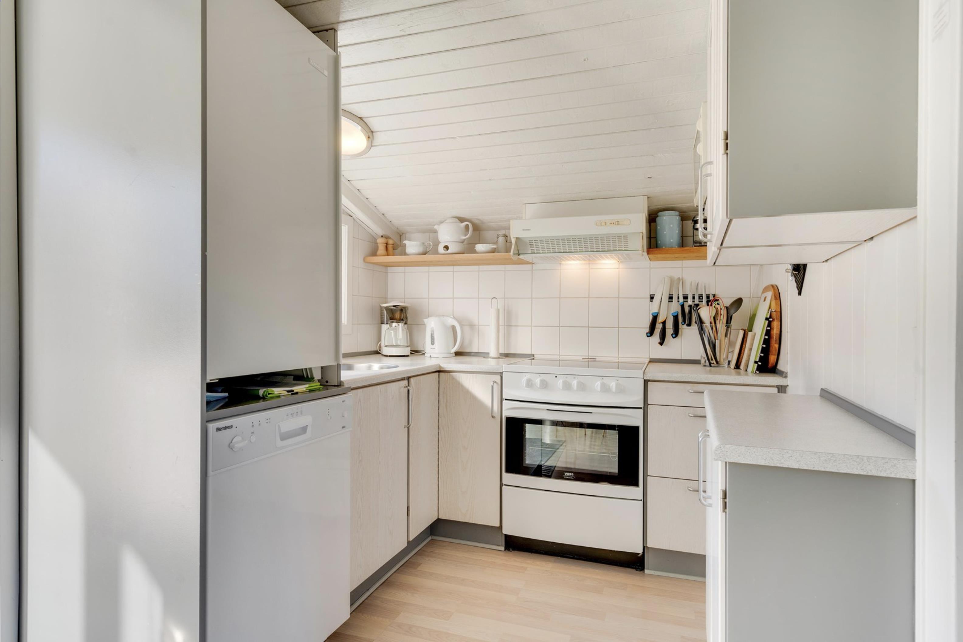 Sommerhusets lyse og moderne indretning gør, at I straks vil føle jer godt tilpas. Den lyse og velindrettede stue ligger i forlængelse af den fine spisestue. Sommerhusets køkken er veludstyret, og her er både opvaskemaskine samt et praktisk køleskab med fryseboks. Den hyggelige pejs vil sprede feriehygge og varme, i huset.