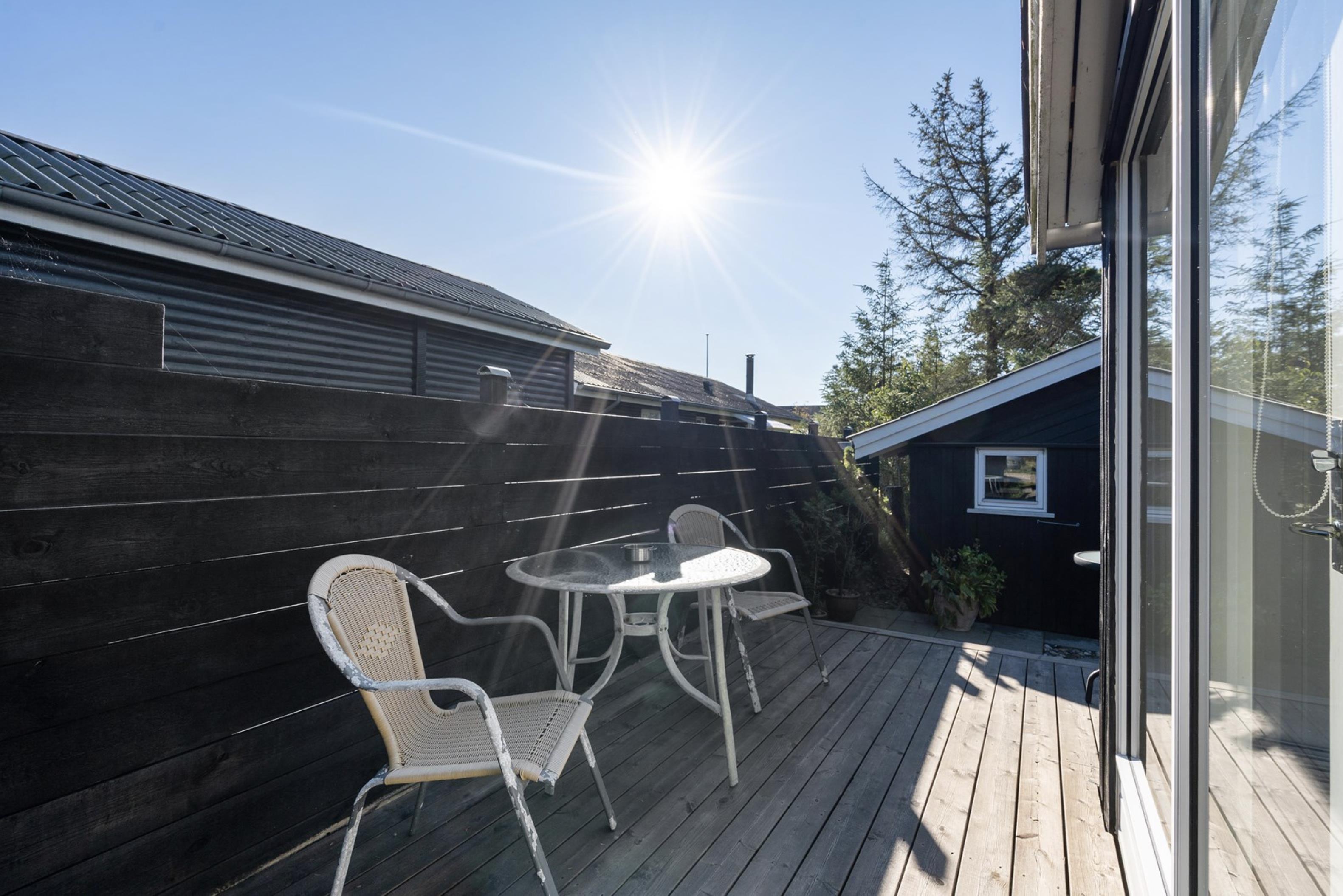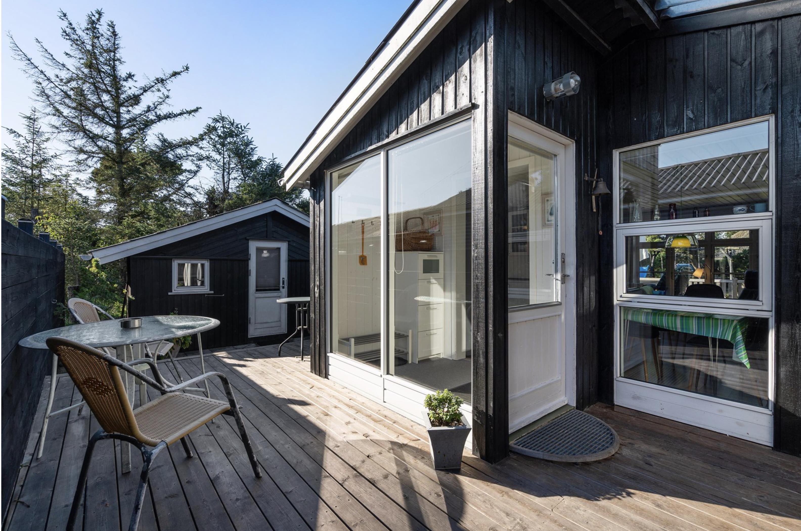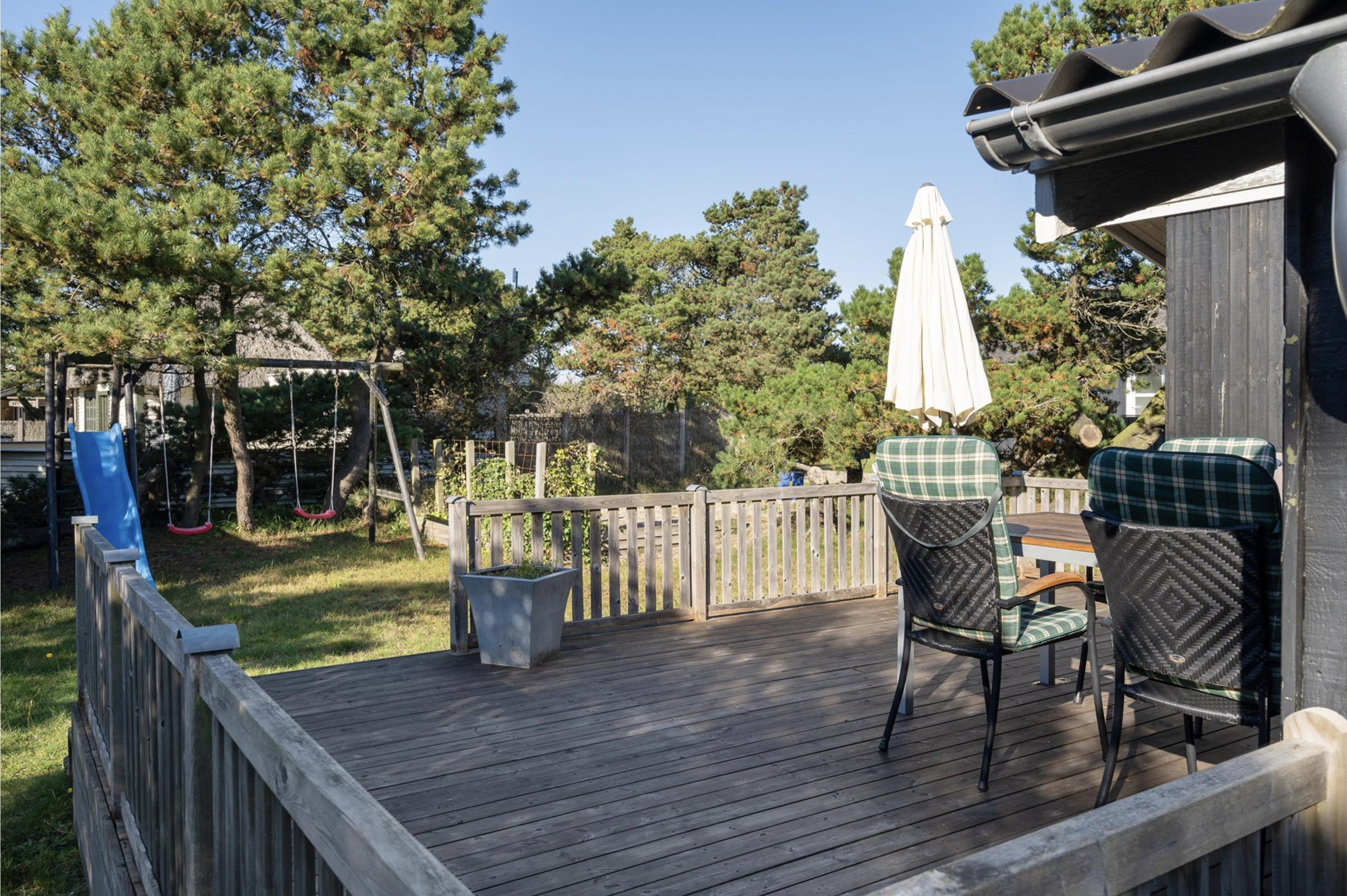 Fra stuen er der mulighed for at træde ud på den skønne sydvendte terrasse, hvor I om morgenen kan starte jeres feriedage med nybagte rundstykker og friskbrygget kaffe. Mens dagen går, kan I flytte til de komfortable havestole, der står til rådighed på de andre terrasser rundt omkring dette skønne sommerhus. Og imens de voksne nyder den friske (hav)luft fra terrassen, kan de små hygge sig med gyngerne, rutsjebanen og sandkassen, der er placeret i den ene ende af sommerhusets naturgrund.