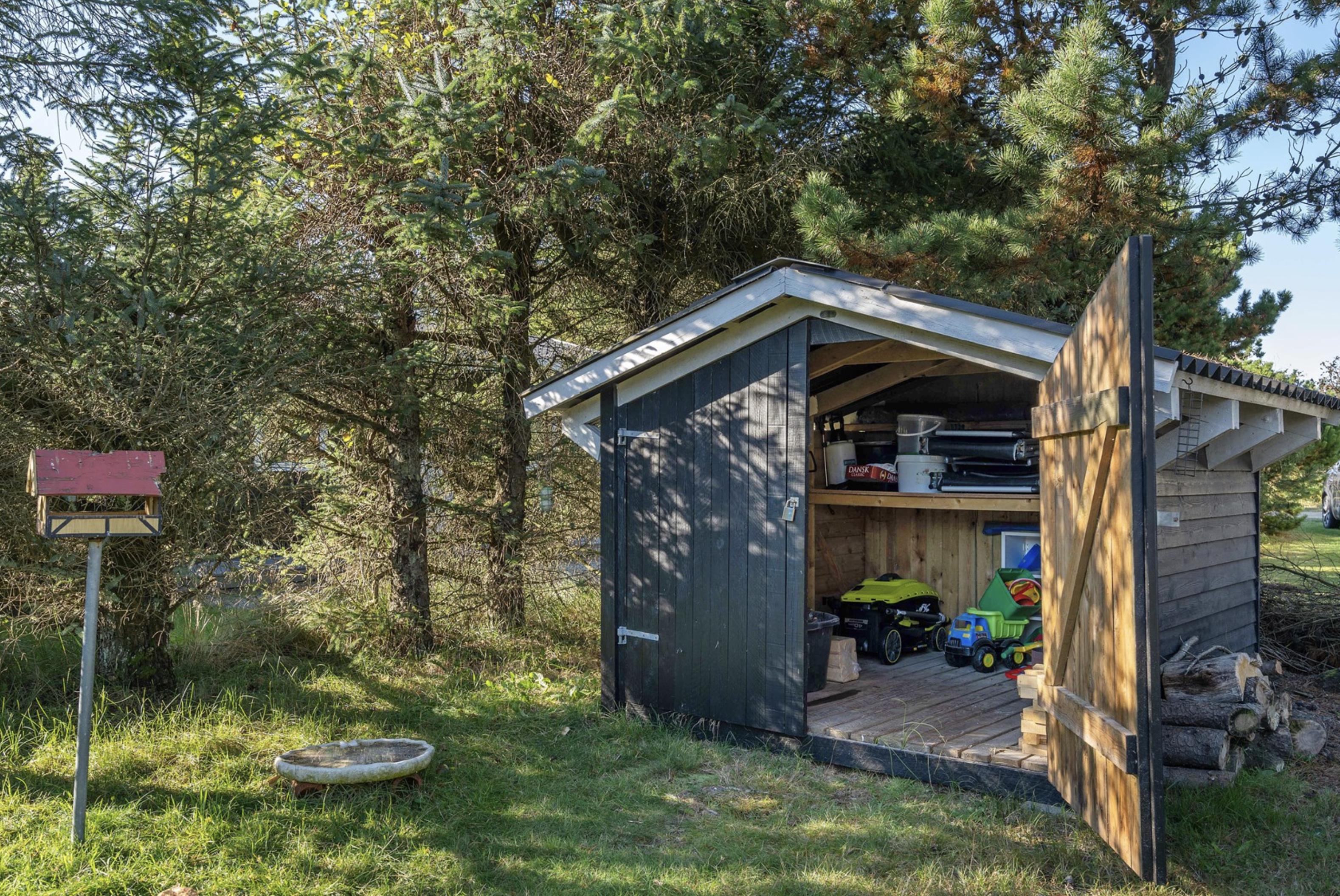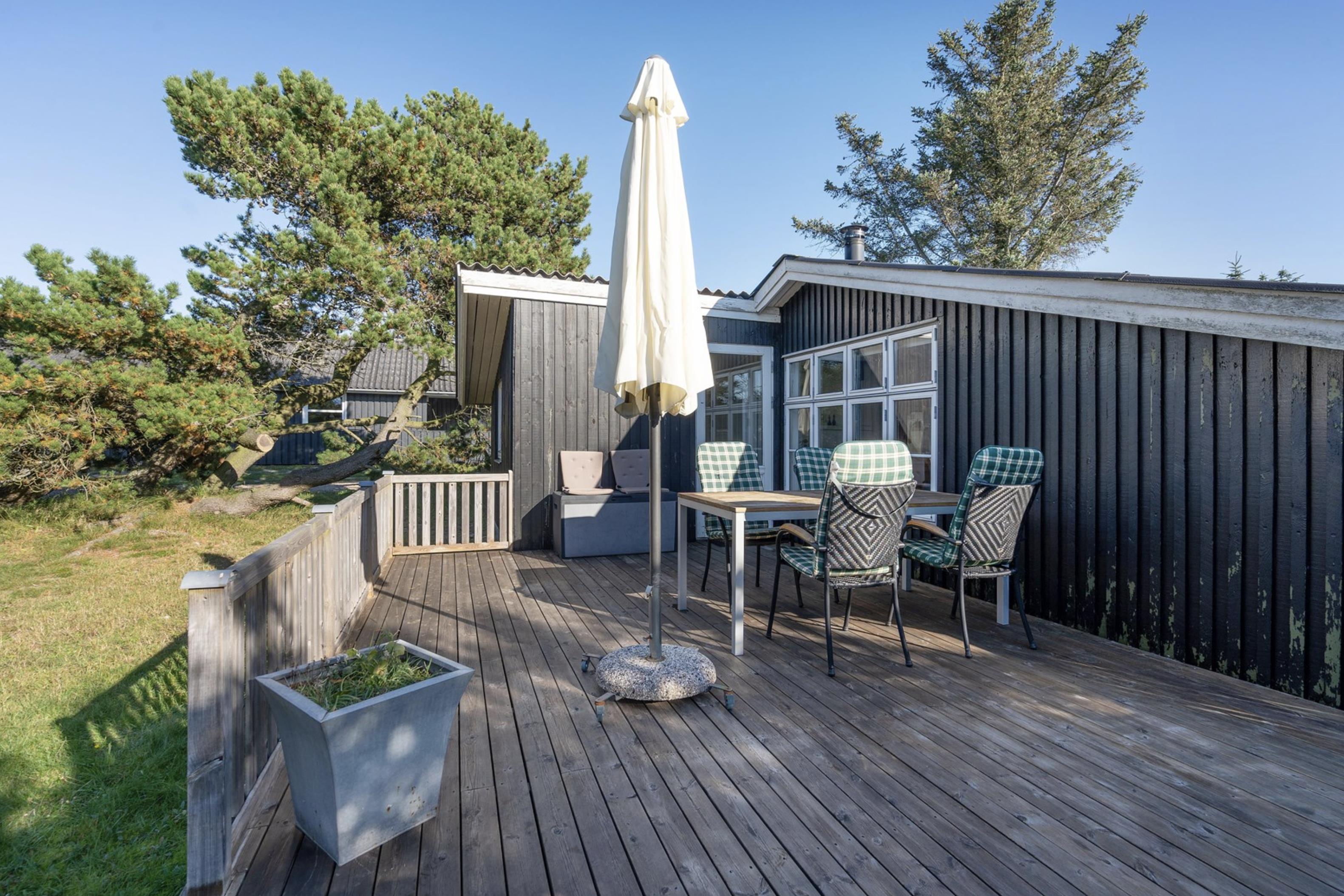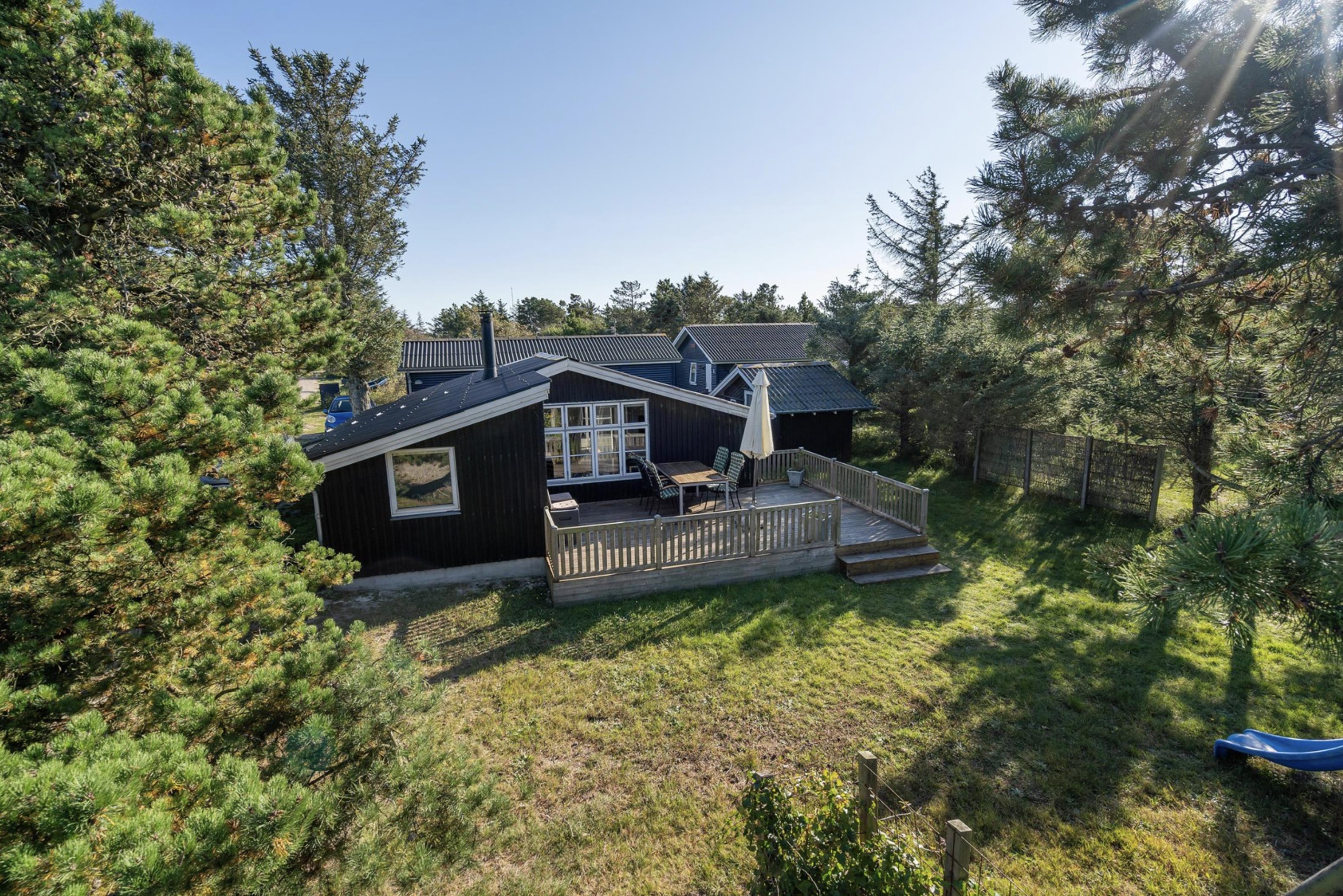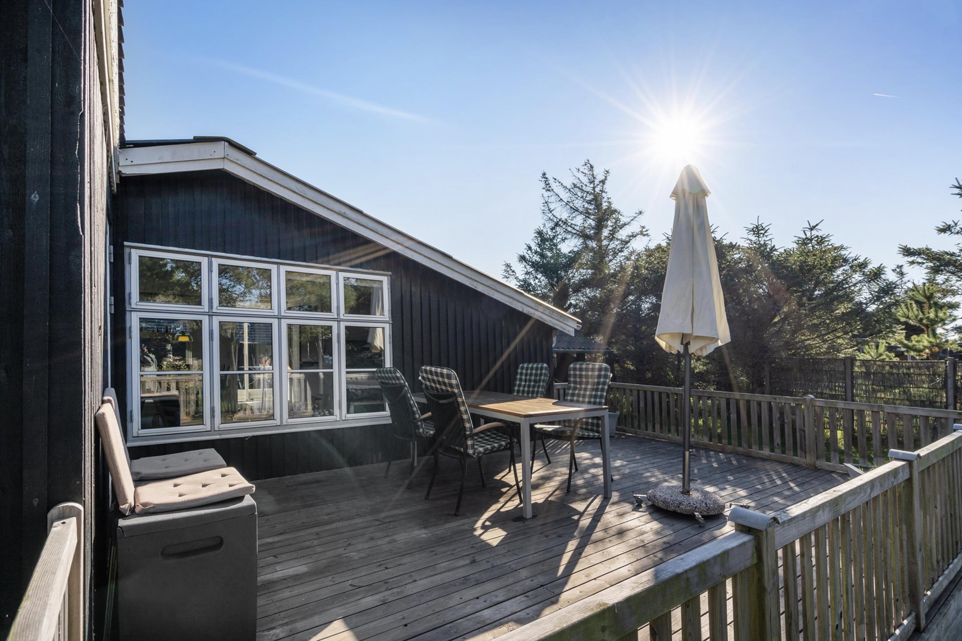 Fra stuen er der mulighed for at træde ud på den skønne sydvendte terrasse, hvor I om morgenen kan starte jeres feriedage med nybagte rundstykker og friskbrygget kaffe. Mens dagen går, kan I flytte til de komfortable havestole, der står til rådighed på de andre terrasser rundt omkring dette skønne sommerhus. Og imens de voksne nyder den friske (hav)luft fra terrassen, kan de små hygge sig med gyngerne, rutsjebanen og sandkassen, der er placeret i den ene ende af sommerhusets naturgrund.