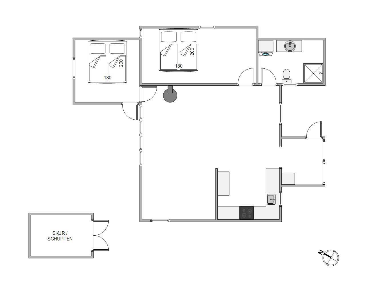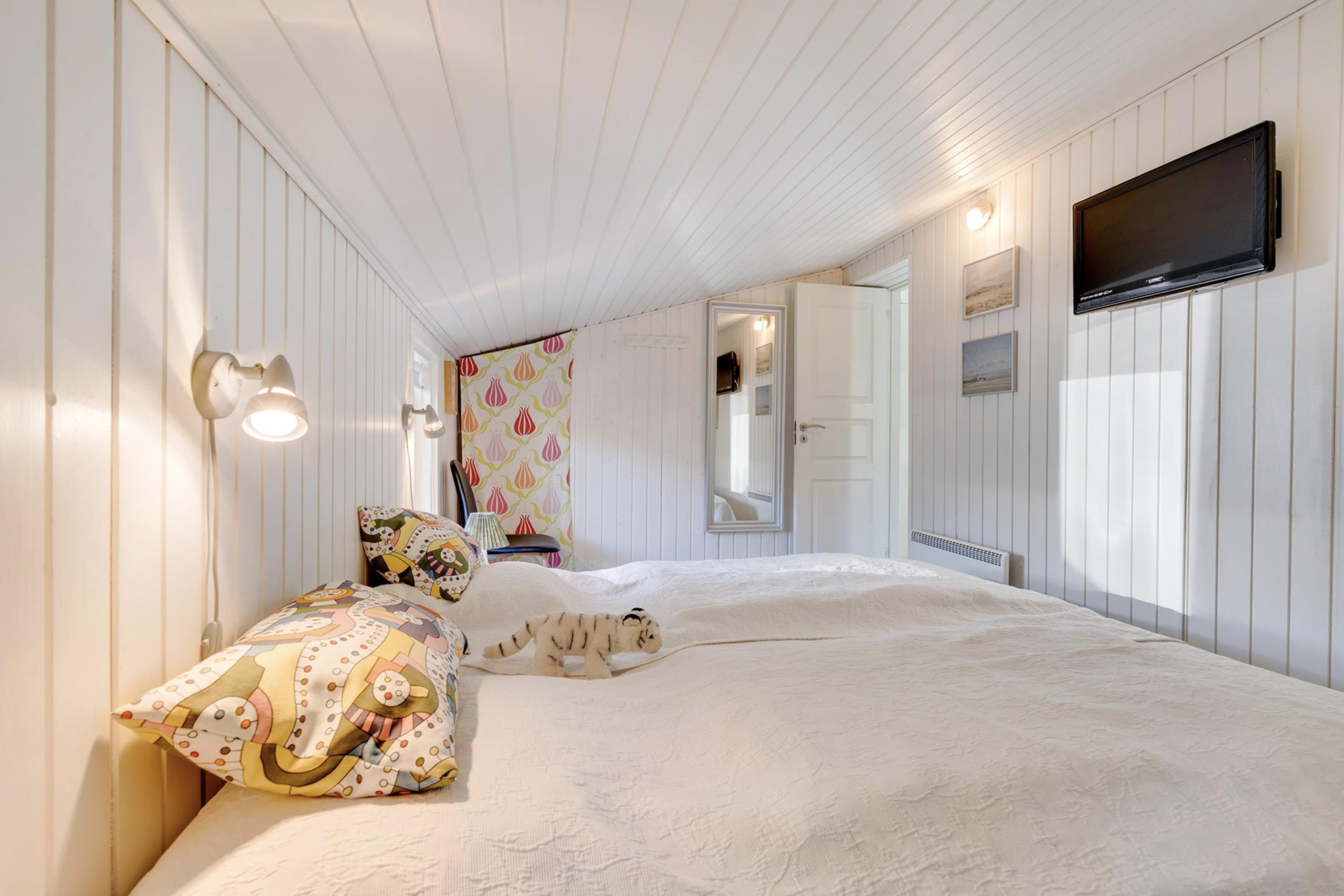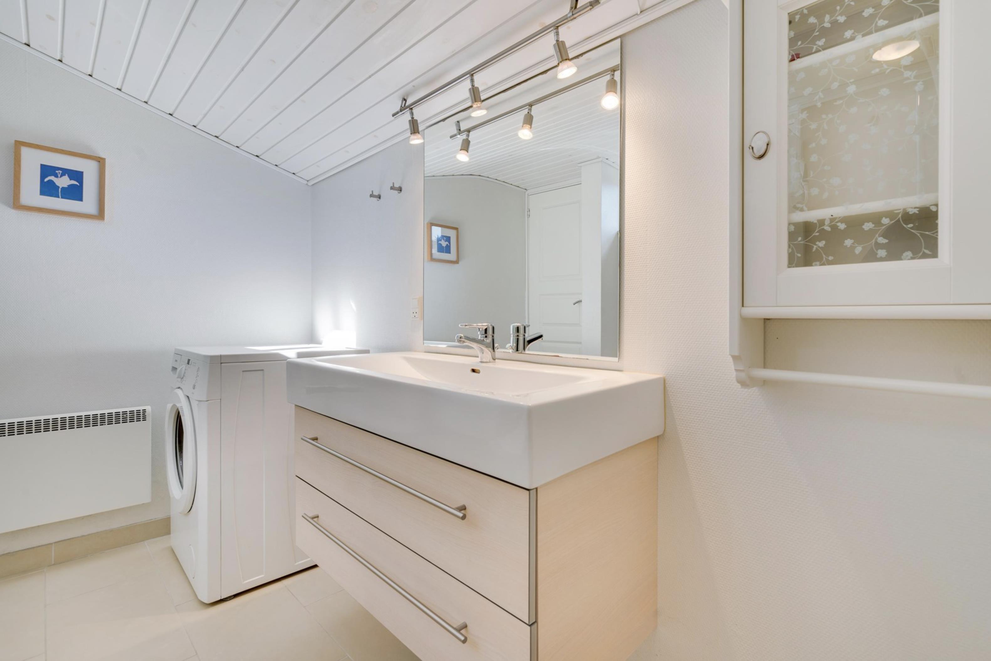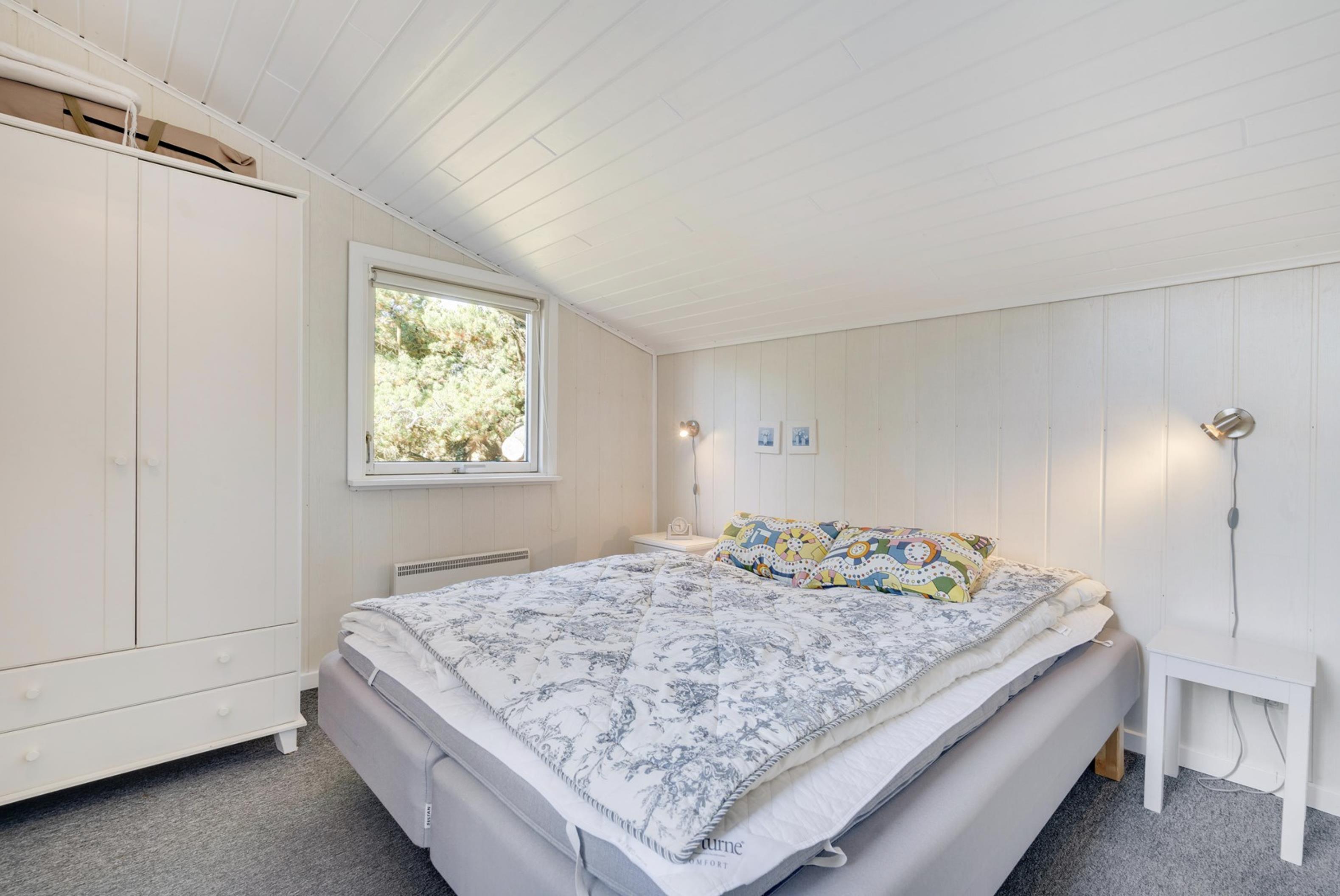 Sommerhuset råder over 2 lyse og rummelige soveværelser, som begge er udstyret med dobbeltsenge. På badeværelset, som har indlagt gulvvarme, befinder sig en vaskemaskine, som kan være jer behjælpelig med jeres ferievasketøj.