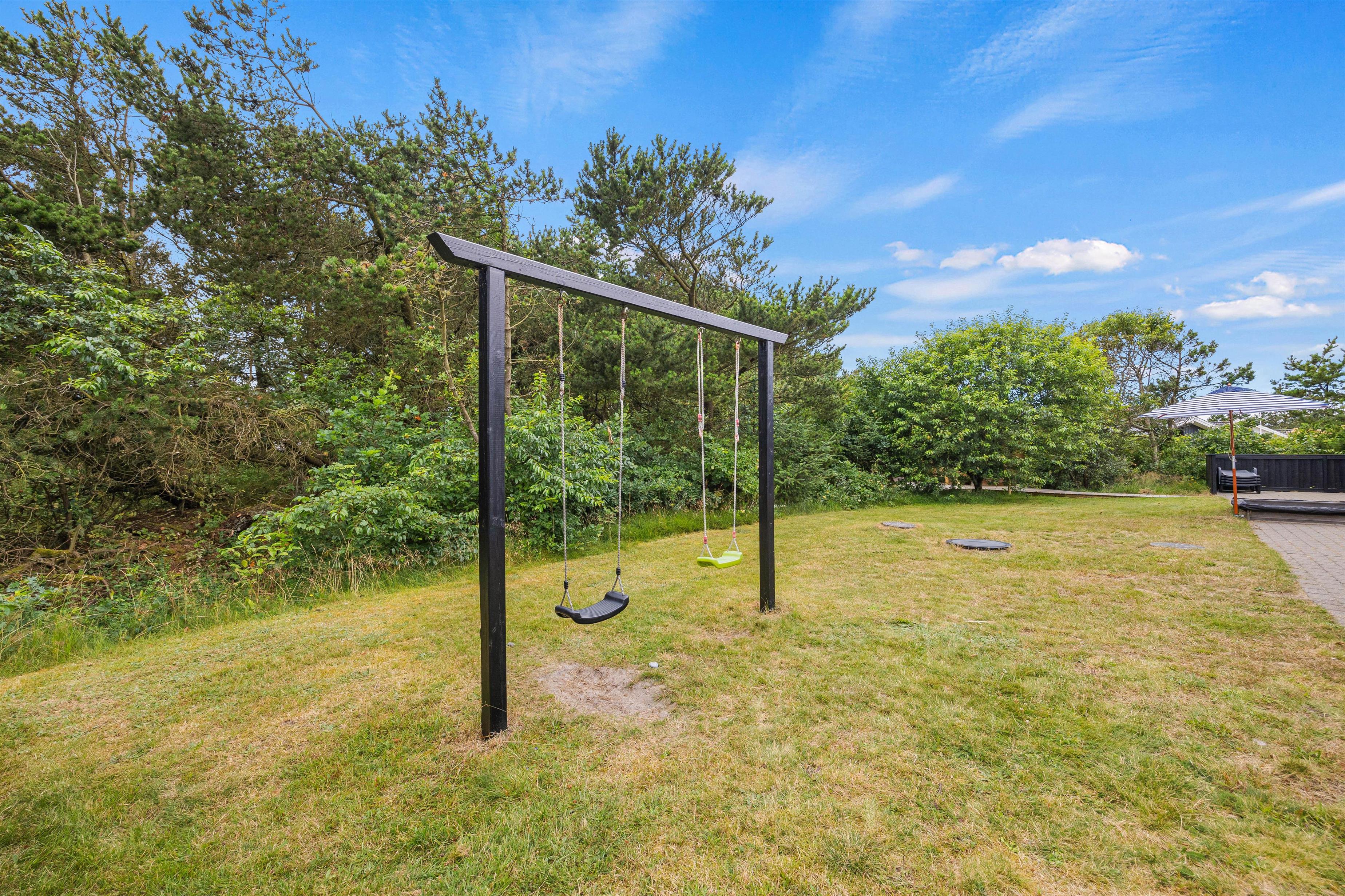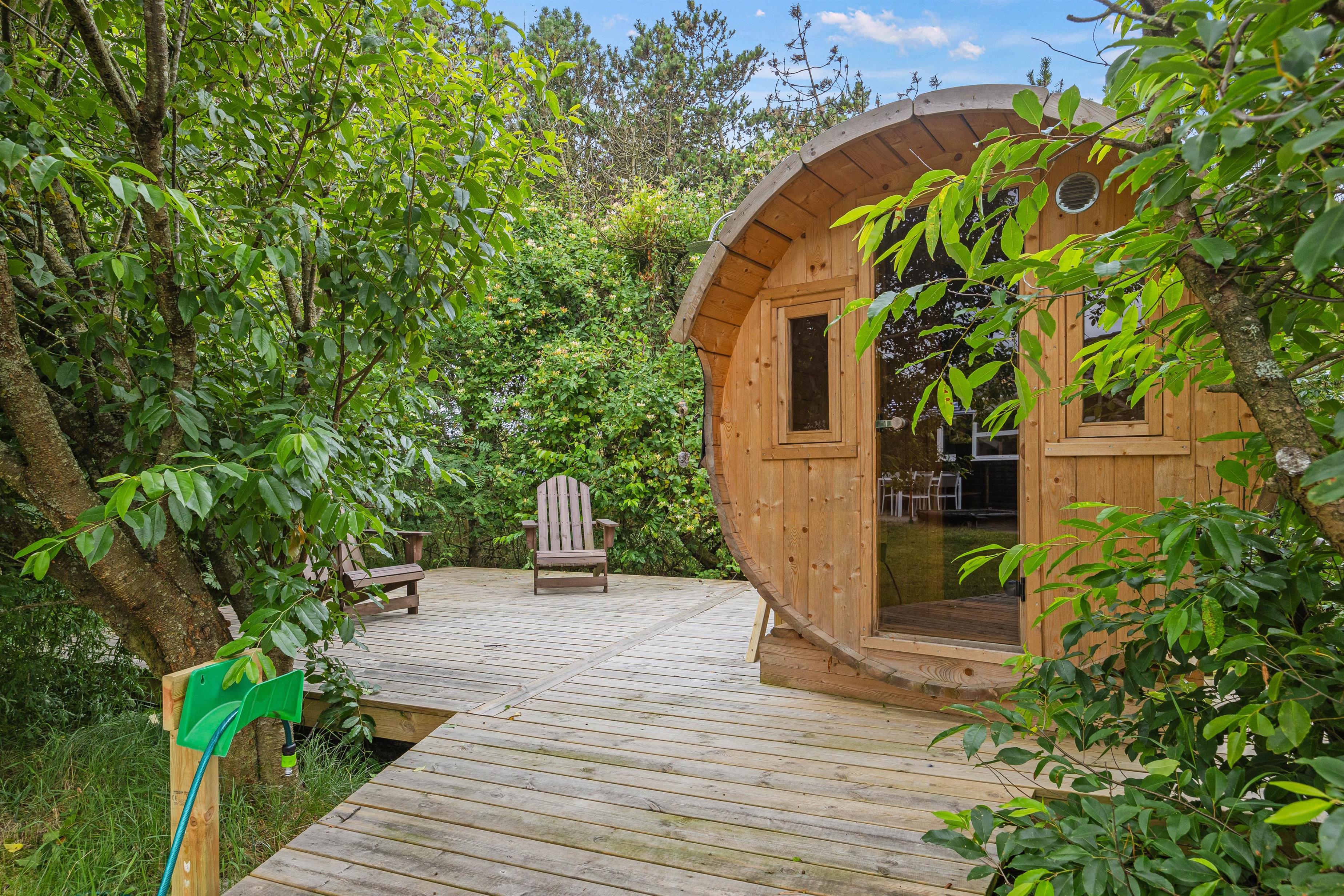 På den delvis afskærmede terrasse kan I solbade i de komfortable liggestole eller trække jer ind under overdækningen, hvis I har brug for skygge. I vil altid kunne finde en god krog at trække jer tilbage med yndlingsbogen og en kop te. På den 1.300 kvm store naturgrund er også opført en udesauna og en udenbruder* med eget terrasseområde, hvor I kan skrue ekstra op for feriestemningen og udelivet. Til de små børn er der en sandkasse, de kan lege i. De lidt større børn kan I måske lokke med til et spil Viking.