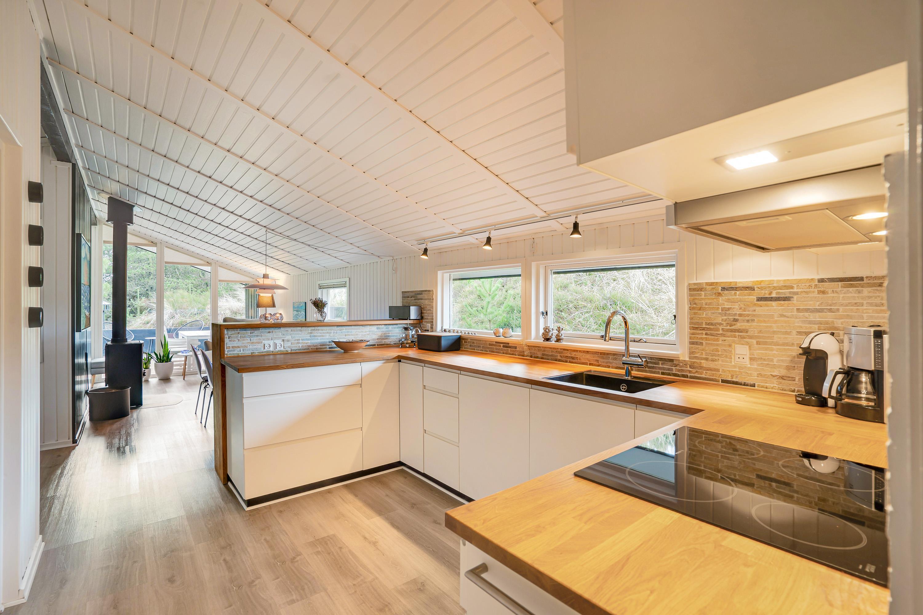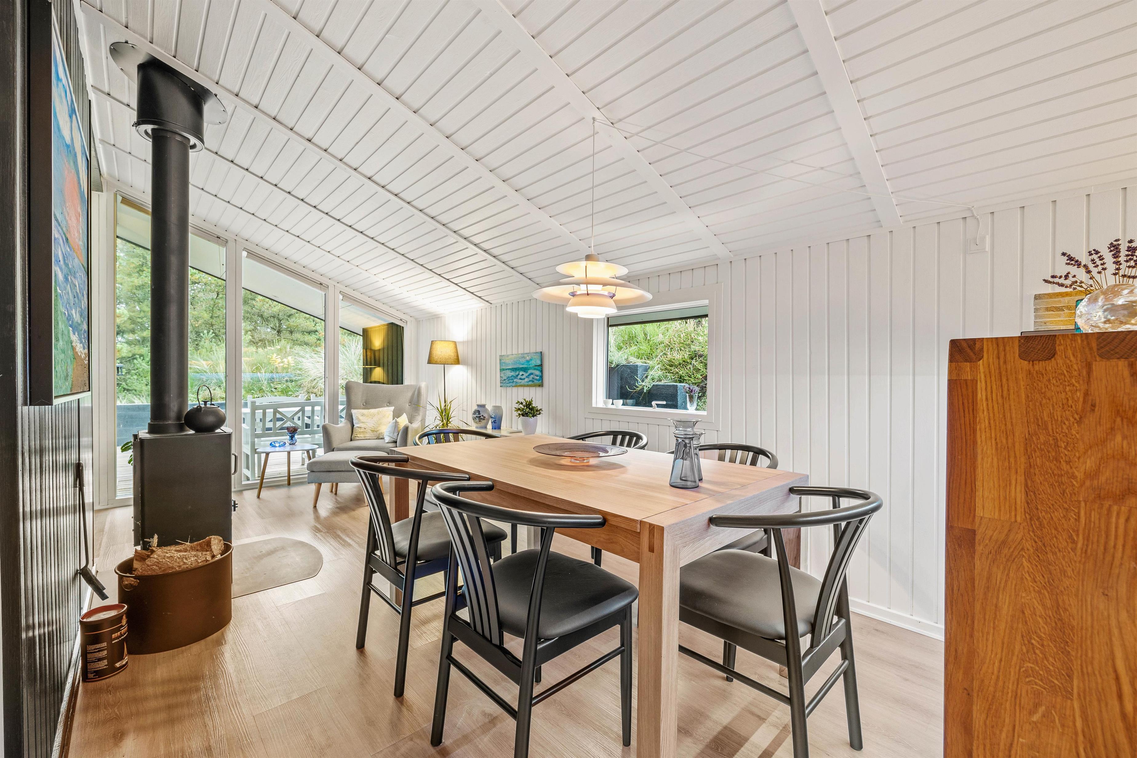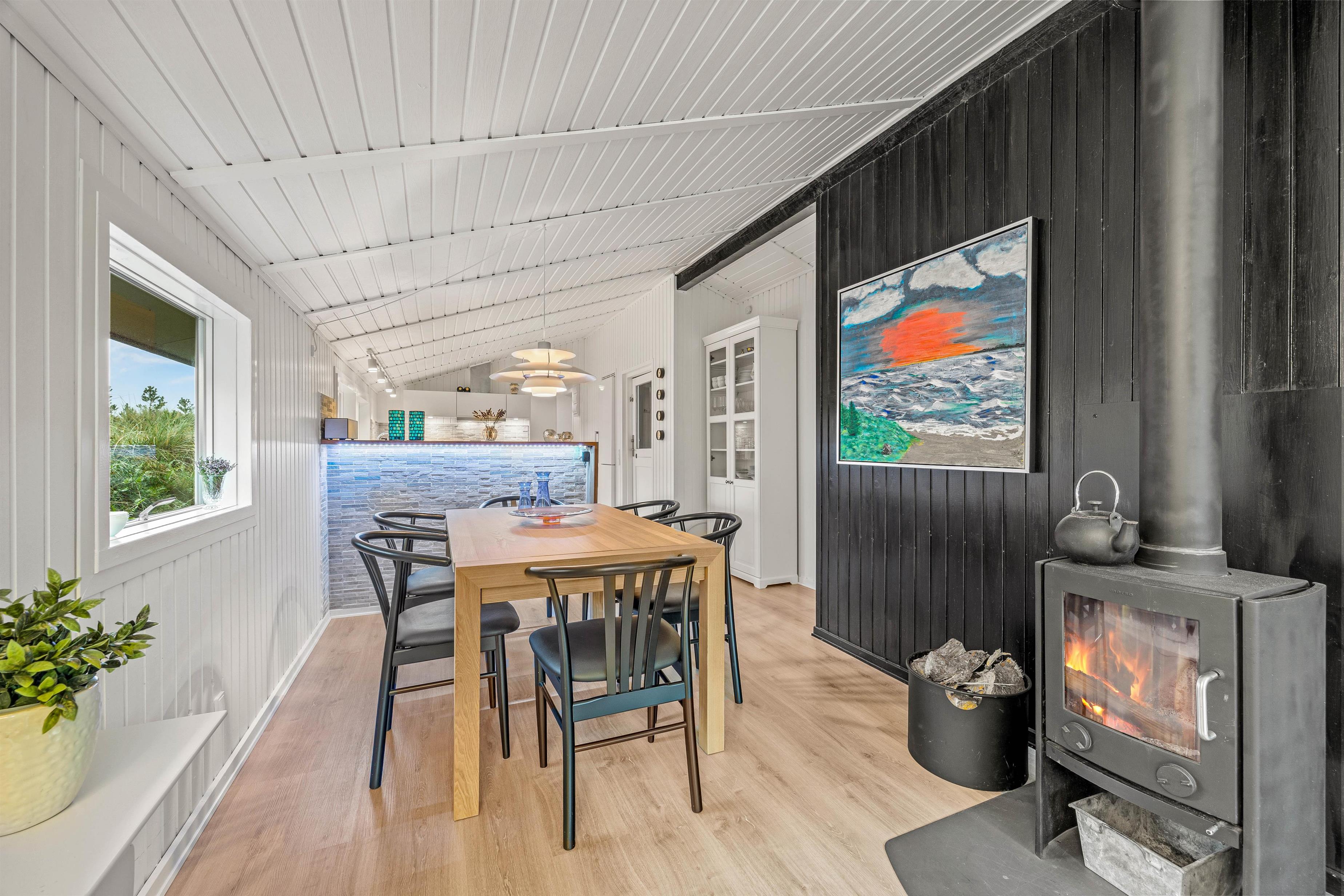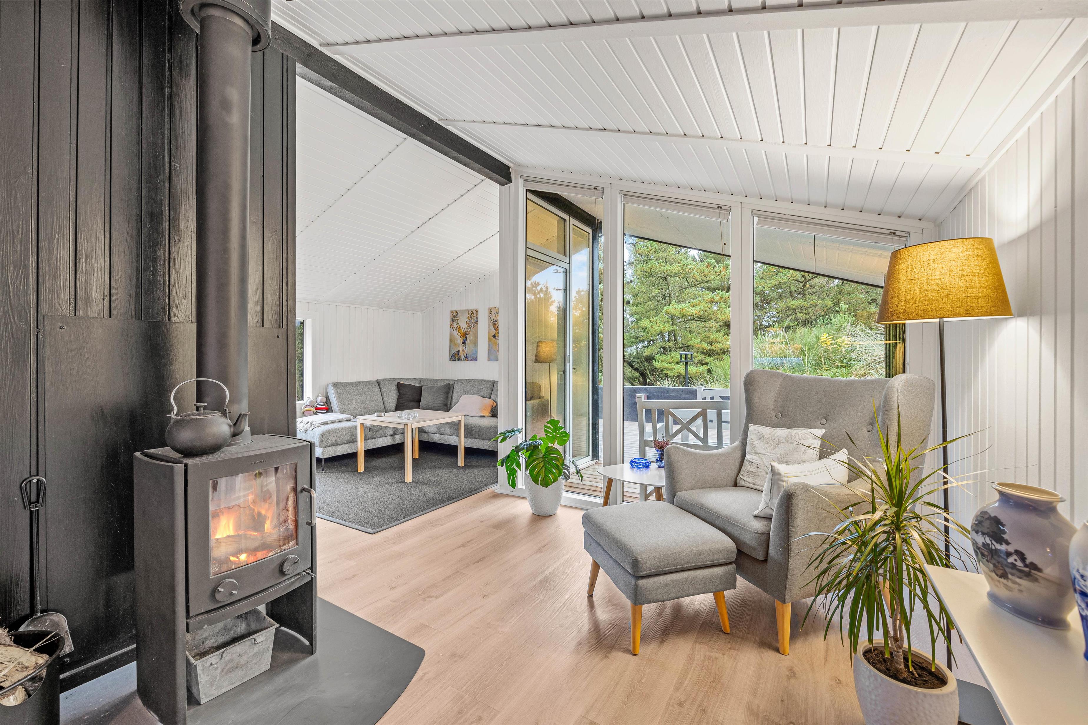 Sommerhuset er 90 kvadratmeter stort, og her finder I 3 soveværelser og 1 badeværelse – på det største soveværelse er der elevationssenge. Desuden er der et stort alrum, der forener køkken, stue og spiseplads, hvor I har mange dejlige feriestunder i vente – I kan blandt andet se jeres yndlingsfilm og -serier via sommerhusets Chromecast. Her sørger brændeovnen for at fuldende den hyggelige feriestemning.