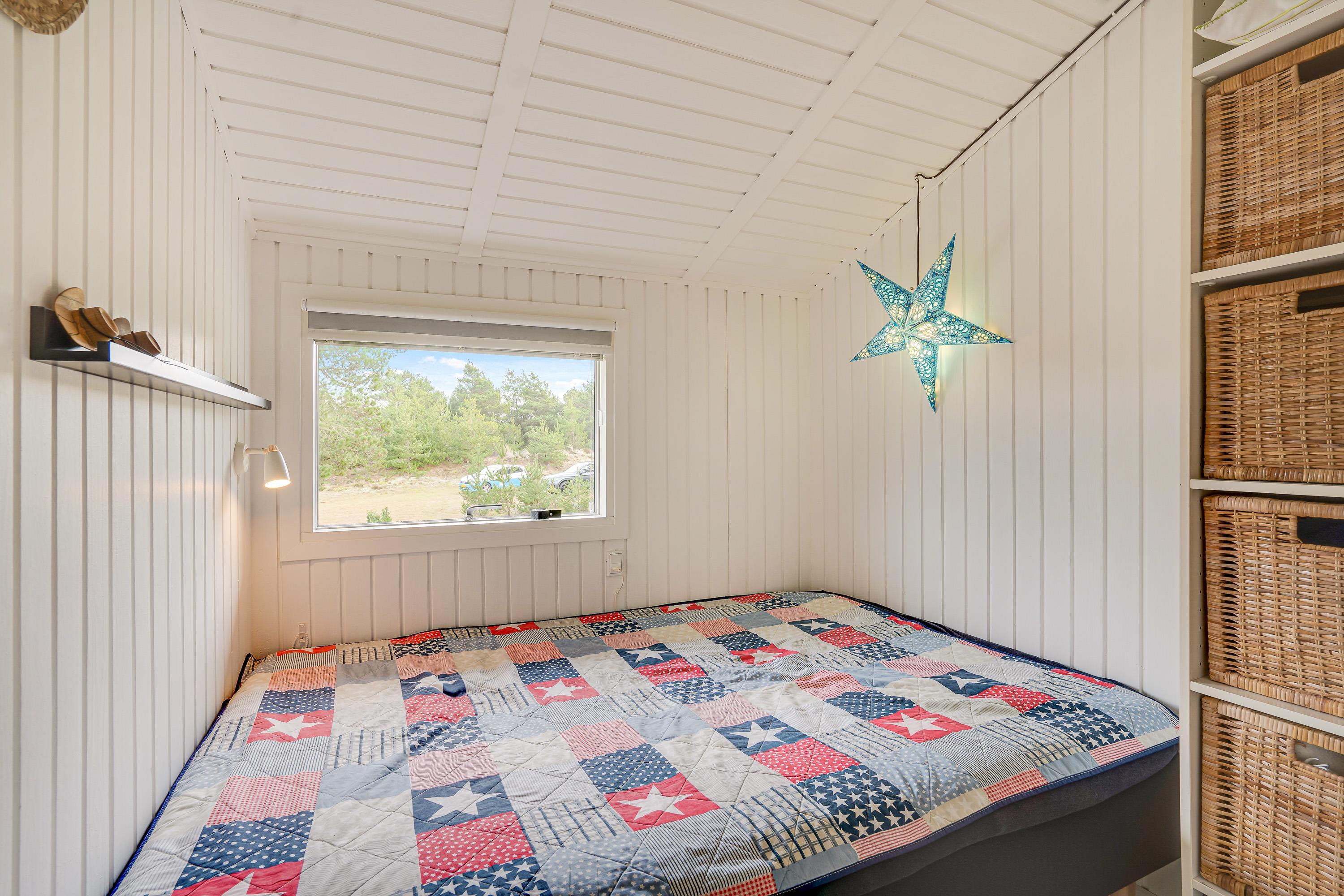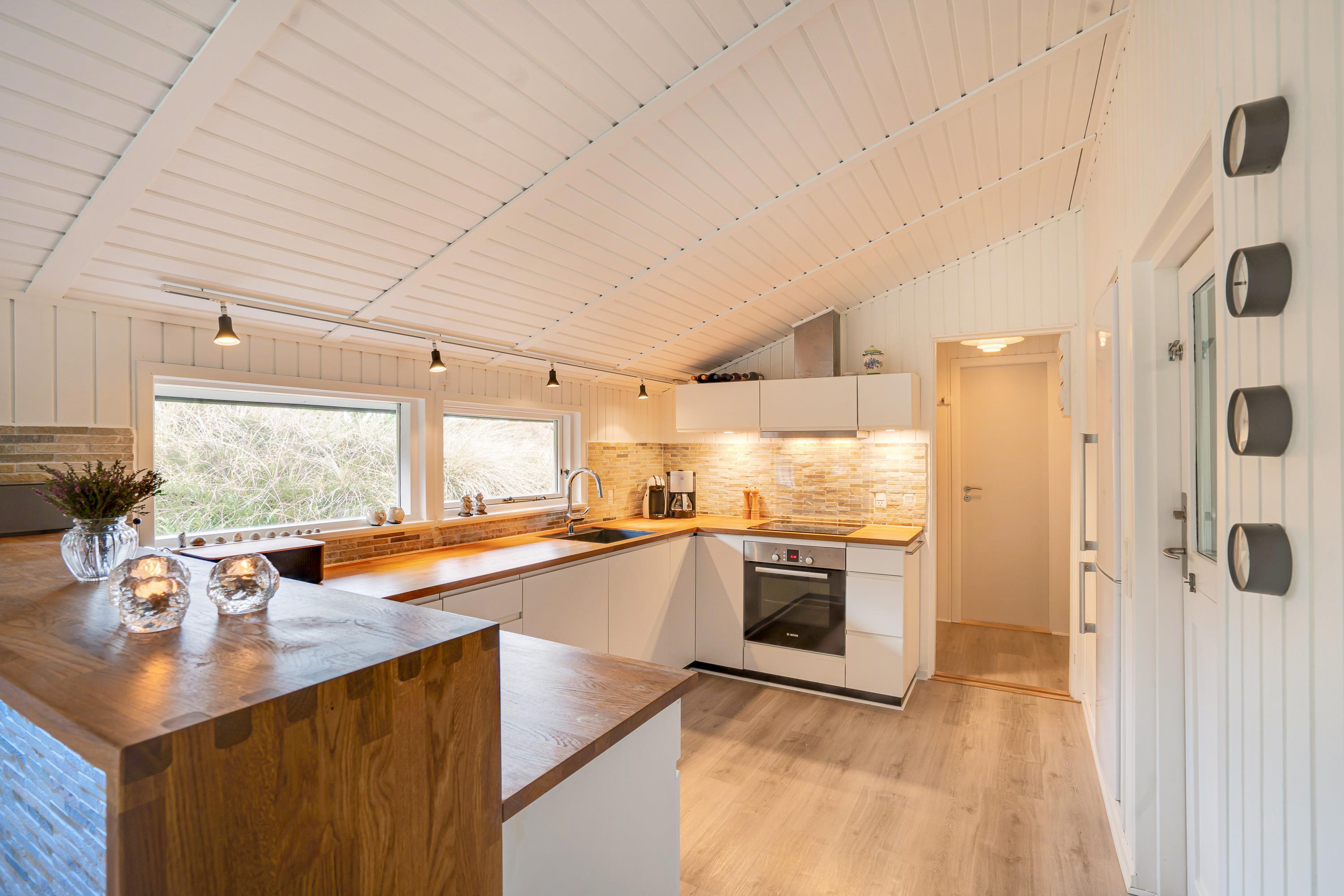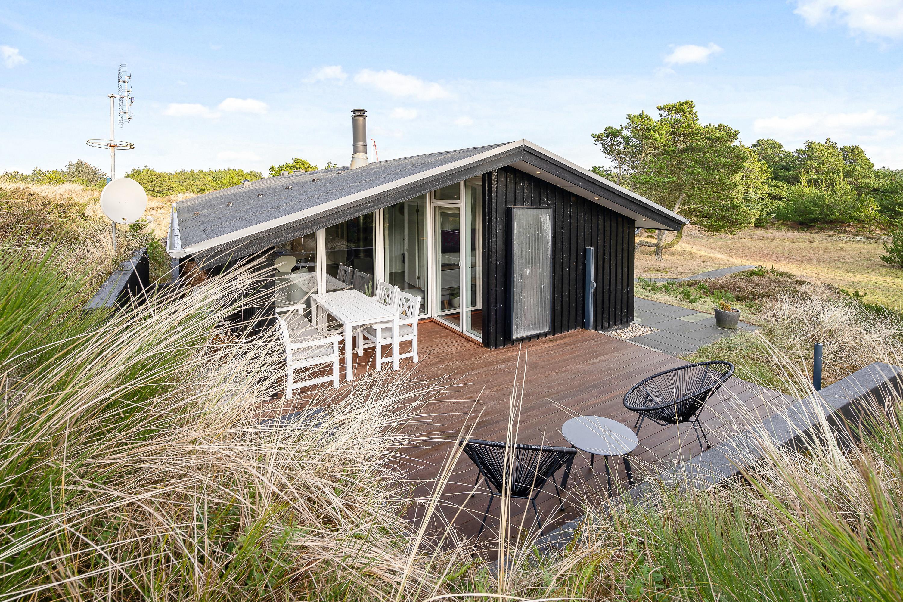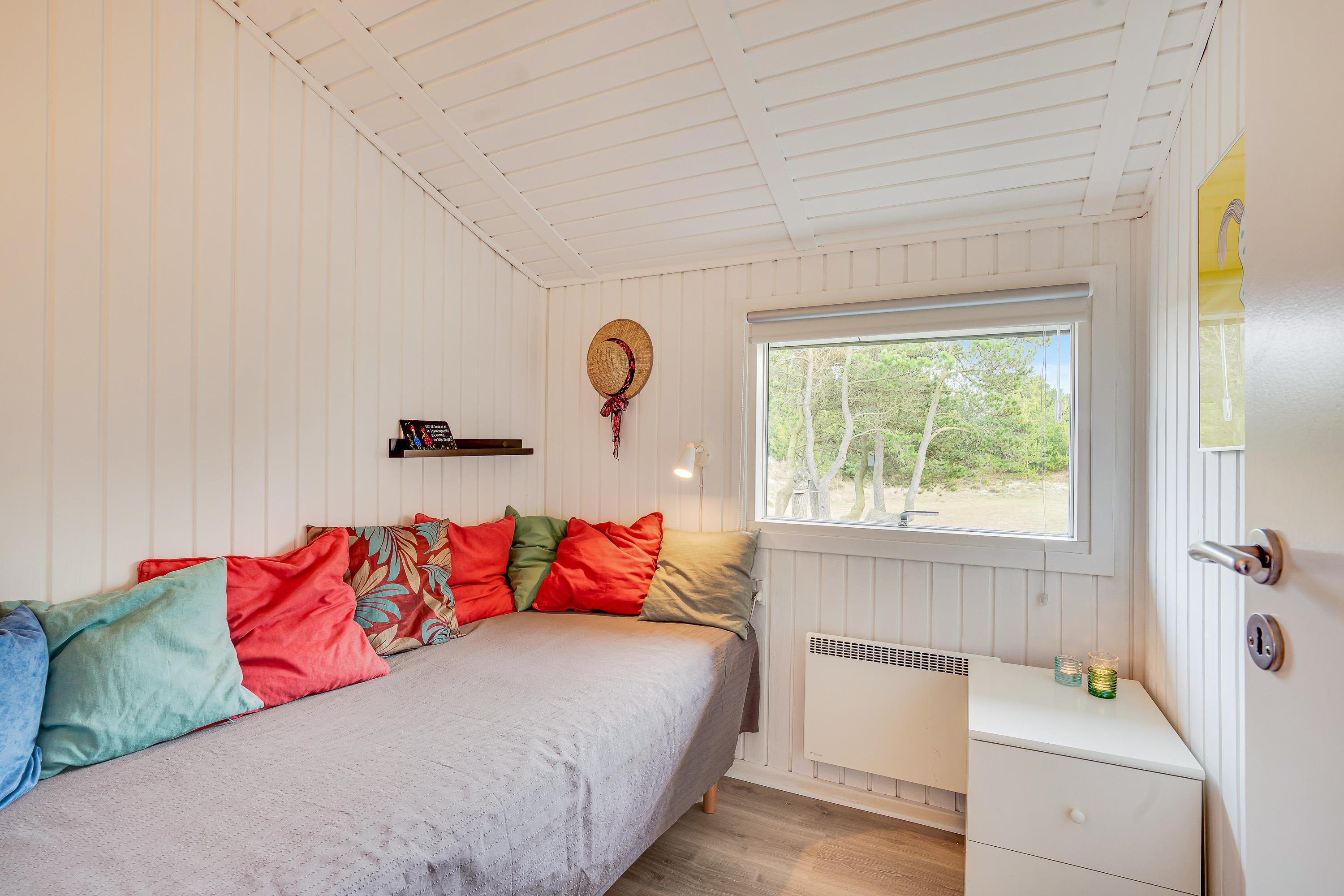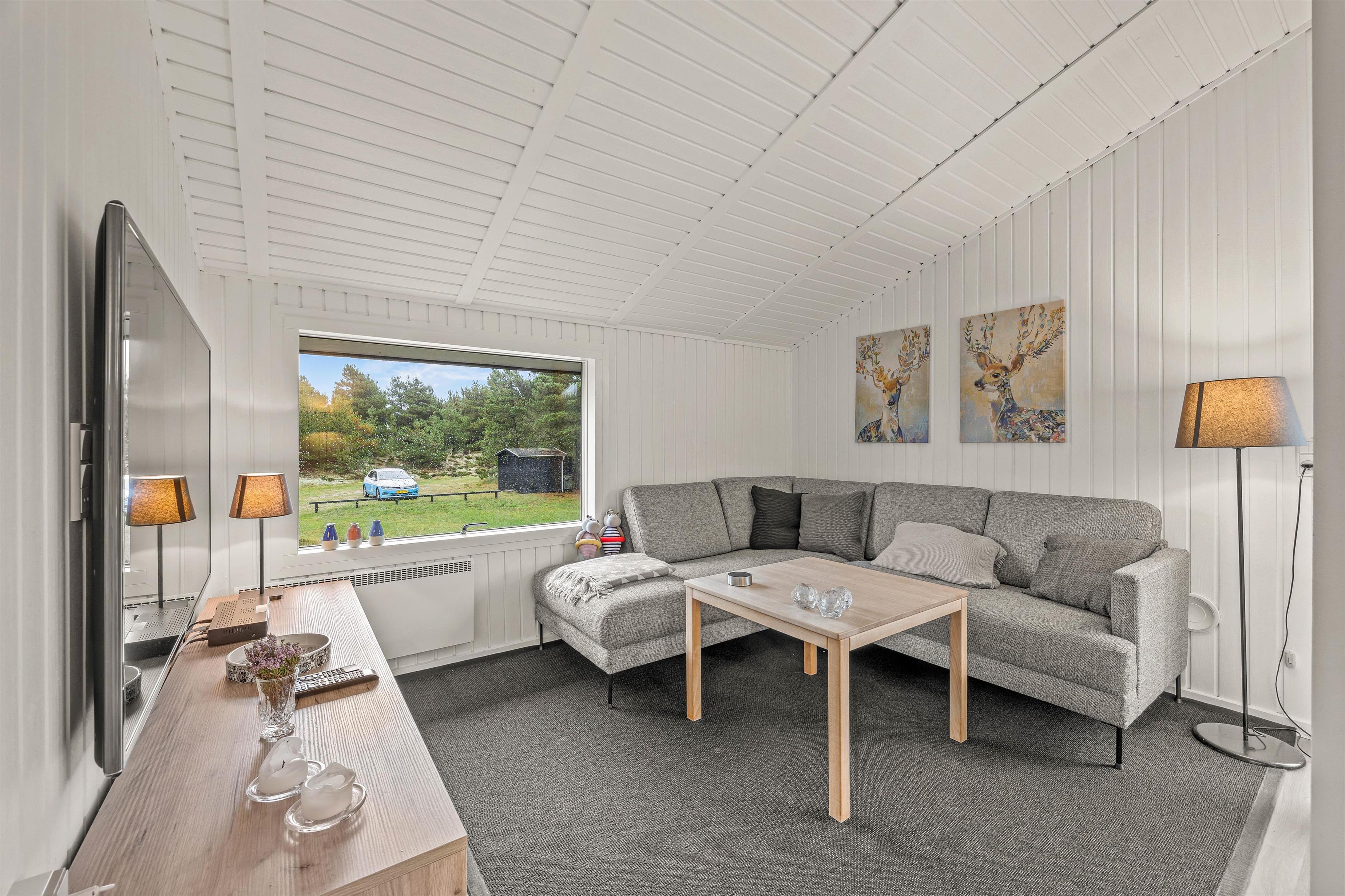 Sommerhuset er 90 kvadratmeter stort, og her finder I 3 soveværelser og 1 badeværelse – på det største soveværelse er der elevationssenge. Desuden er der et stort alrum, der forener køkken, stue og spiseplads, hvor I har mange dejlige feriestunder i vente – I kan blandt andet se jeres yndlingsfilm og -serier via sommerhusets Chromecast. Her sørger brændeovnen for at fuldende den hyggelige feriestemning.