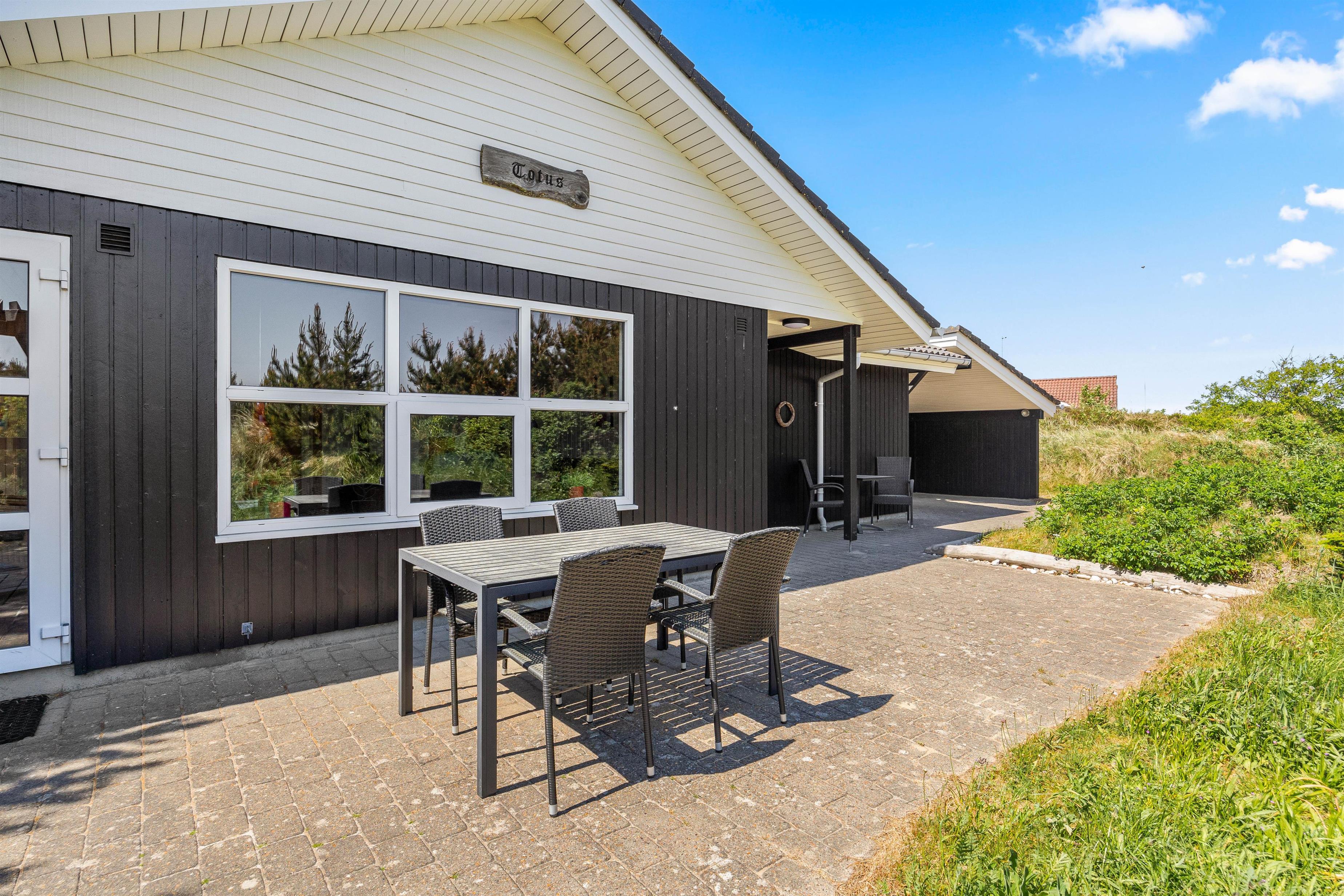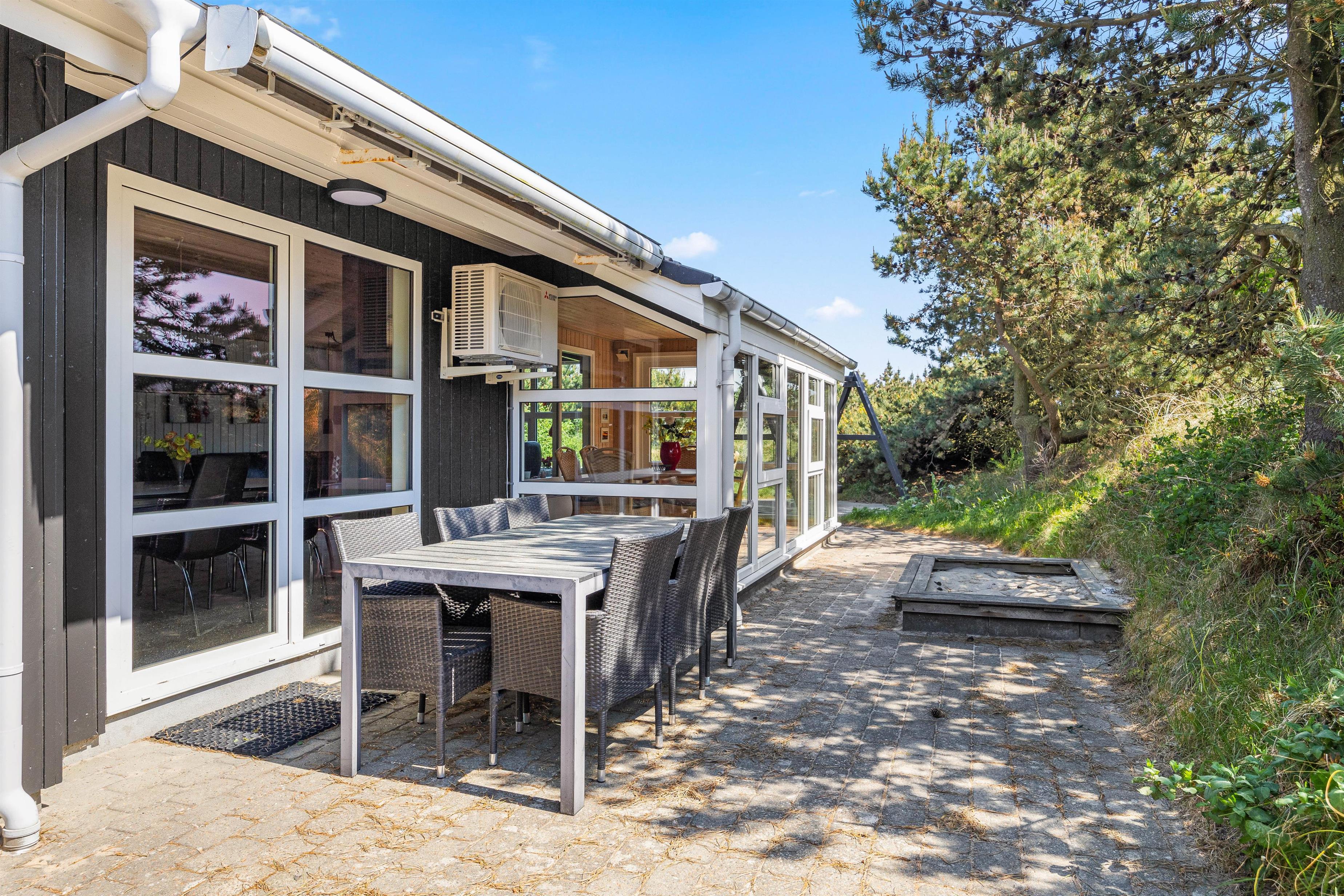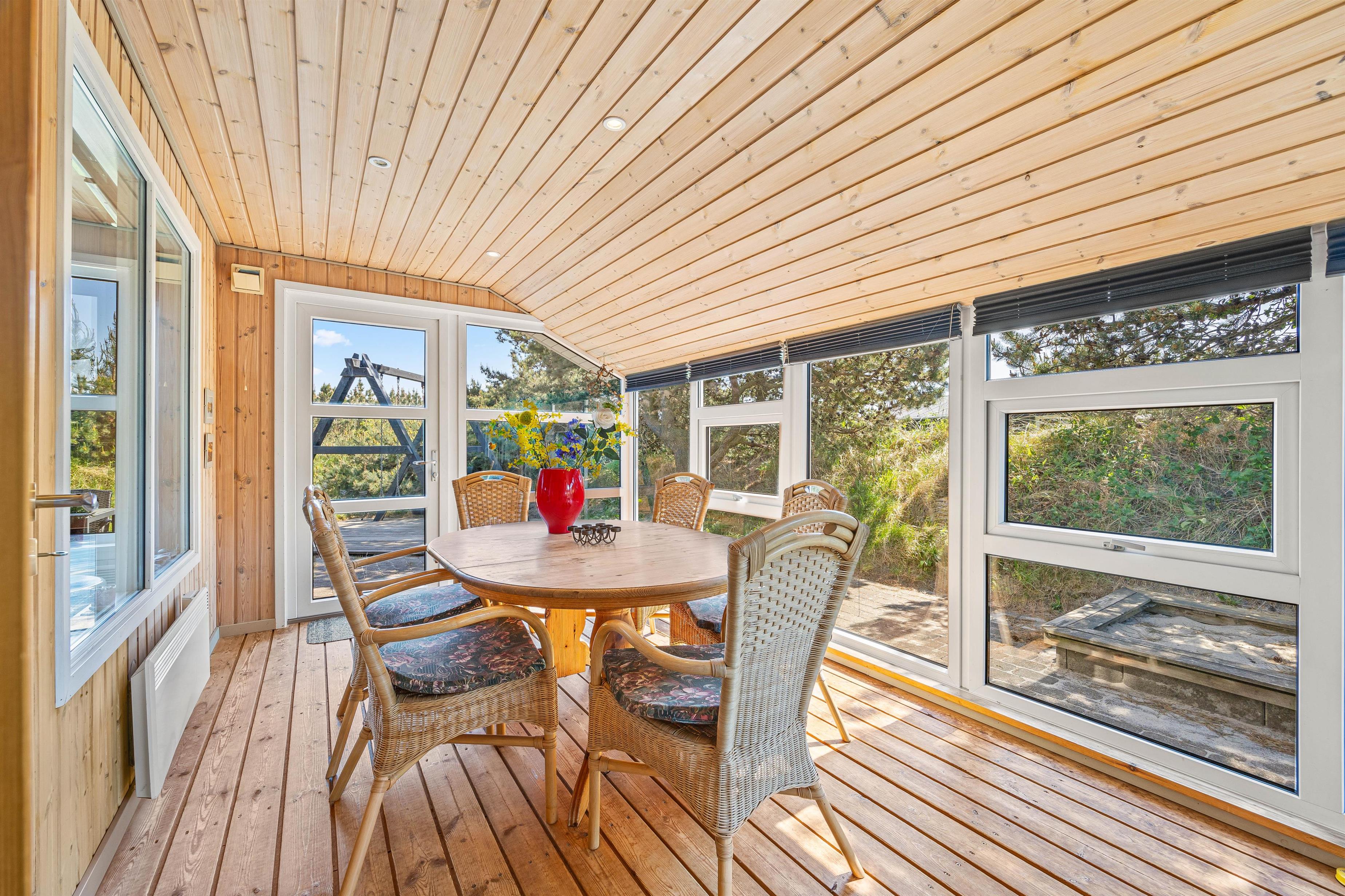 Udenfor venter en skøn udestue, hvor I kan nyde udsigten ud til den enestående natur – Henne Strands klitter. Udestuen er den oplagte plads til både ro og hygge uanset vejret. De store vinduer sørger for et fantastisk lysindfald, og I kan nyde naturen på nær hånd, også når vejret ikke er til udendørs ophold.