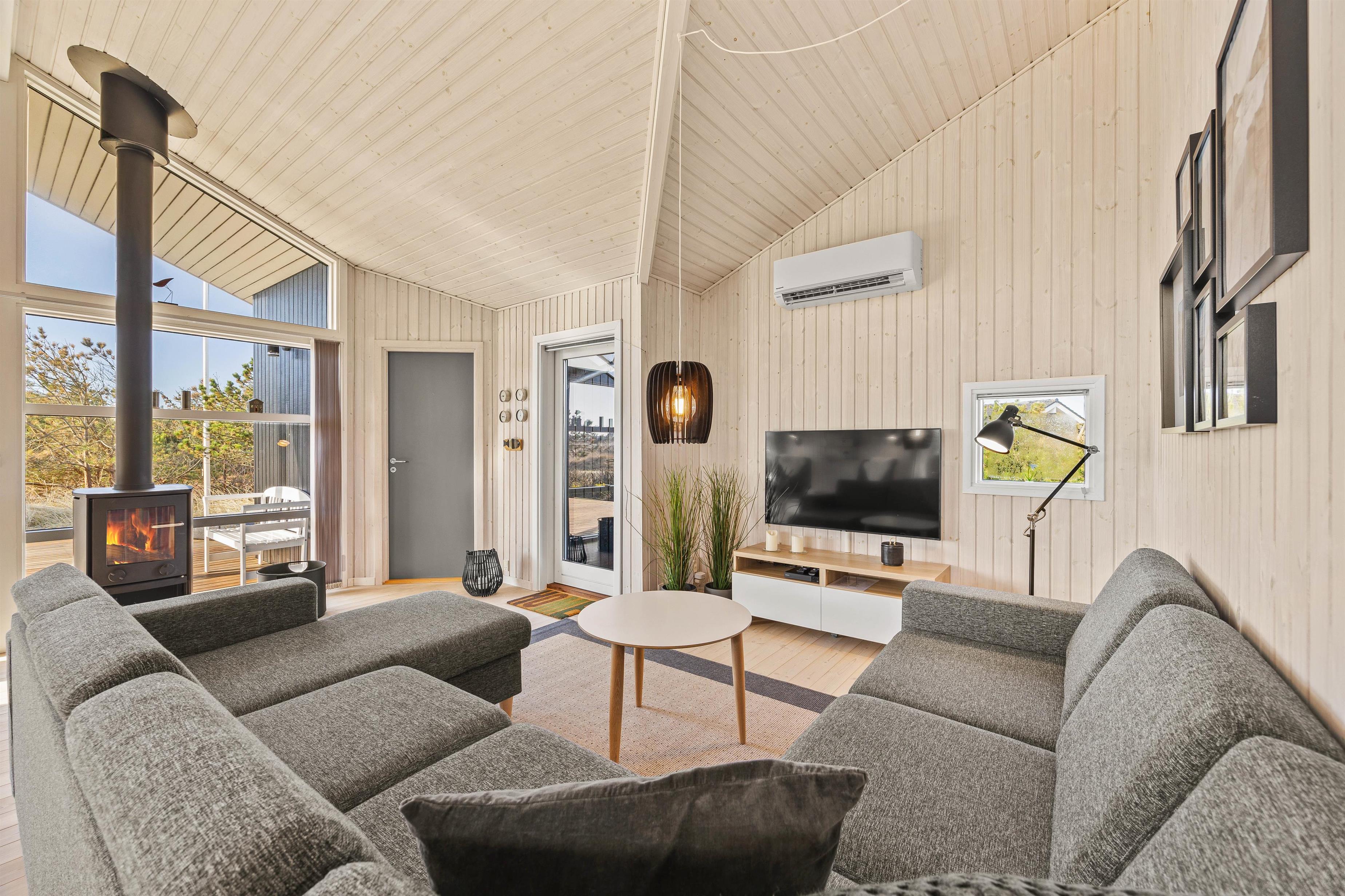 Det åbne stue-køkkenområde med brændeovnen lige i hjertet af sommerhuset er det oplagte samlingspunkt for jer, og med opvaskemaskine og vaskemaskine i huset er de praktiske opgaver hurtigt klaret, så I igen kan tilslutte jer hyggen og aktiviteterne.