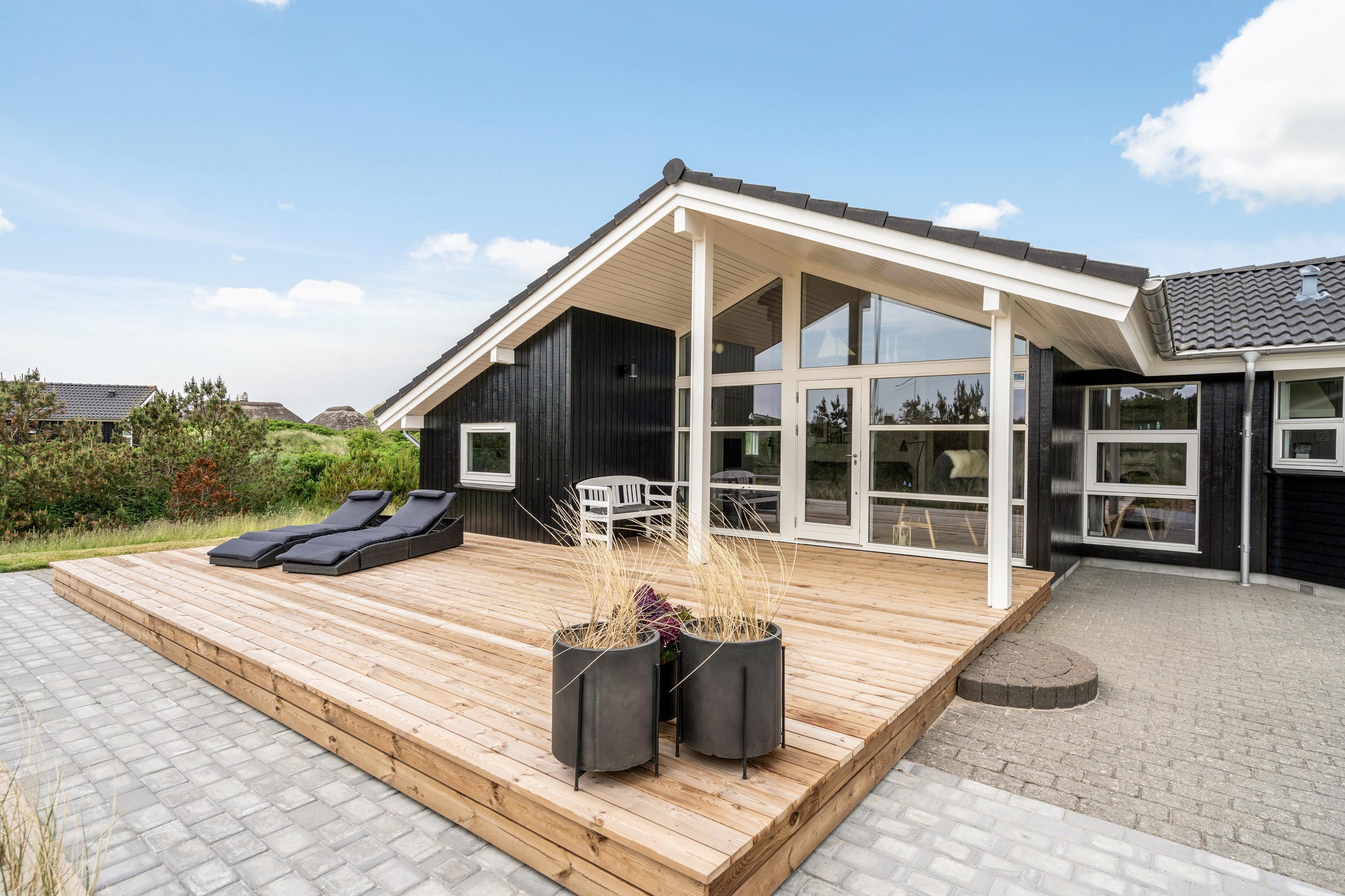 Sommerhuset putter sig dejligt mellem klitter og buskads, og alligevel har I udsyn og luft omkring jer. Den overdækkede terrasse ligger som naturlig forlængelse af stuen og inviterer til både morgenkaffe, en stund med en god bog i lækrogen eller stjernekiggeri over et glas rødvin, mens I vender dagens oplevelser.