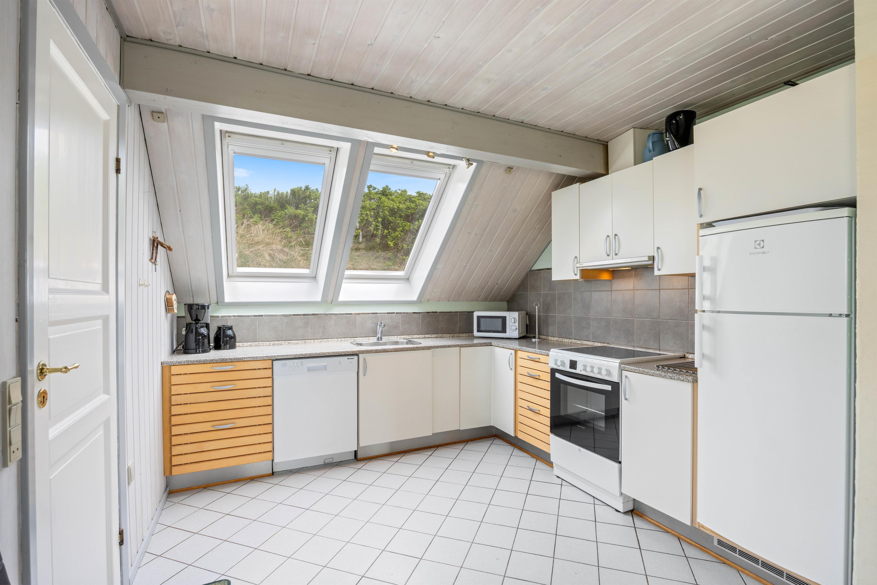 Hjerterummet er stuen, som er forbundet med spiseplads og køkken. Her er en dejlig brændeovn, som spreder glæde og hygge. Her kan I se film sammen, spille brætspil og meget mere – alt imens opvaskemaskinen klarer opvasken efter maden. Udover opvaskemaskine findes både vaskemaskine og tørretumbler i feriehuset og som et plus, er der gulvvarme under klinkerne i alrummet samt på badeværelserne.