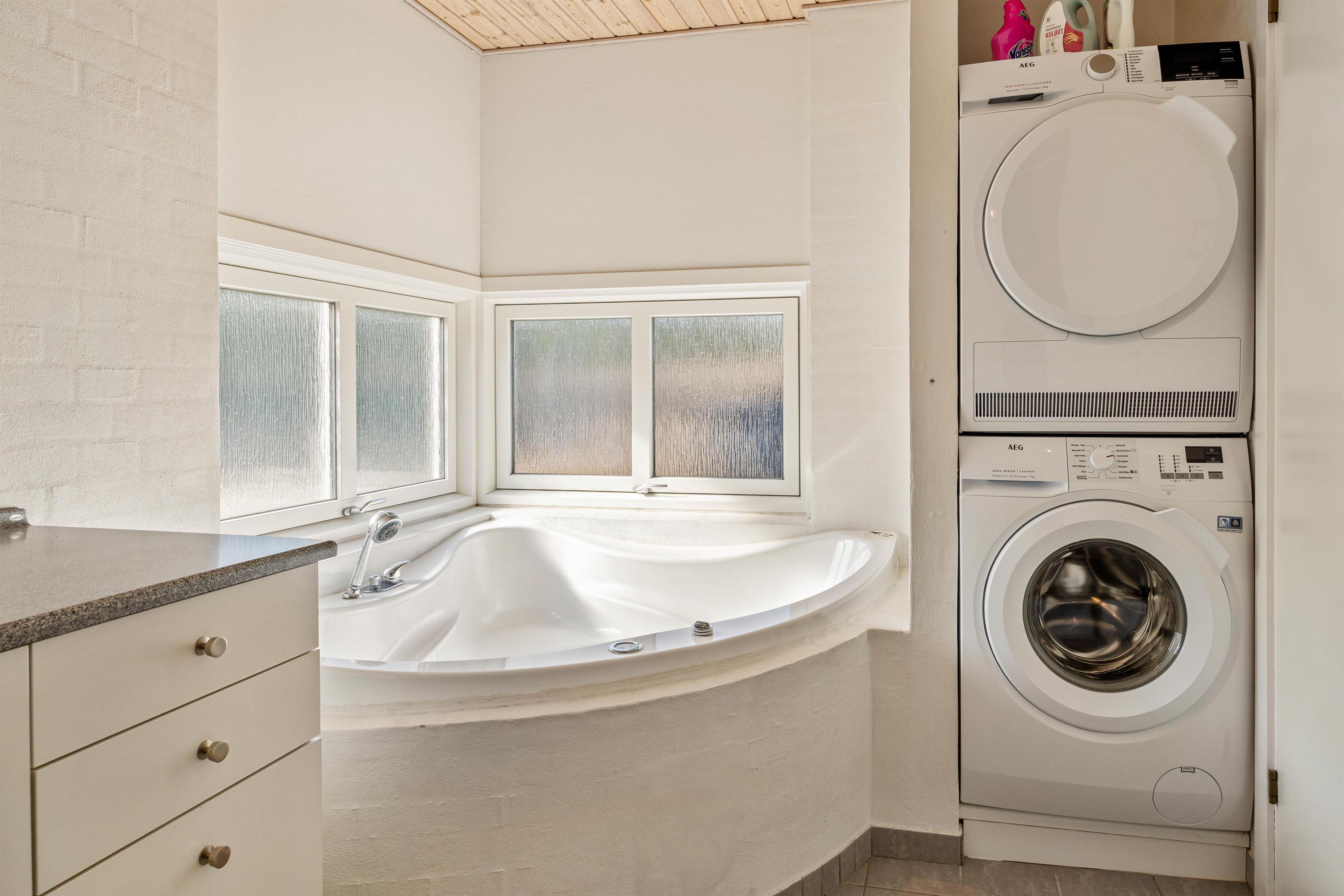 Naturligvis er begge badeværelser også udstyret med gulvvarme. I det ene badeværelse finder I feriehusets vaskemaskine og en tørretumbler, så I ikke behøver at samle vasketøj under jeres ophold i dette skønne feriehus.