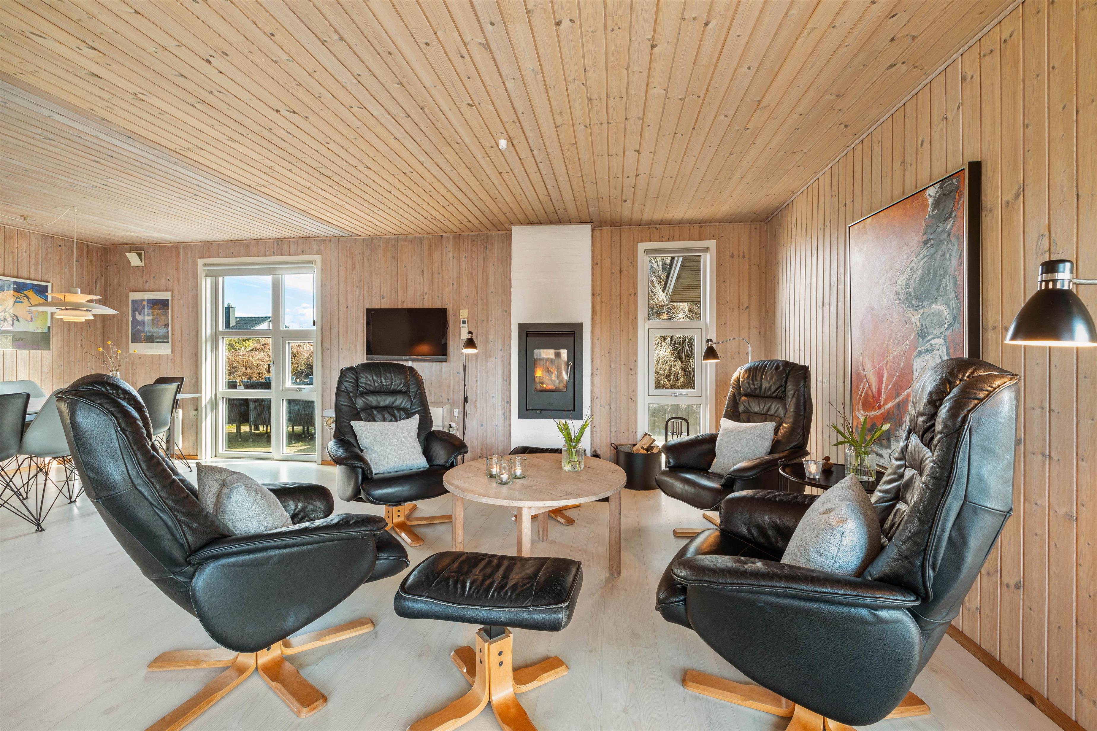 Feriehusets flotte stue er velindrettet, og de moderne møbler, det lyse træværk og den hyggelige brændeovn skaber den rigtige feriehusstemning. De store vinduer lukker masser af lys ind og gør, at grundens henrivende natur kan nydes herfra.