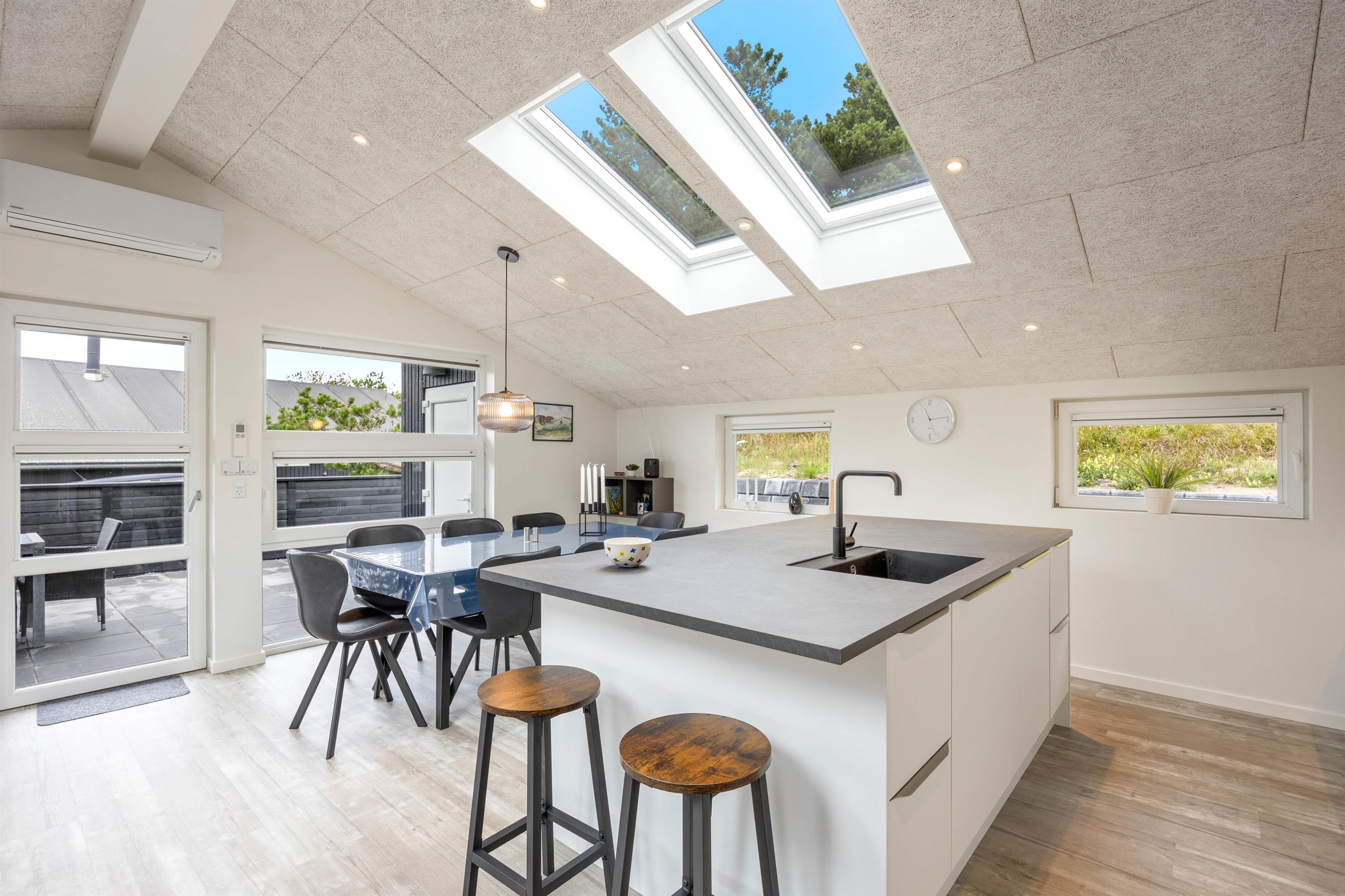 Dette stilfuldt indrettede sommerhus byder på moderne faciliteter, der gør jeres ferie bekvem: her finder I opvaskemaskine, vaskemaskine samt tørretumbler – og så kan de huslige pligter klares hurtigt og effektivt. Luft-til-luft varmepumpen sørger for, at I altid har en behagelig temperatur indendørs, uanset årstiden. Begge badeværelser er udstyret med gulvvarme.