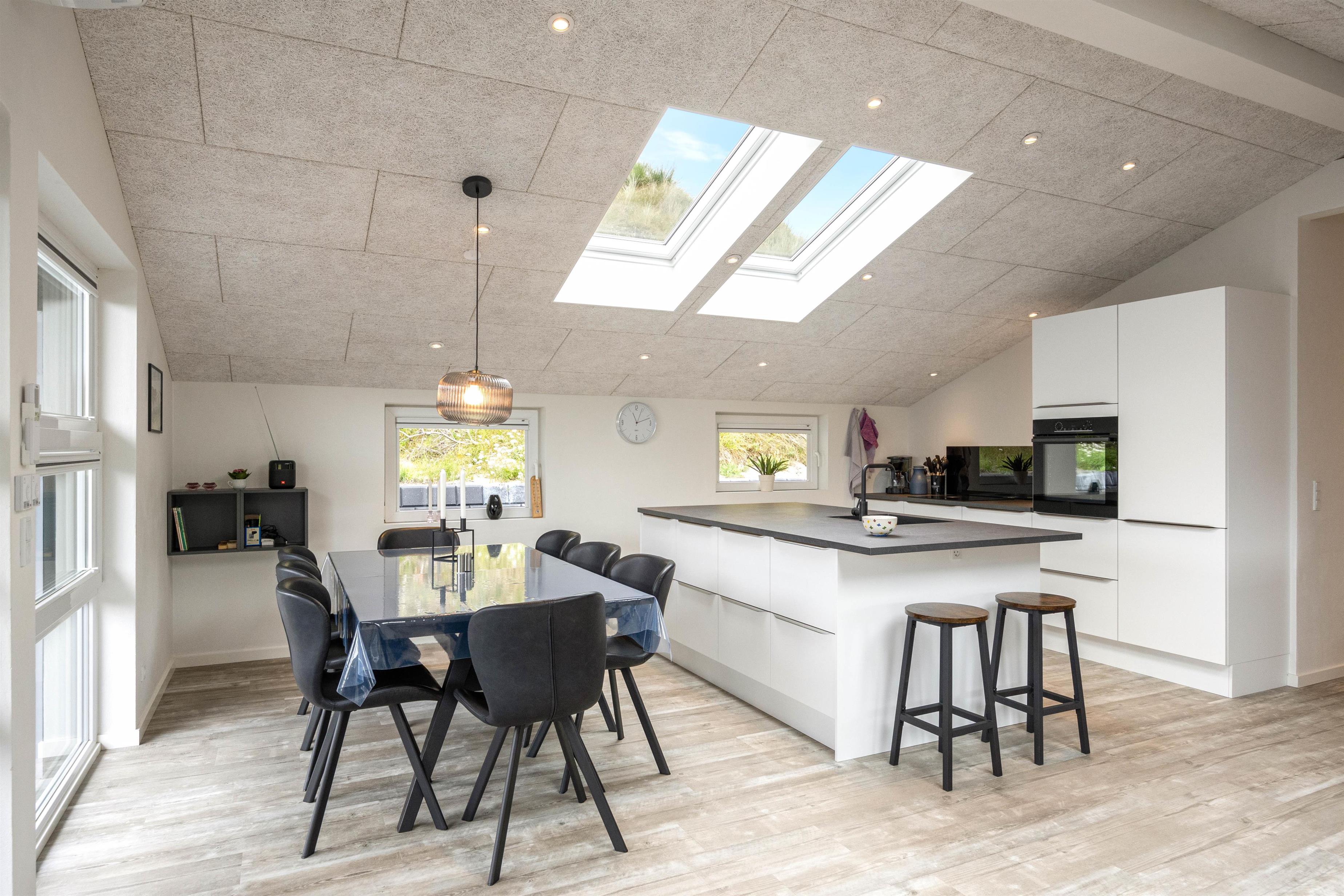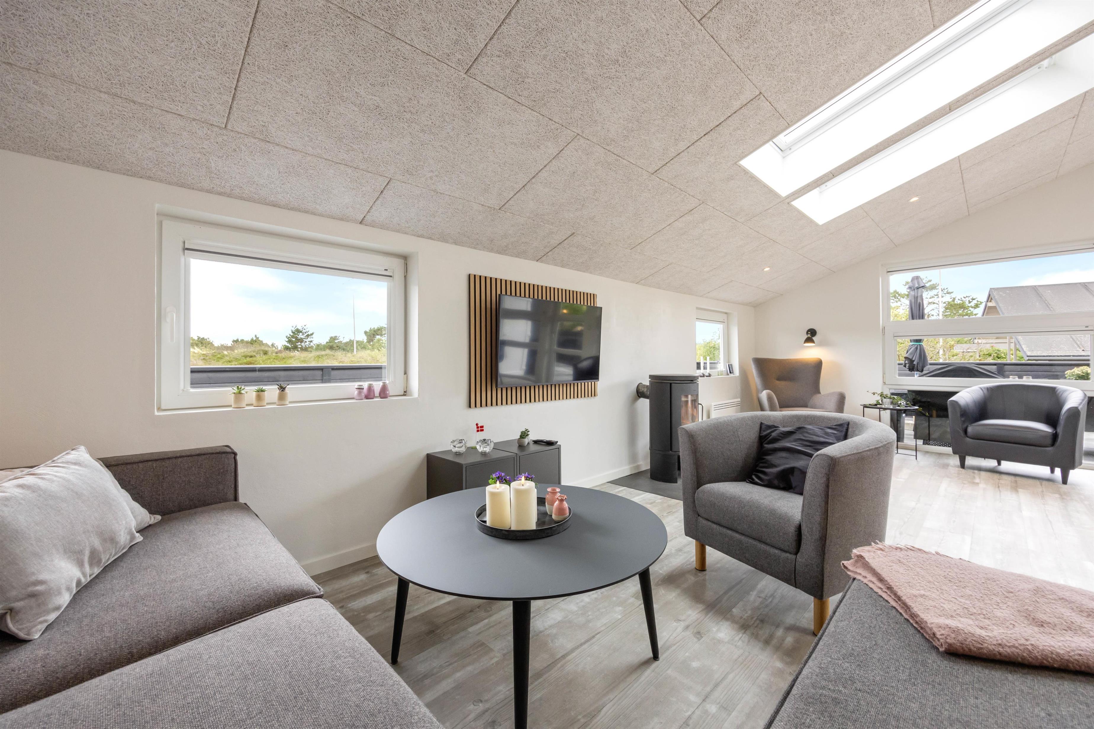 Sommerhusets store entré giver jer straks en behagelig velkomst. Den indbydende brændeovn i den hyggelige stue skaber ikke blot en dejlig atmosfære på de køligere aftener, men tilfører også hygge, imens I ser fjernsyn eller film på sommerhusets Apple TV.