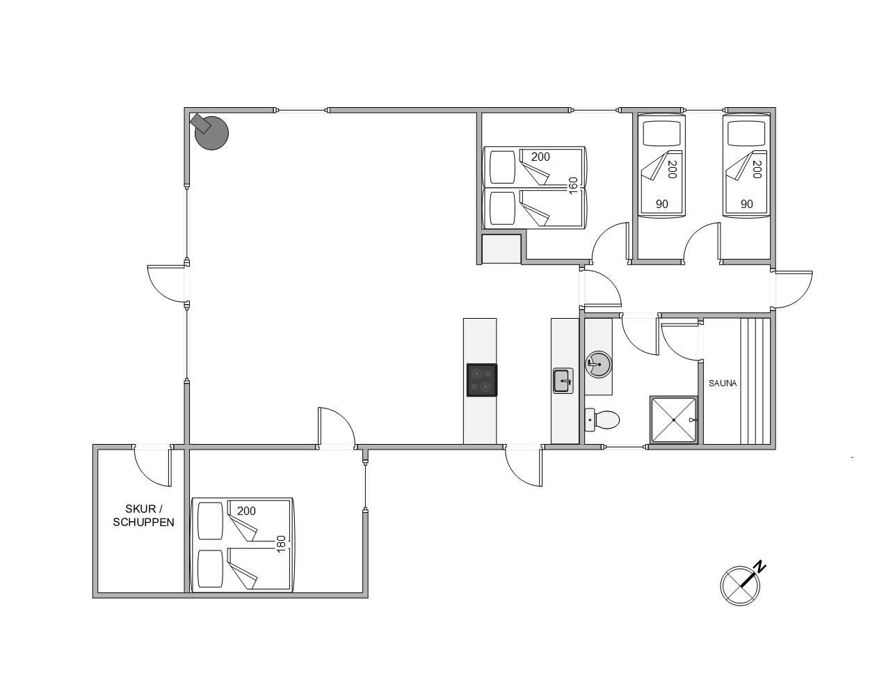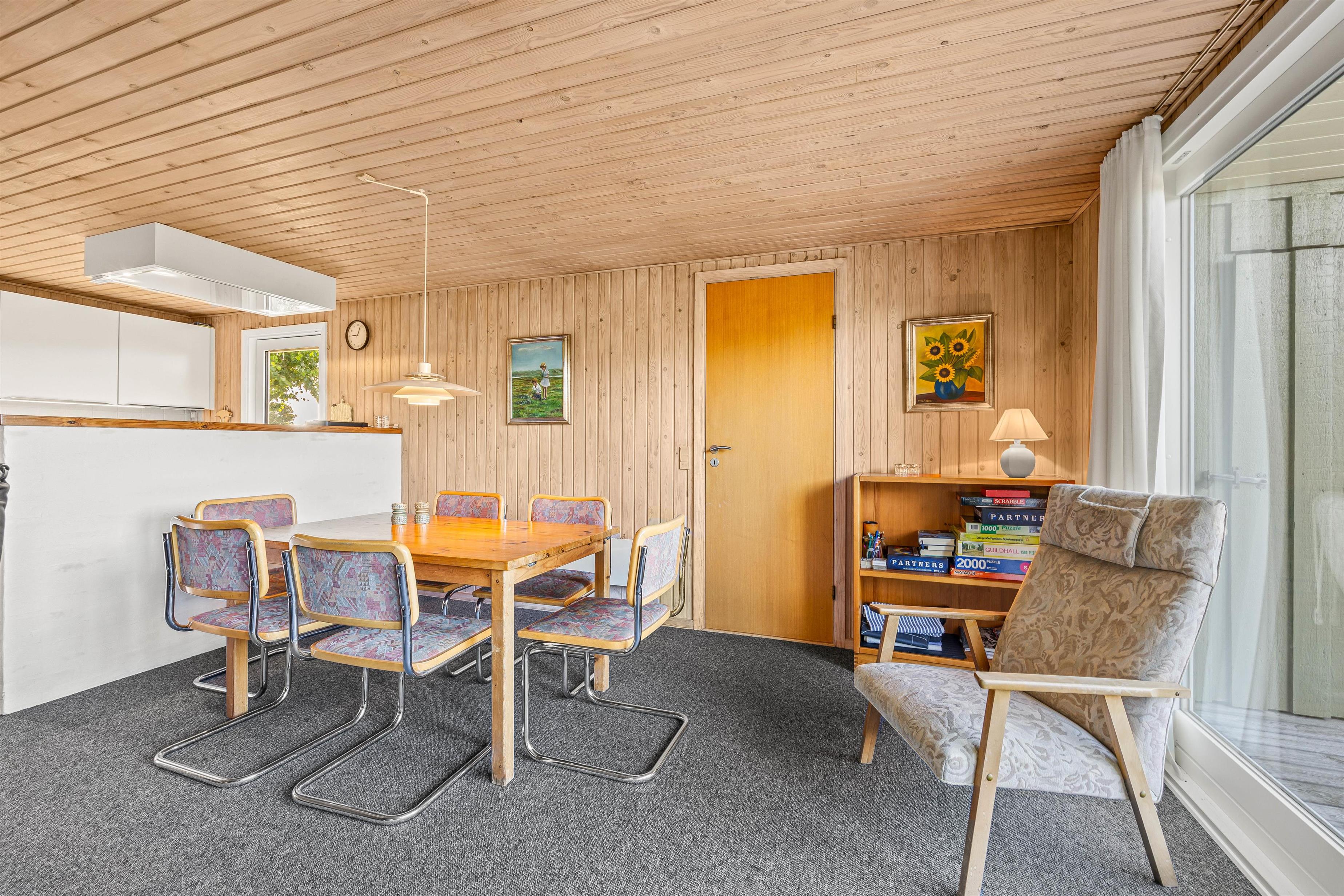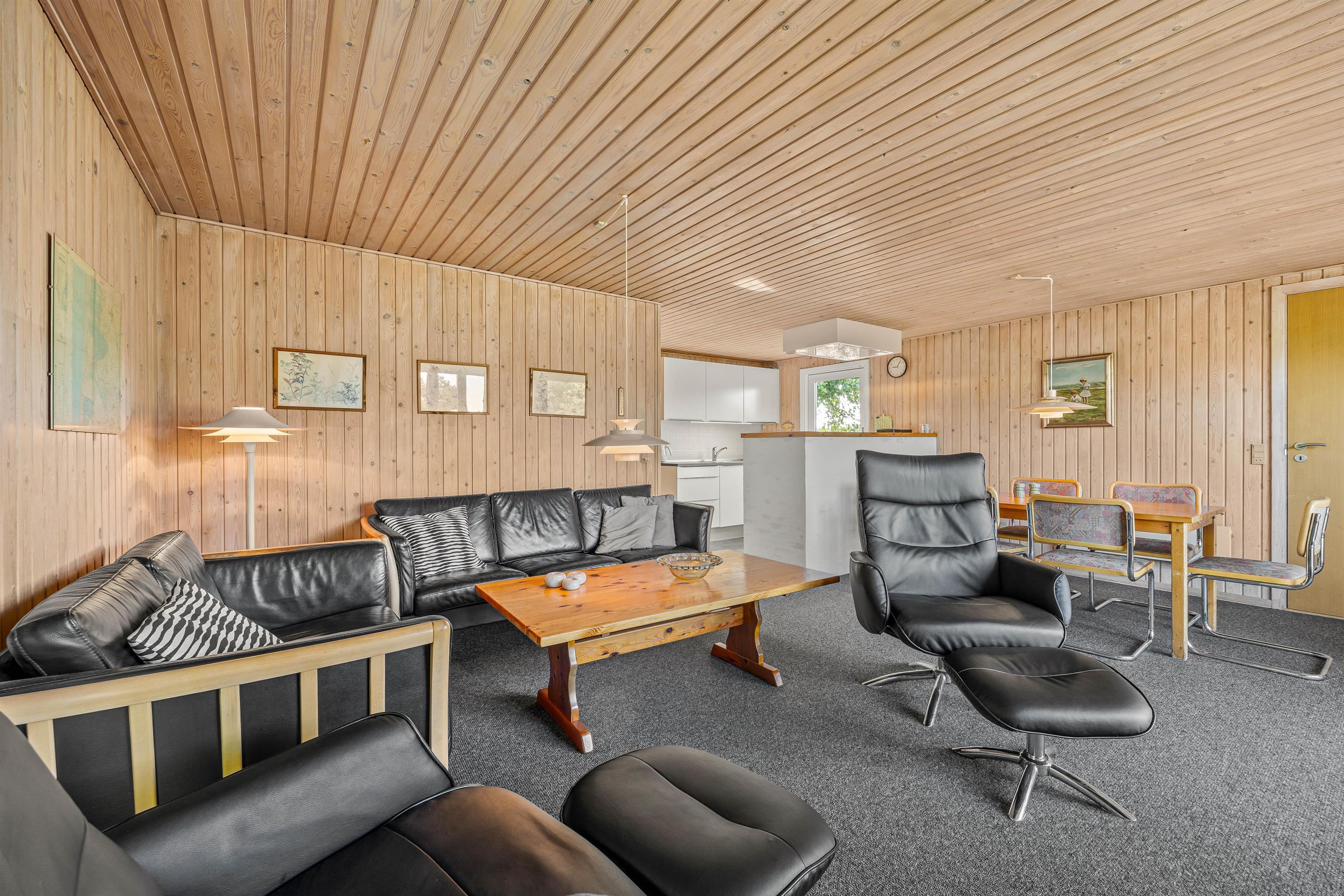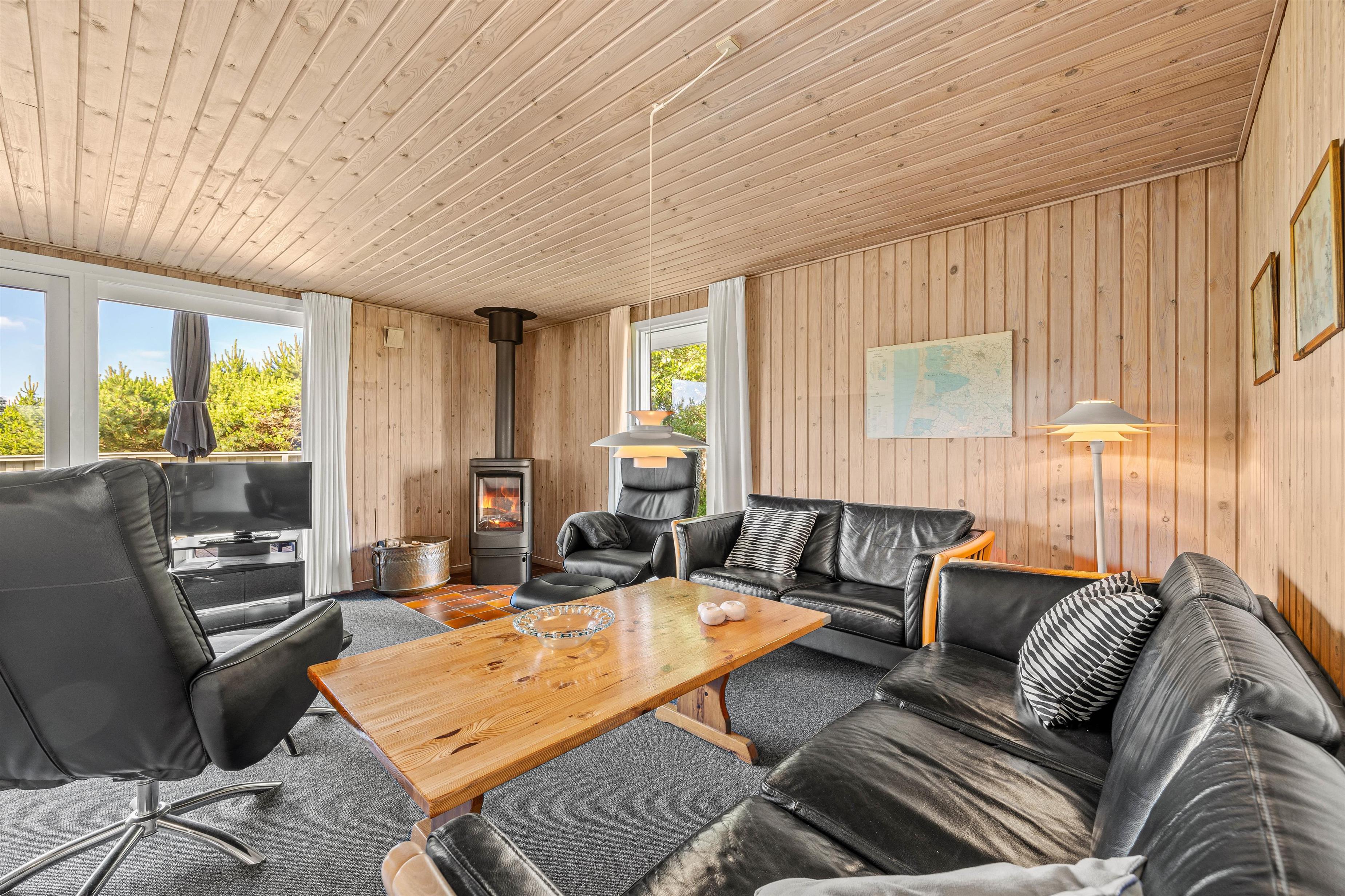 Stuen er det perfekte samlingspunkt efter en lang dag ved havet eller på farten. Her kan I slappe af og hygge med alt fra film til brætspilsaftner. Her er en dejlig brændeovn, som spreder god varme og glæde. Skal I varmes godt i gennem har feriehuset sin egen sauna. Her kan I nyde fridagene og da huset ingen internet har kunne man slukke telefonen, læse en god bog og nyde roen.