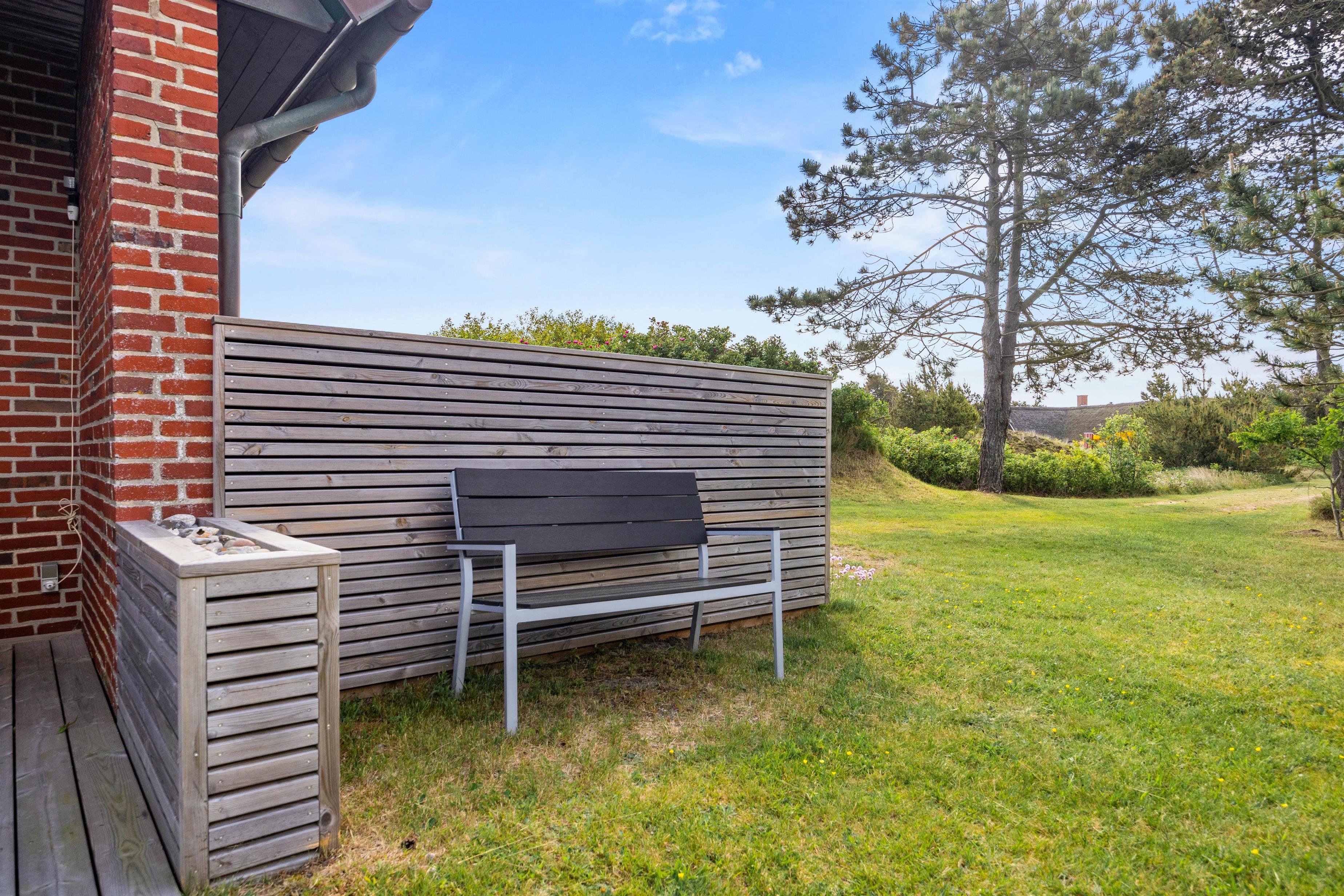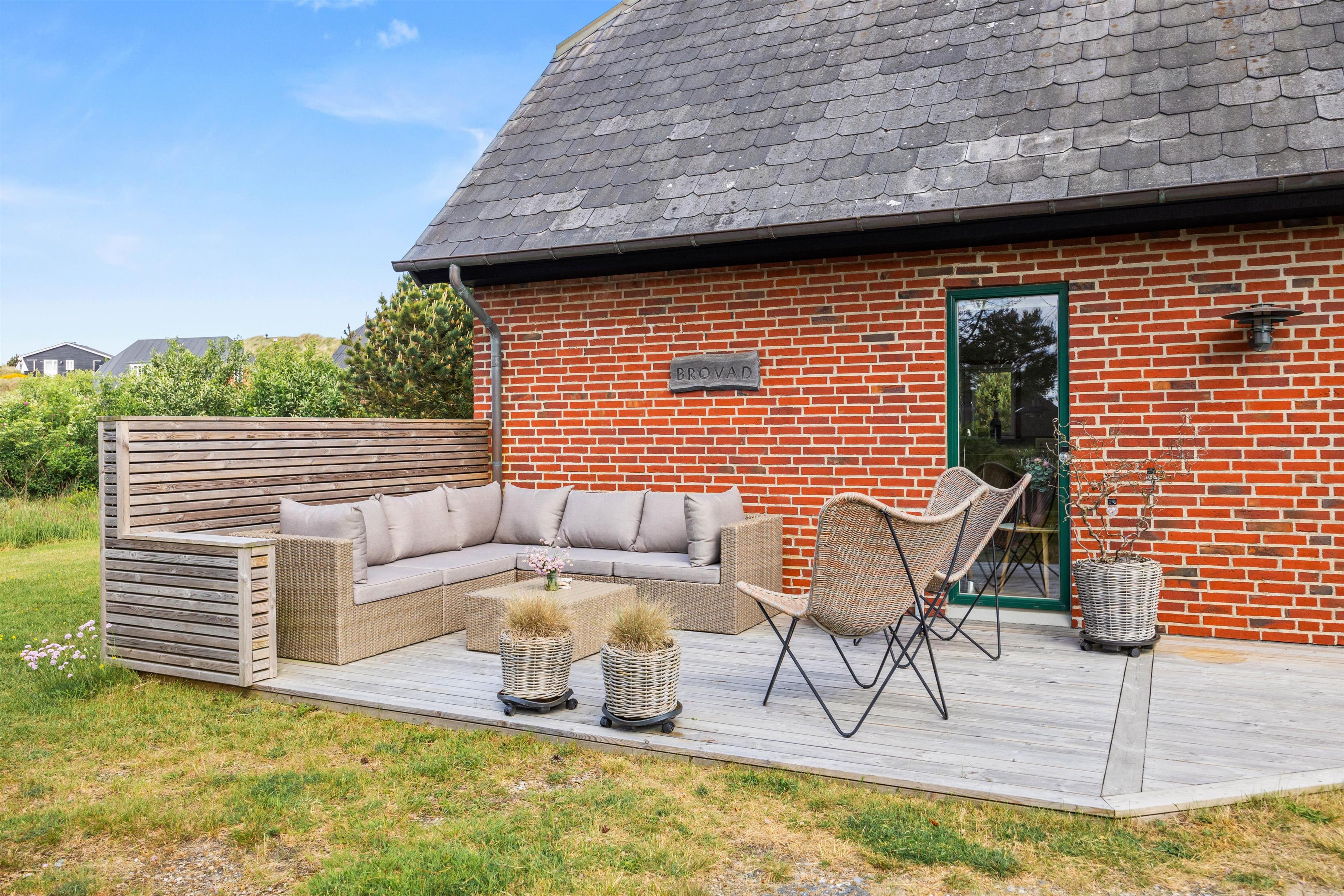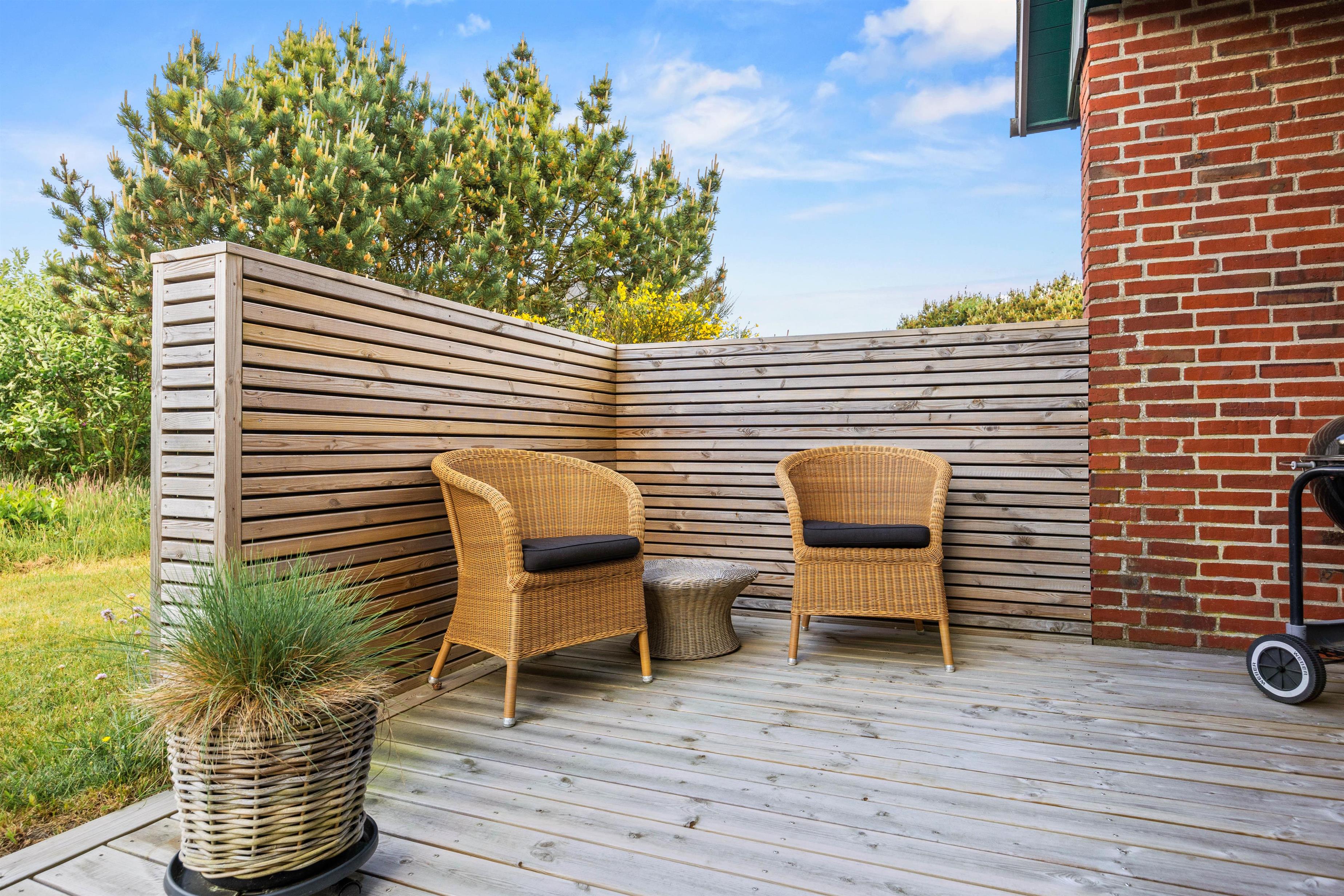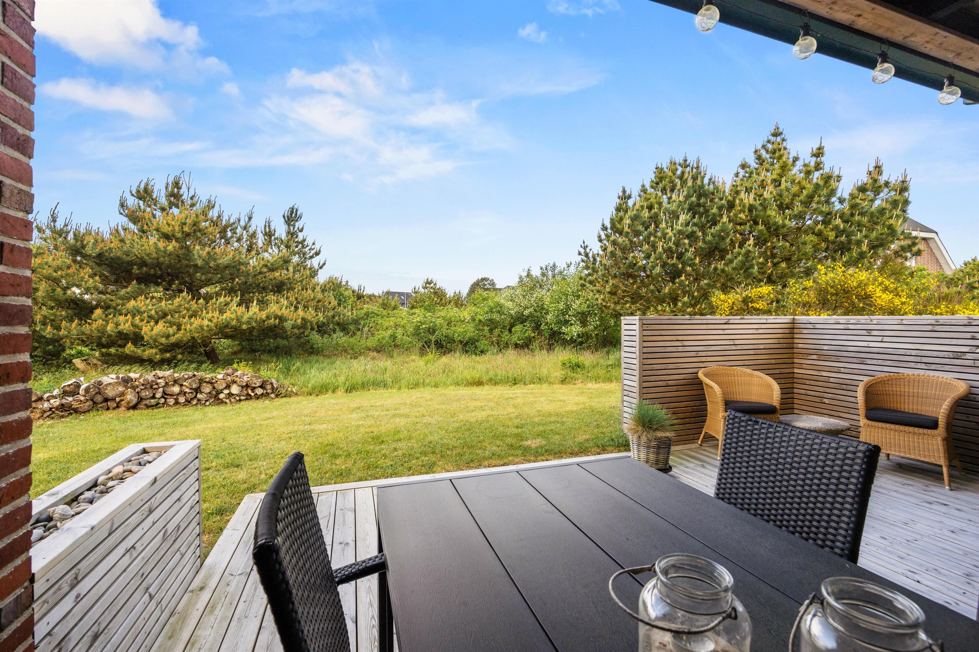 Der er mange dejlige hjørner omkring dette sommerhus, og der står solvogne og havemøbler klar til at I kan nyde dagen omkring feriehuset. Om aftenen kan I tænde op for grillen og nyde aftensolen på den overdækkede terrasse.