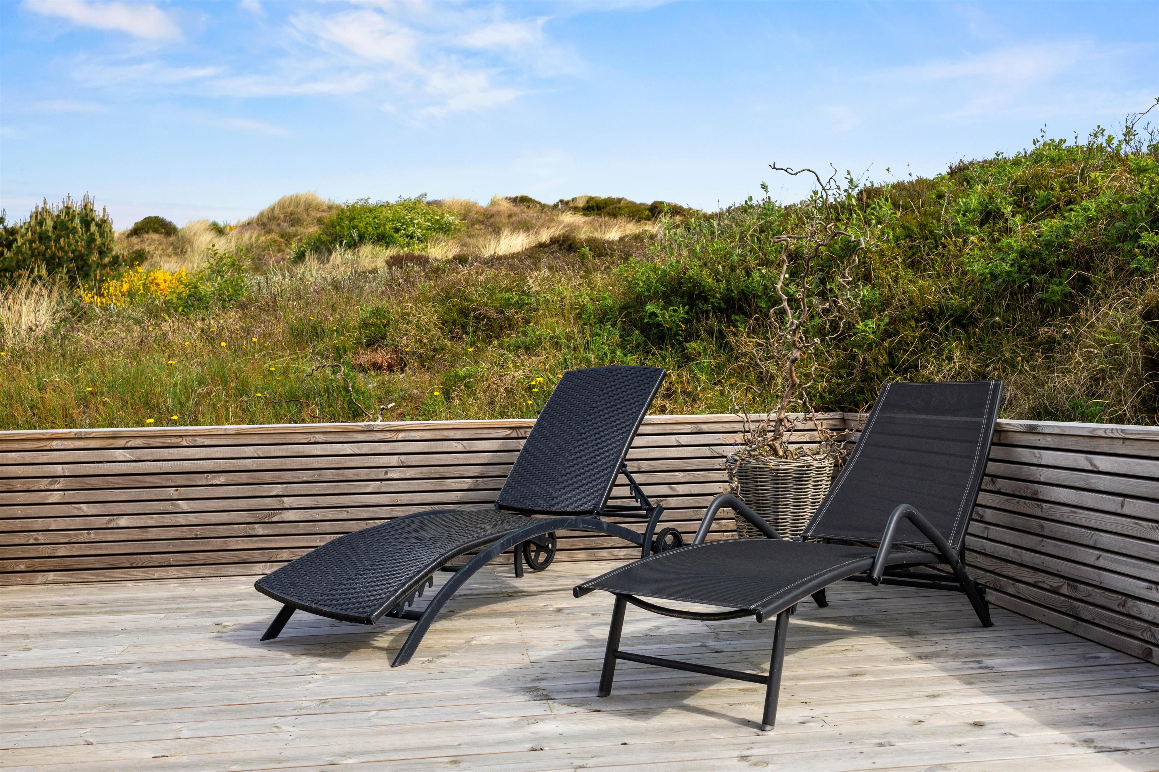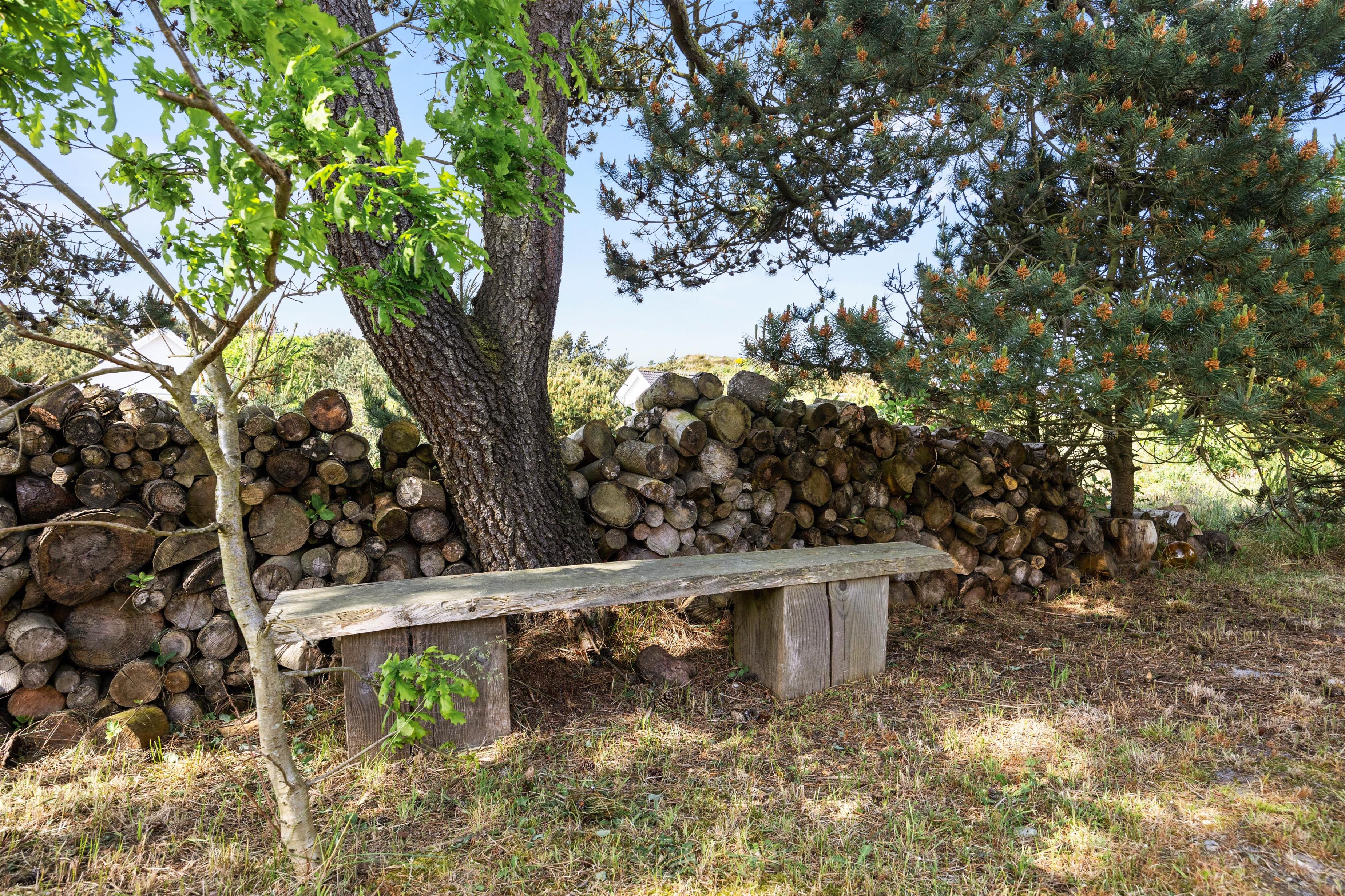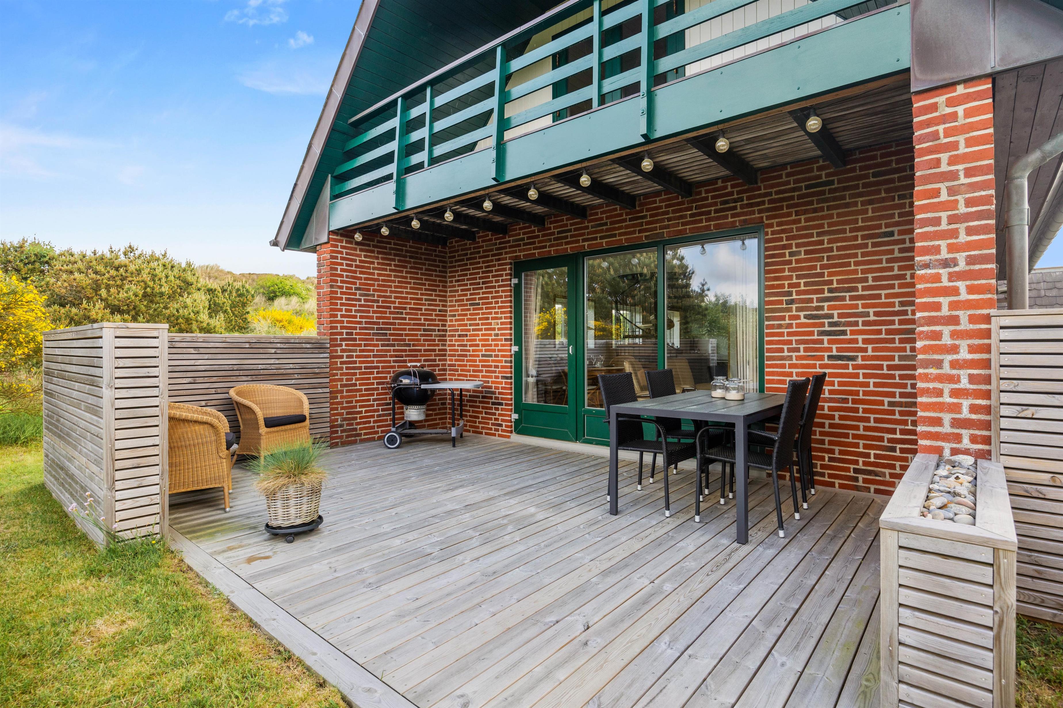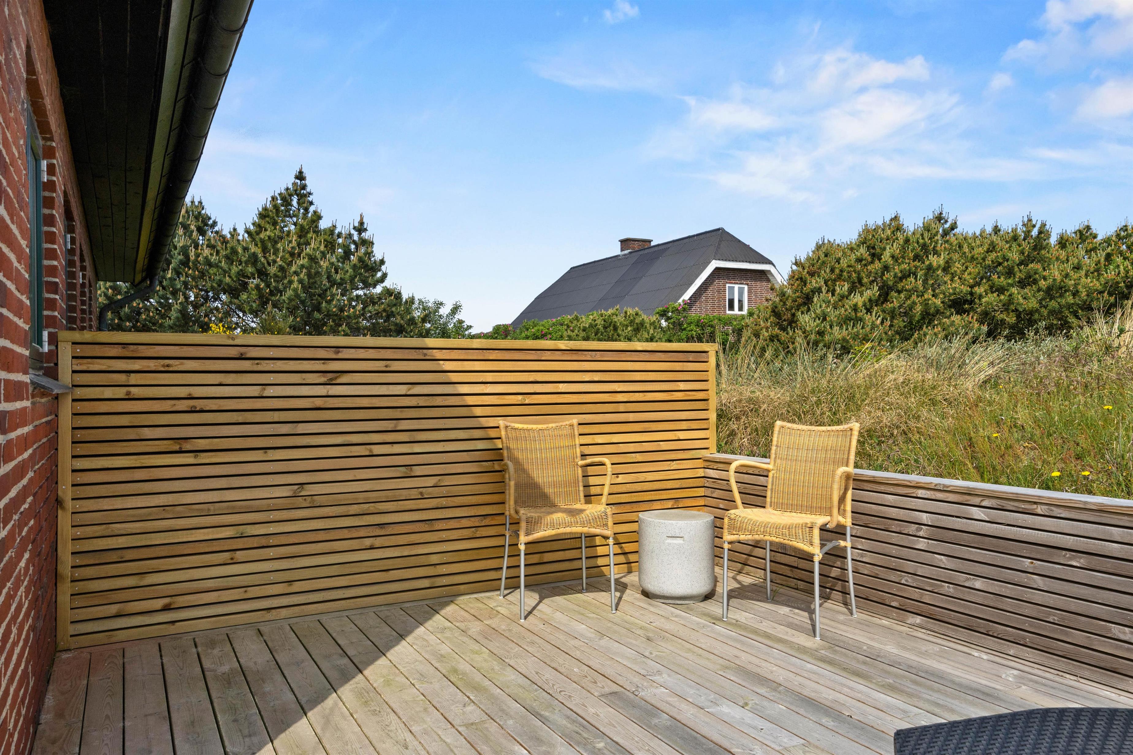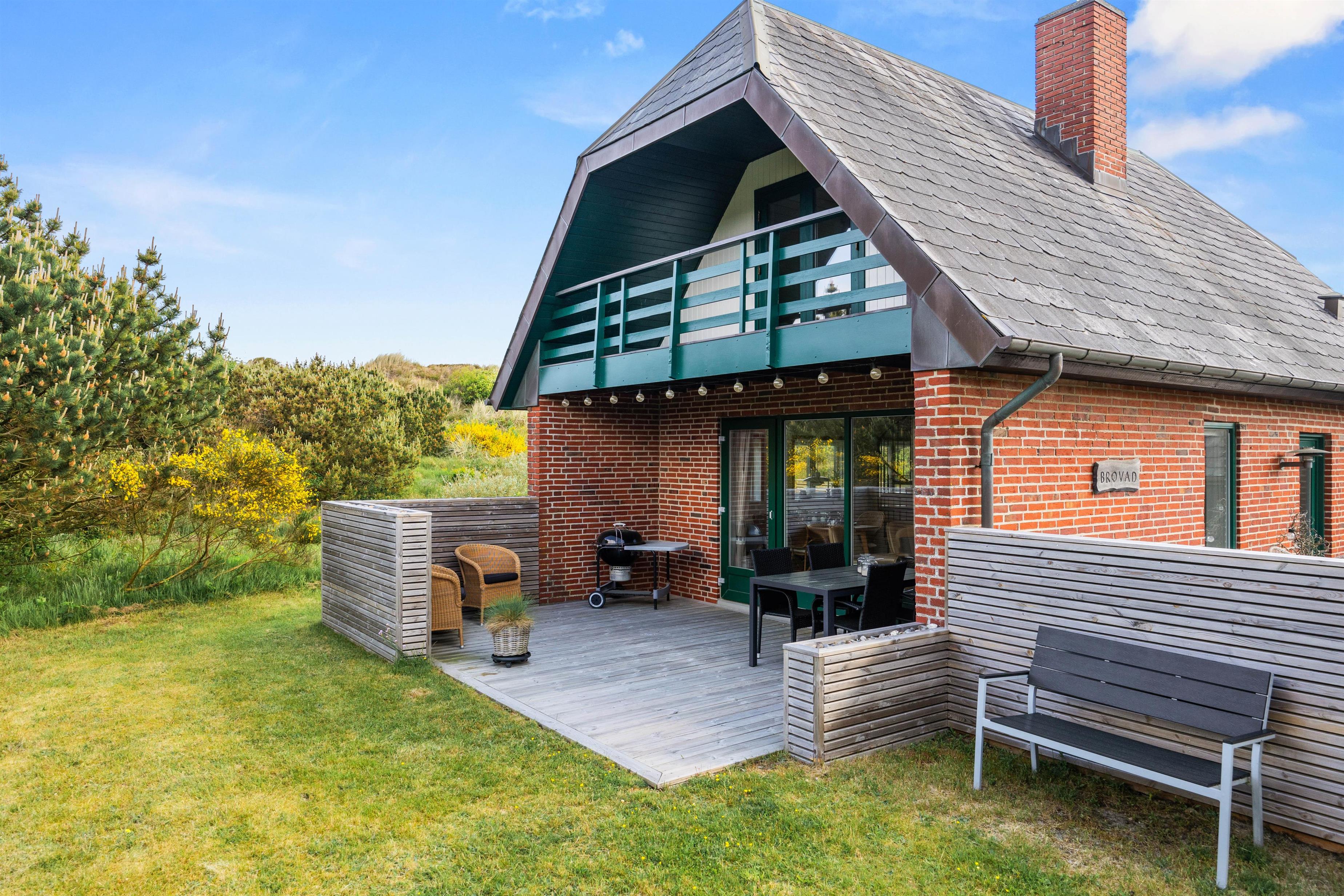Der er mange dejlige hjørner omkring dette sommerhus, og der står solvogne og havemøbler klar til at I kan nyde dagen omkring feriehuset. Om aftenen kan I tænde op for grillen og nyde aftensolen på den overdækkede terrasse.