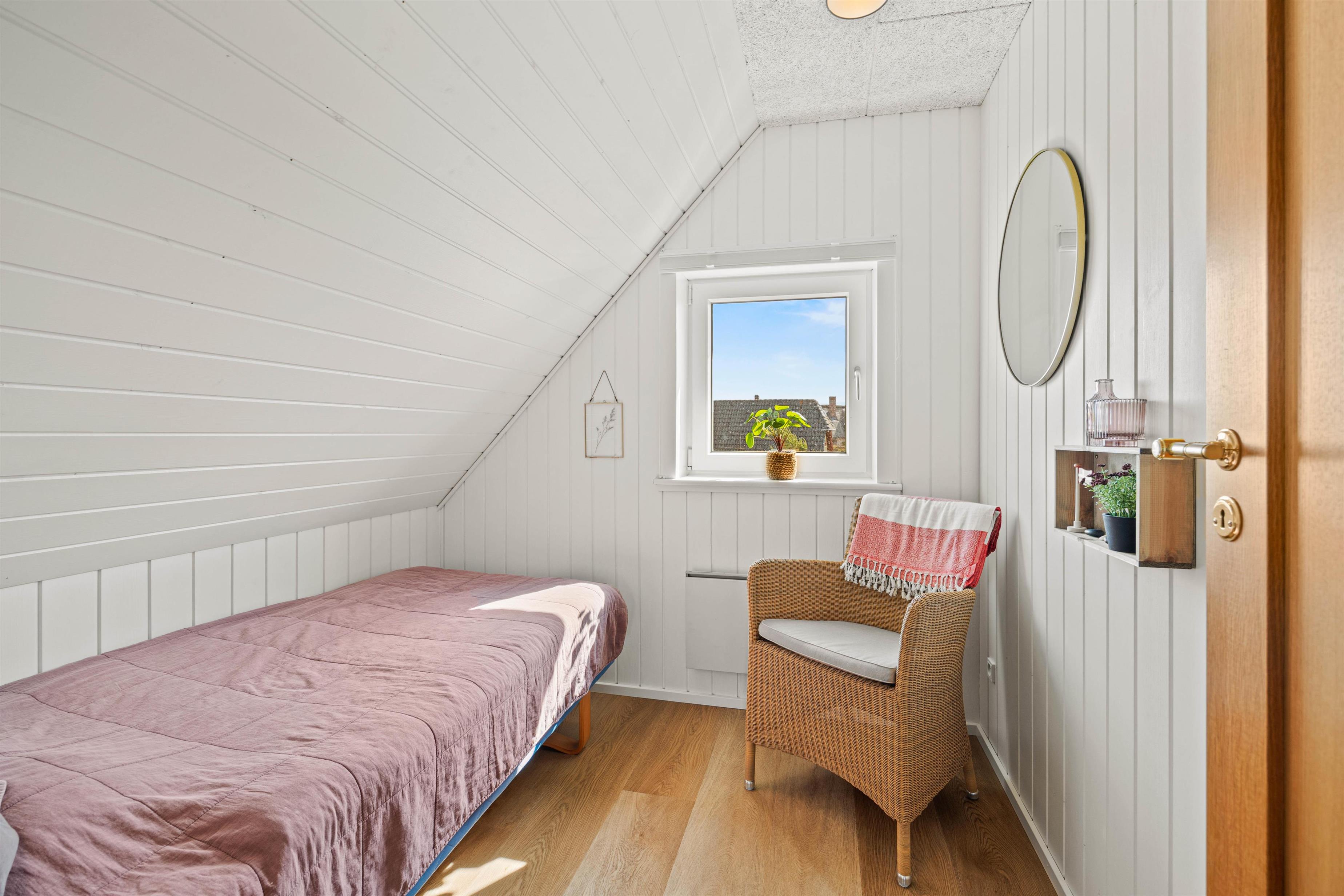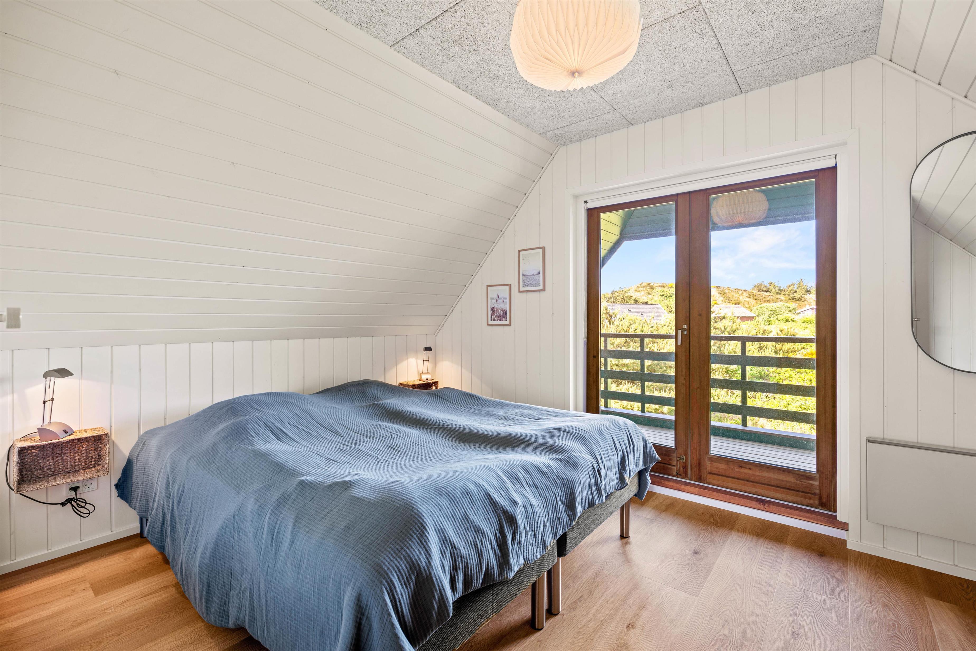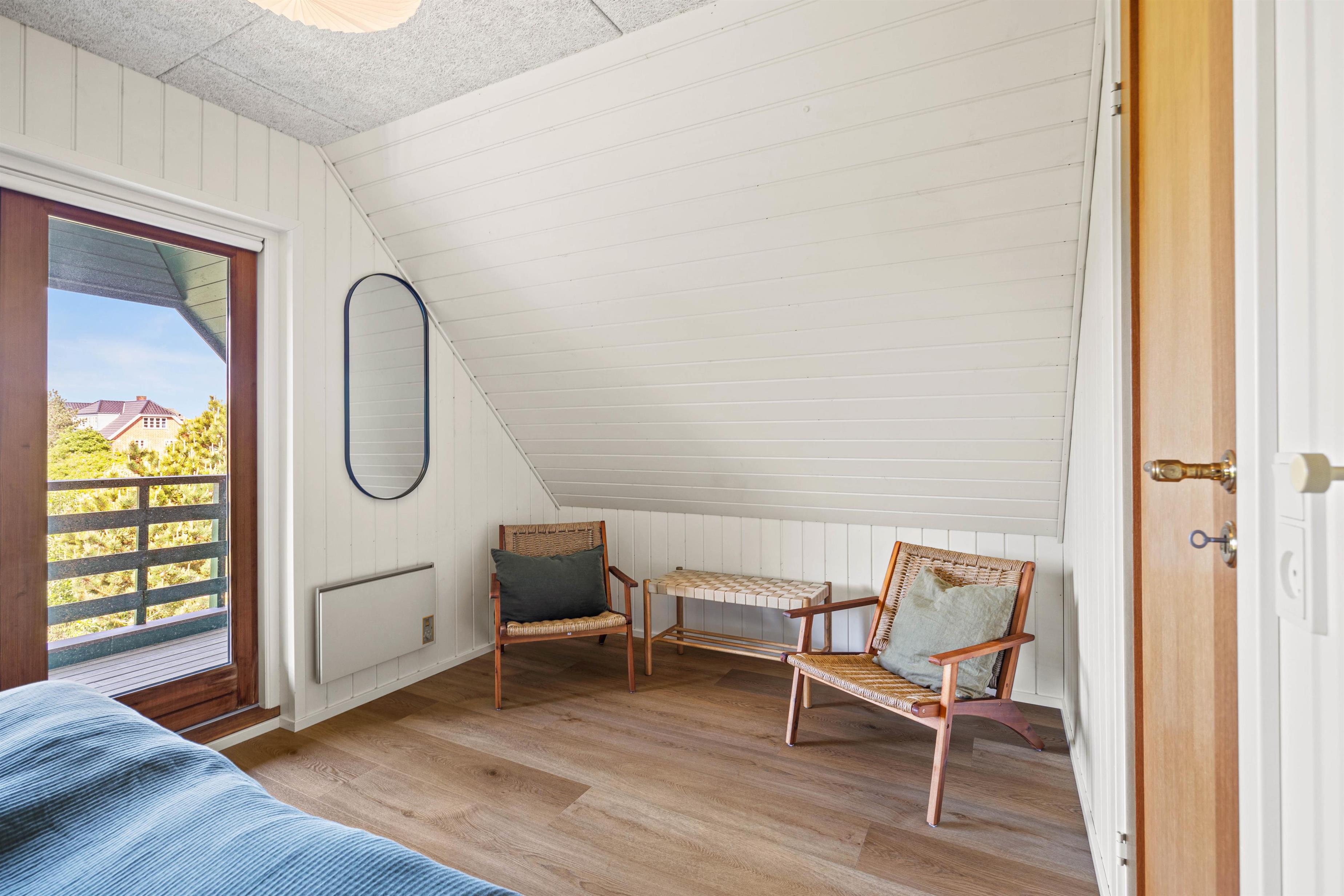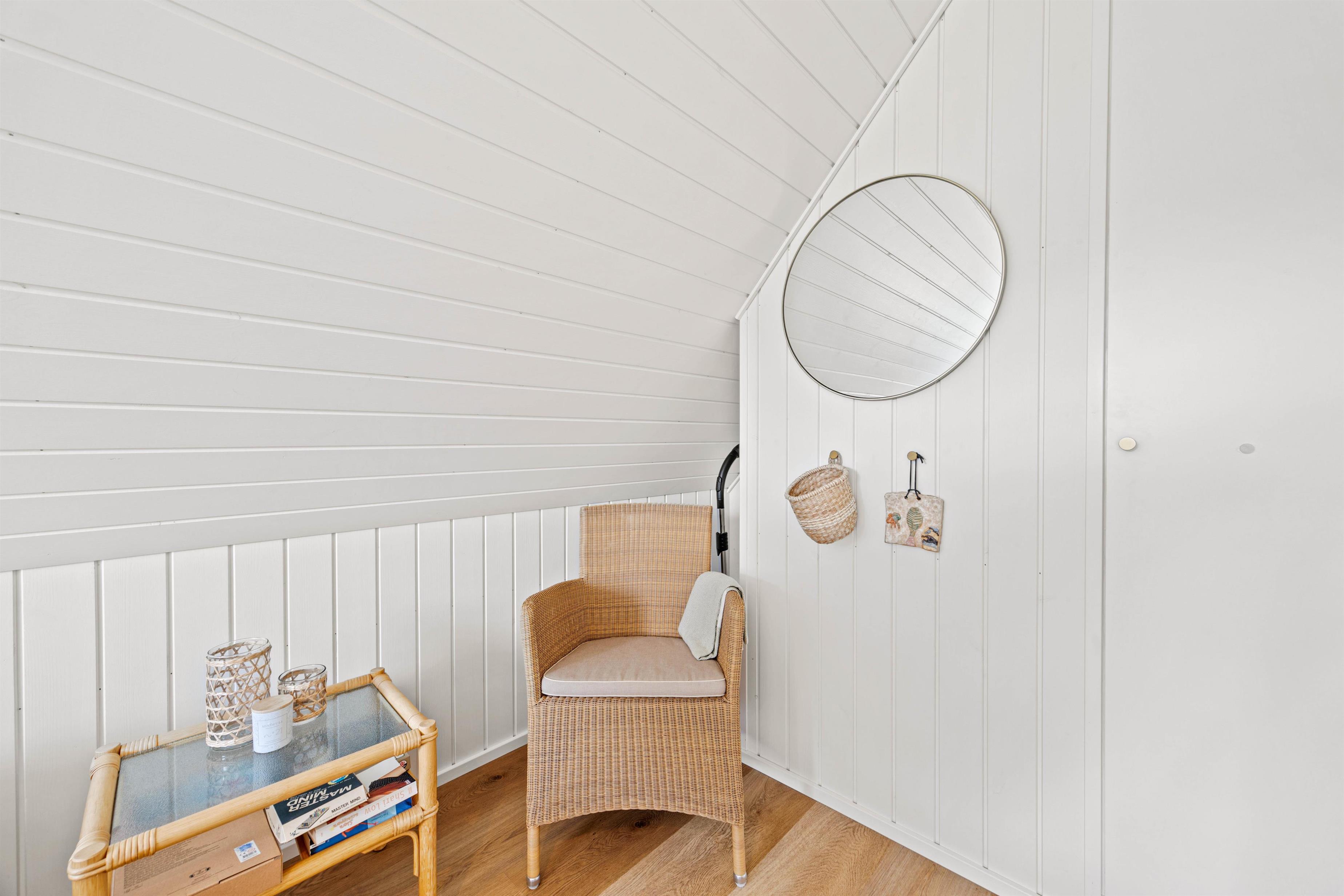 Det 83 m² store sommerhus byder desuden på 1 badeværelse med gulvvarme samt 3 gode soveværelser. Alle soveværelser ligger på 1. sal. Et af værelserne er indrettet med en dobbeltseng, det andet har 2 enkeltsenge og det tredje soveværelse er indrettet med en enkeltseng.
