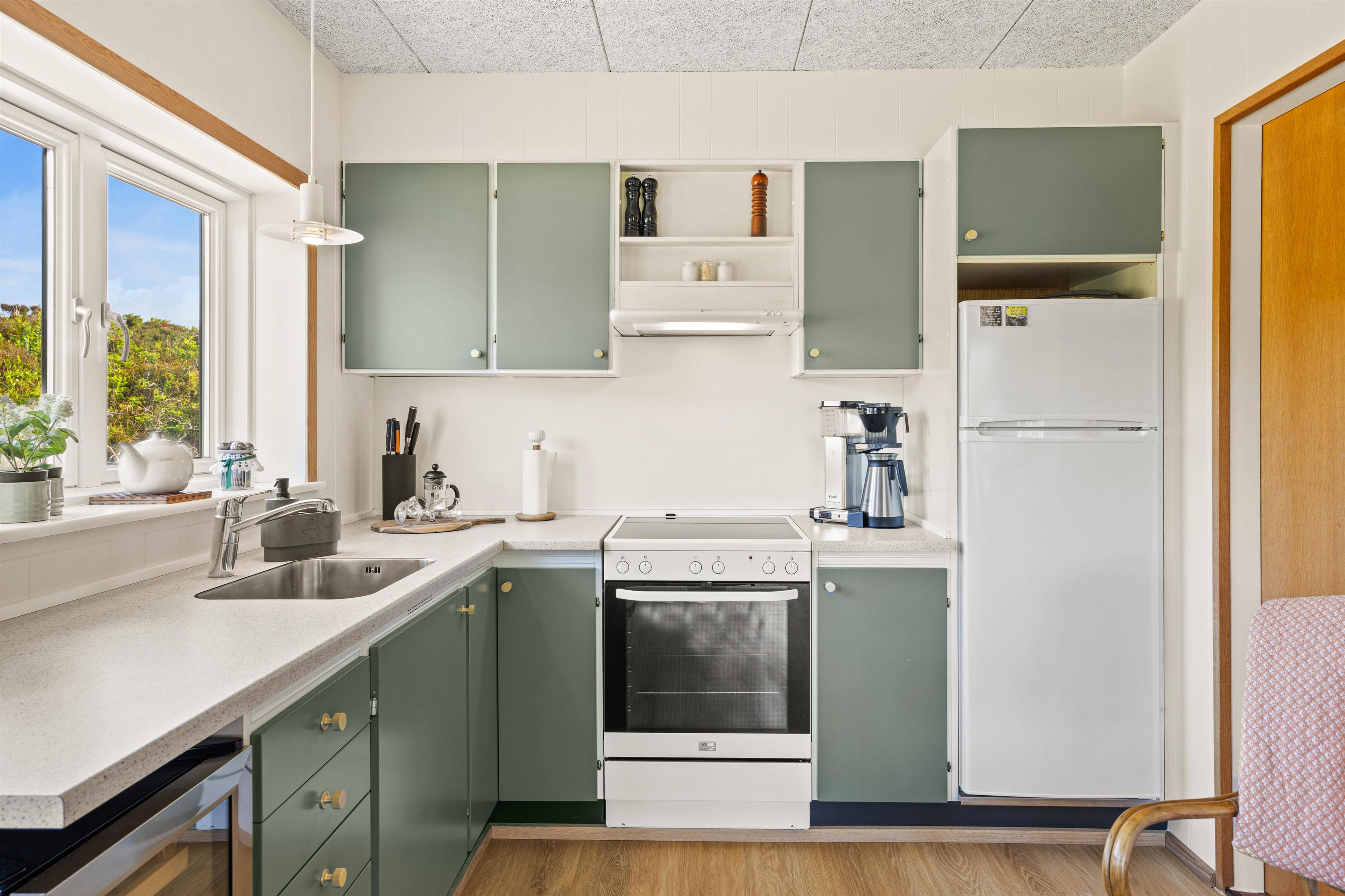 Det store fællesrum med åbent køkken, spise- og opholdsstue er det oplagte samlingssted for familiehyggetid: her har I mulighed for at være sammen om at se film, spille spil og lave mad. Der er gulvvarme i stuen, men sommerhuset er også udstyret en energivenlig varmepumpe, som sørger for en behagelig temperatur til lave omkostninger.