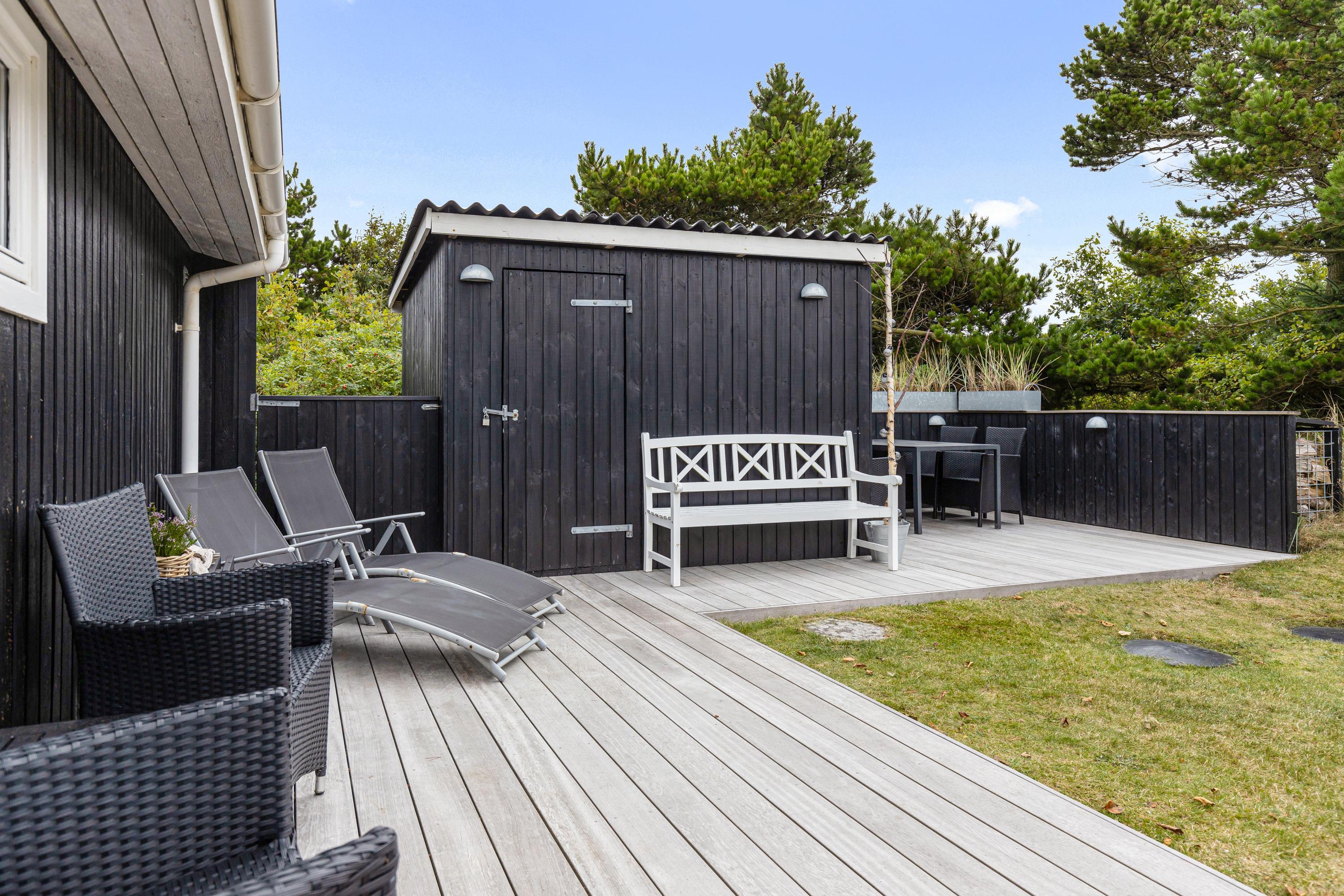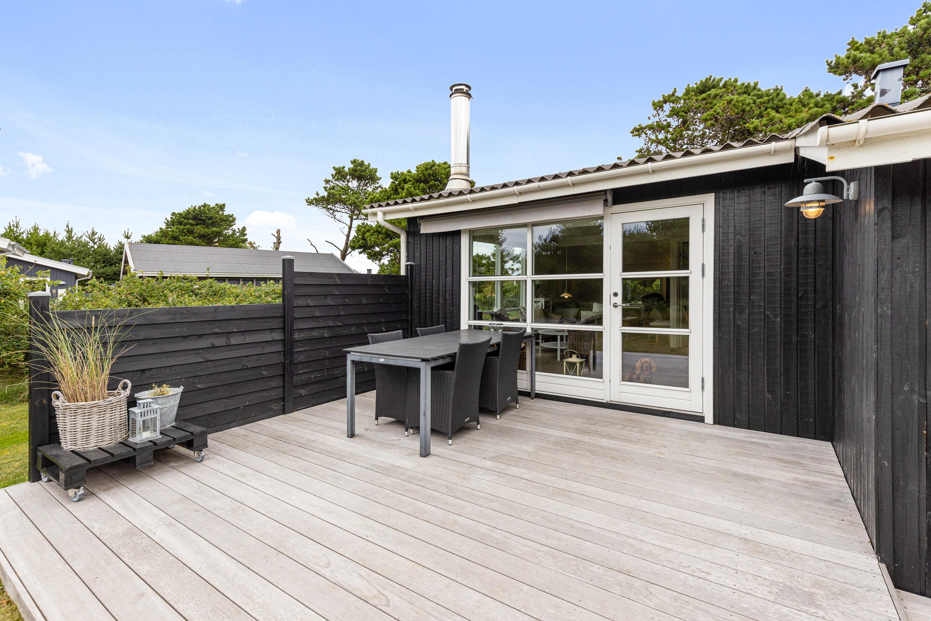 Fra stuen kan I træde ud på sommerhusets terrasse, der er åben og delvist afskærmet. På terrassen kan I sætte jer godt til rette i havemøblerne og liggestolene og nyde de solskinsfyldte feriedage. Sommerhusets grund er omgivet af træer, så I har masser af privatliv på ferien.