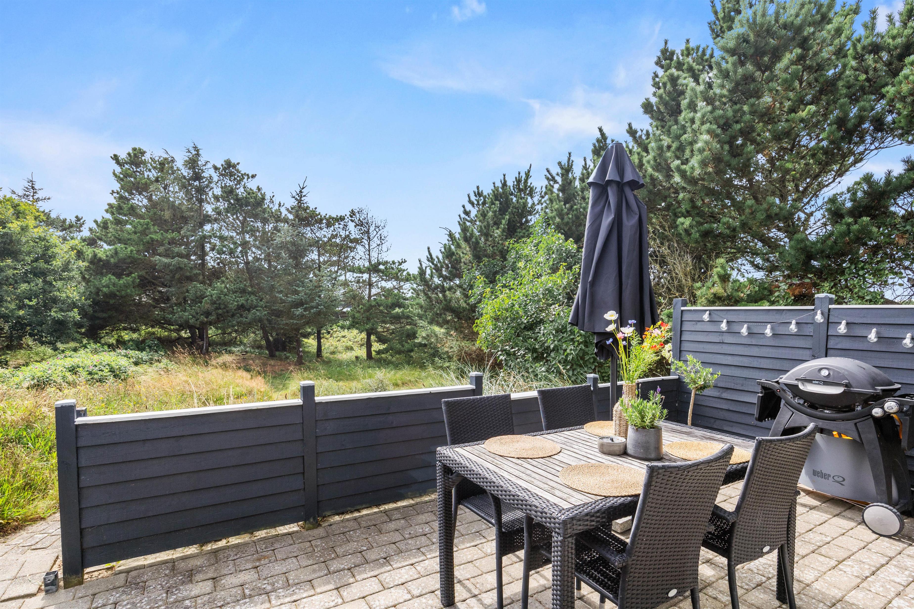 Den smukke, afskærmede grund og en delvist overdækket terrasse og yderligere solterrasser bør fremhæves. Dette sommerhus ligger i klitlandskabet, omgivet af fyrretræer og buske, så du kan nyde et hyggeligt privatliv.
