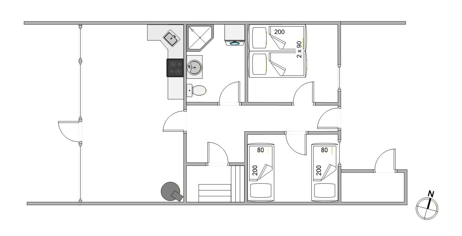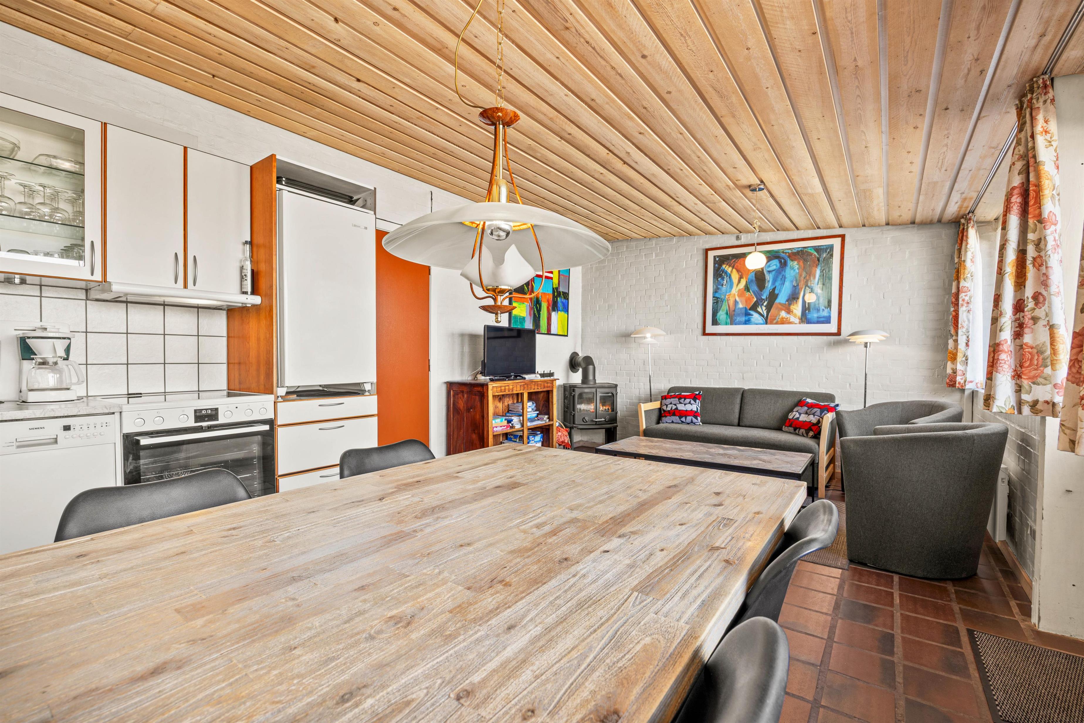 I får 58 m² bolig til rådighed, hvor køkken, spiseområde og stue er samlet i ét. Her kan I tilberede dagens måltider og overlade opvasken til opvaskemaskinen bagefter. Uanset om I spiller spil ved spisebordet eller slapper af i sofaen med en god bog, er der lagt op til ro og afslapning. På kølige aftener bidrager brændeovnens knitren til en ekstra hyggelig feriestemning.