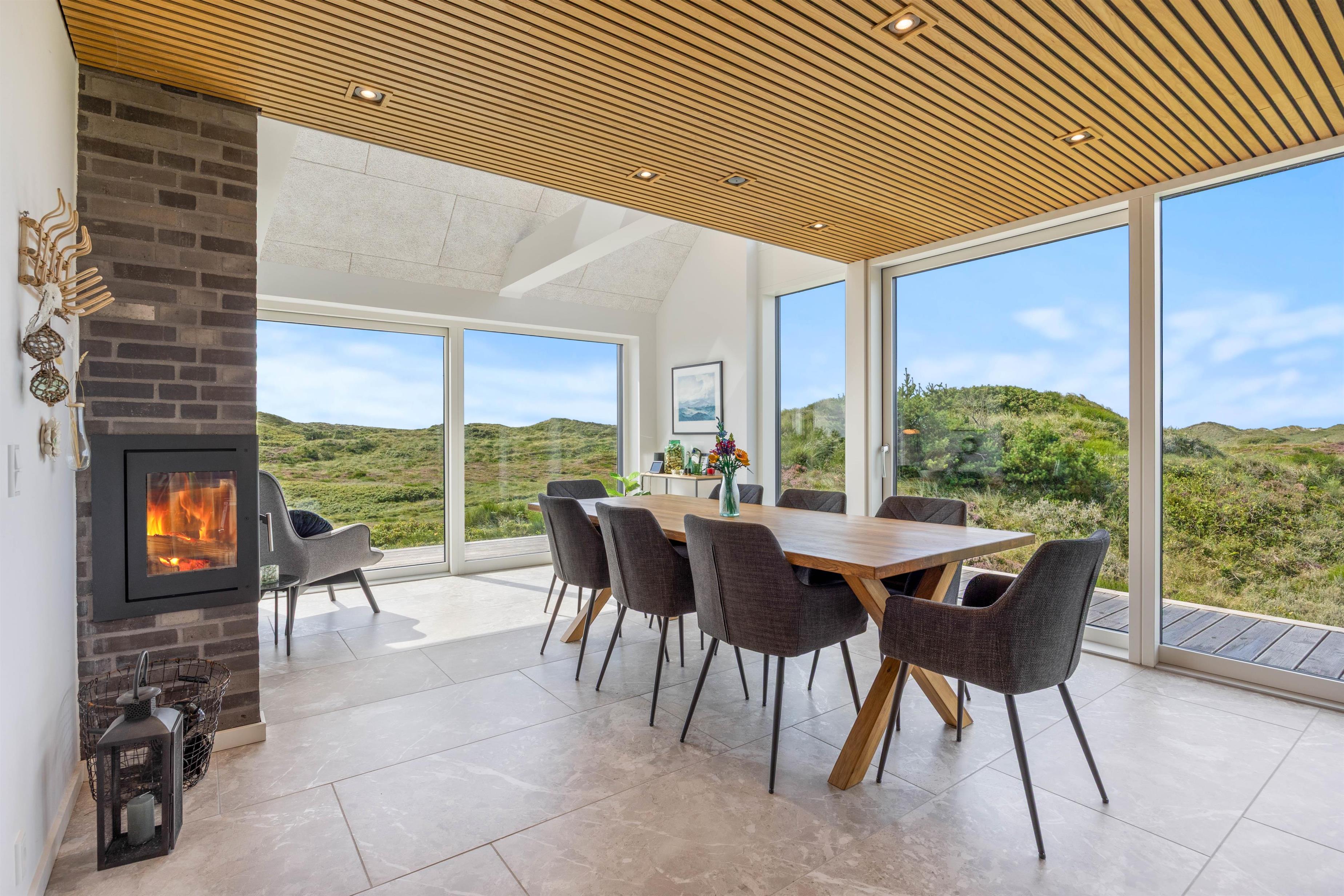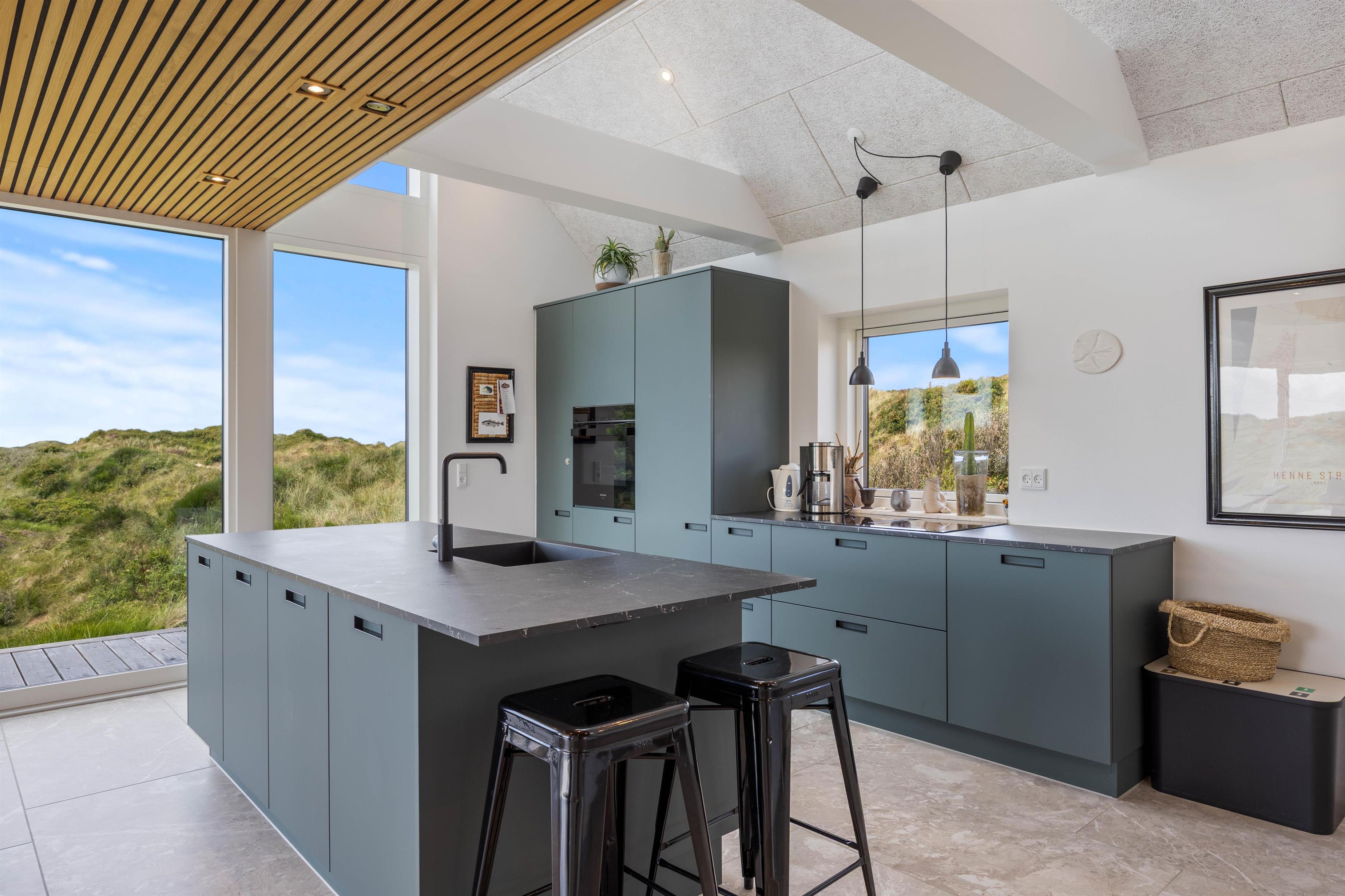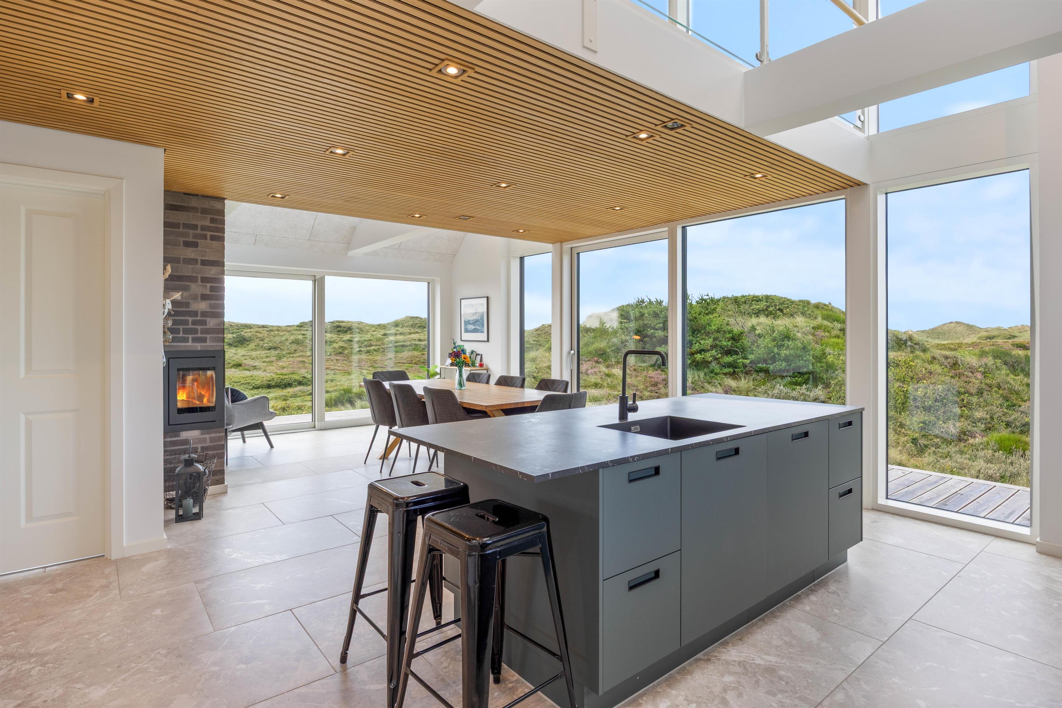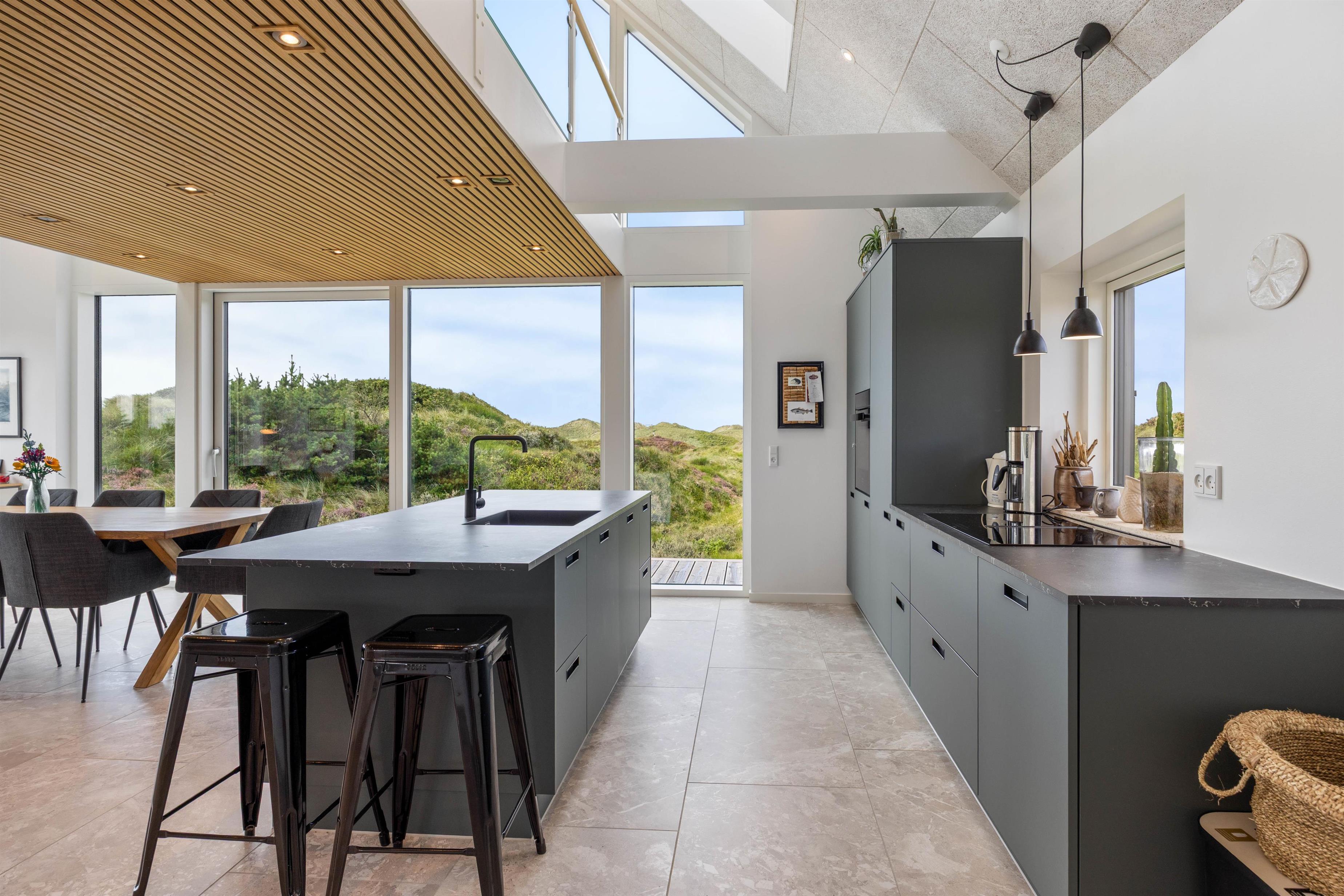 Videre hen kommer de første soveværelser samt et lyst badeværelse, inden I kommer til feriehusets velindrettede køkken og spisestue: de store glaspartier i dette rum giver ikke blot et fantastisk lysindfald, men også en enestående udsigt over klitterne med Vesterhavet i baggrunden.