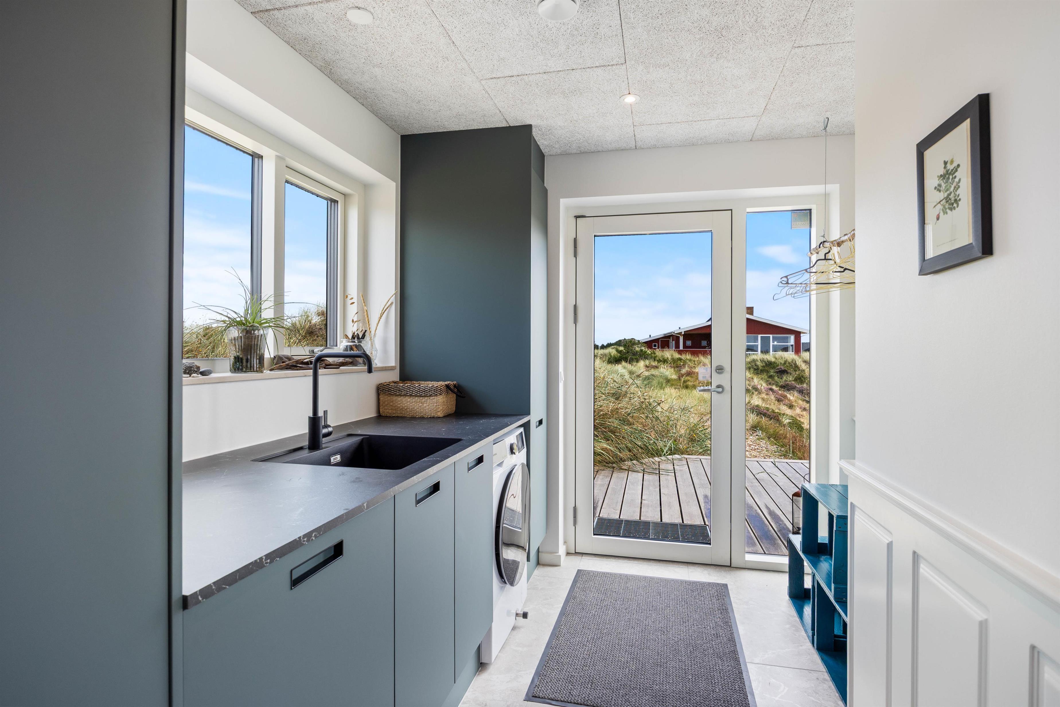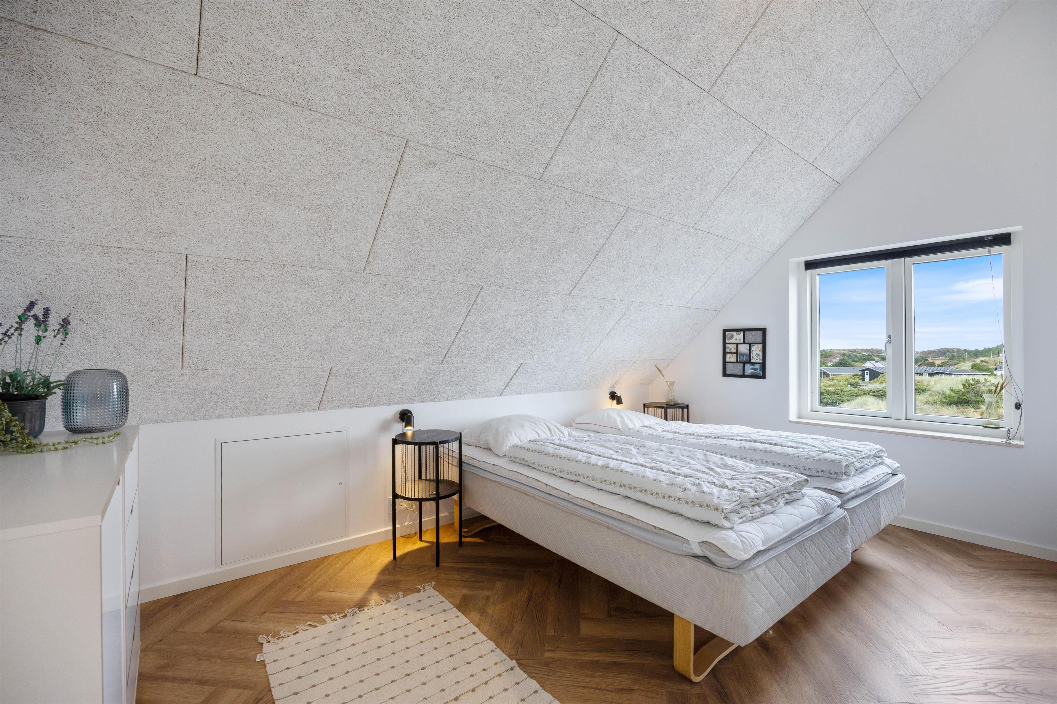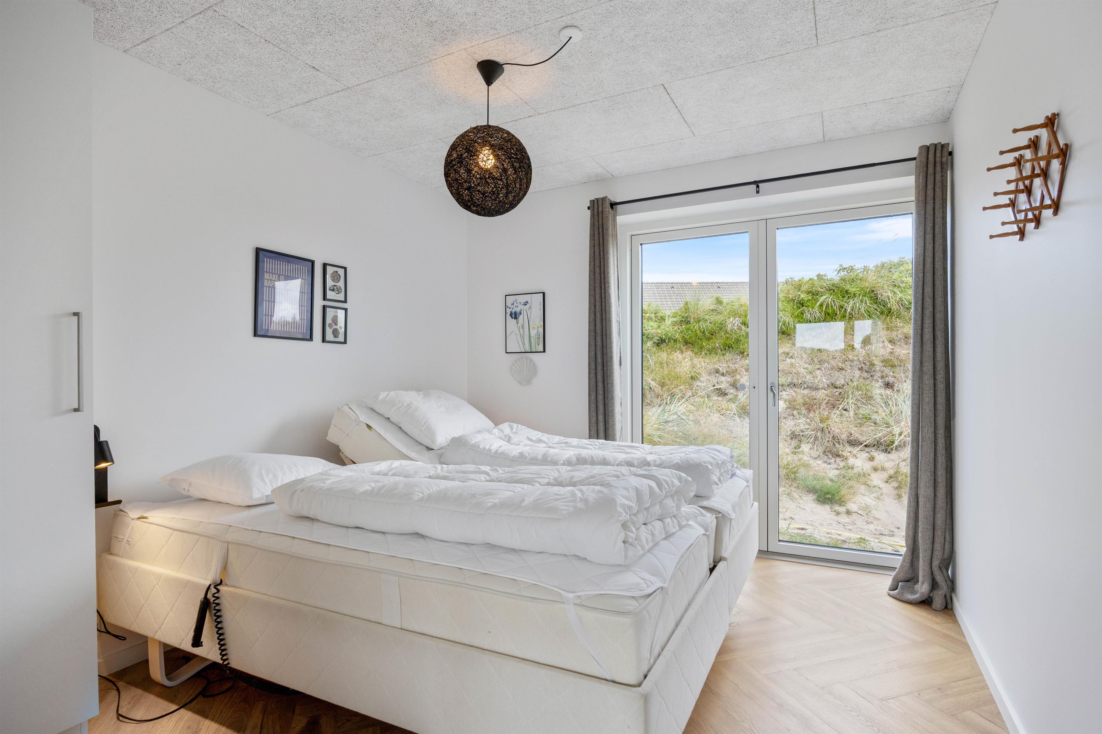 Videre hen kommer de første soveværelser samt et lyst badeværelse, inden I kommer til feriehusets velindrettede køkken og spisestue: de store glaspartier i dette rum giver ikke blot et fantastisk lysindfald, men også en enestående udsigt over klitterne med Vesterhavet i baggrunden.