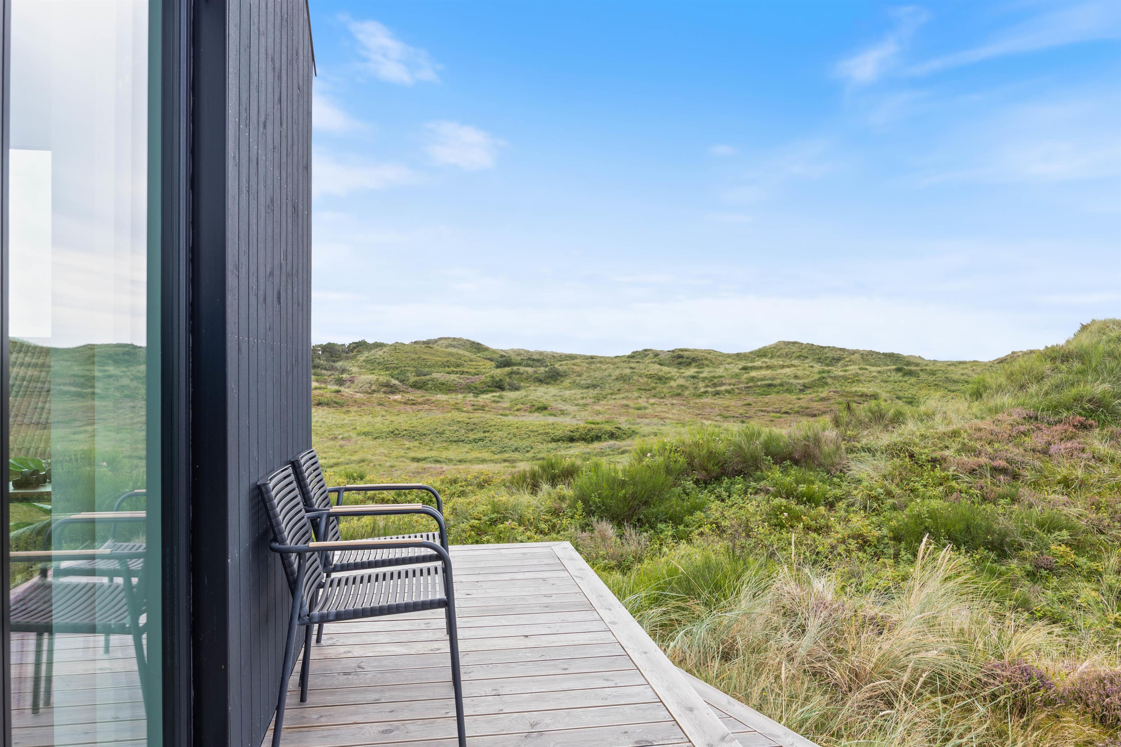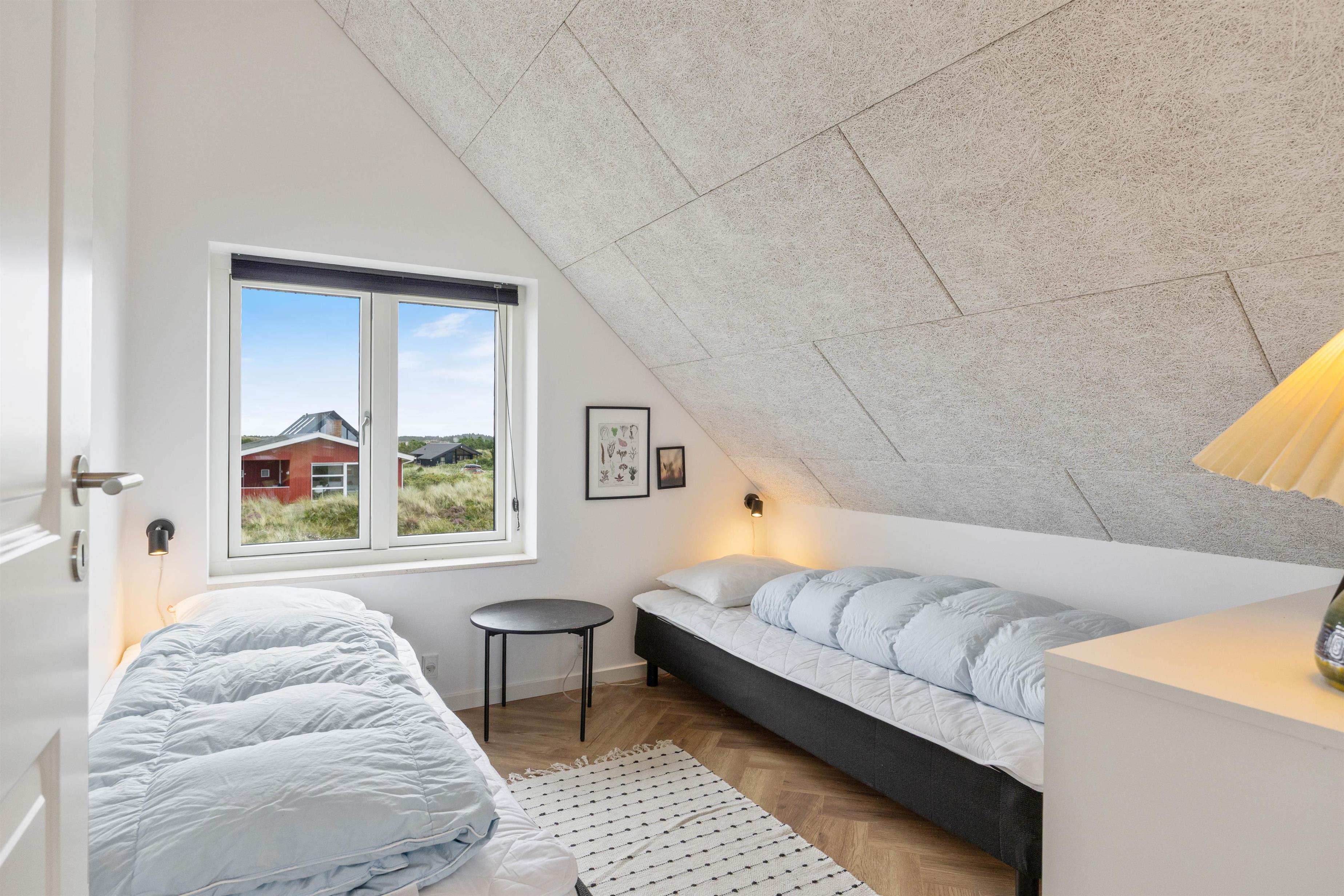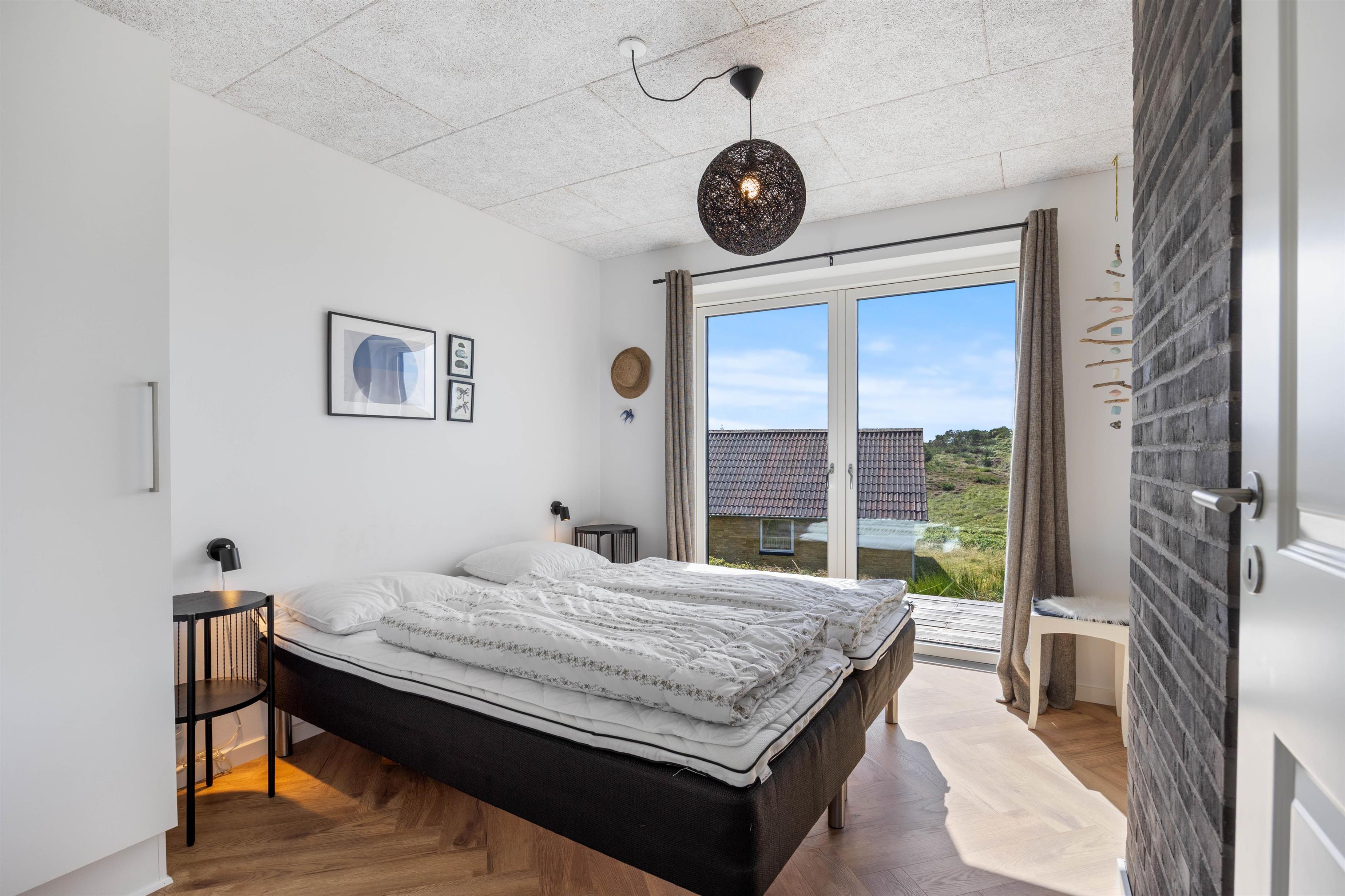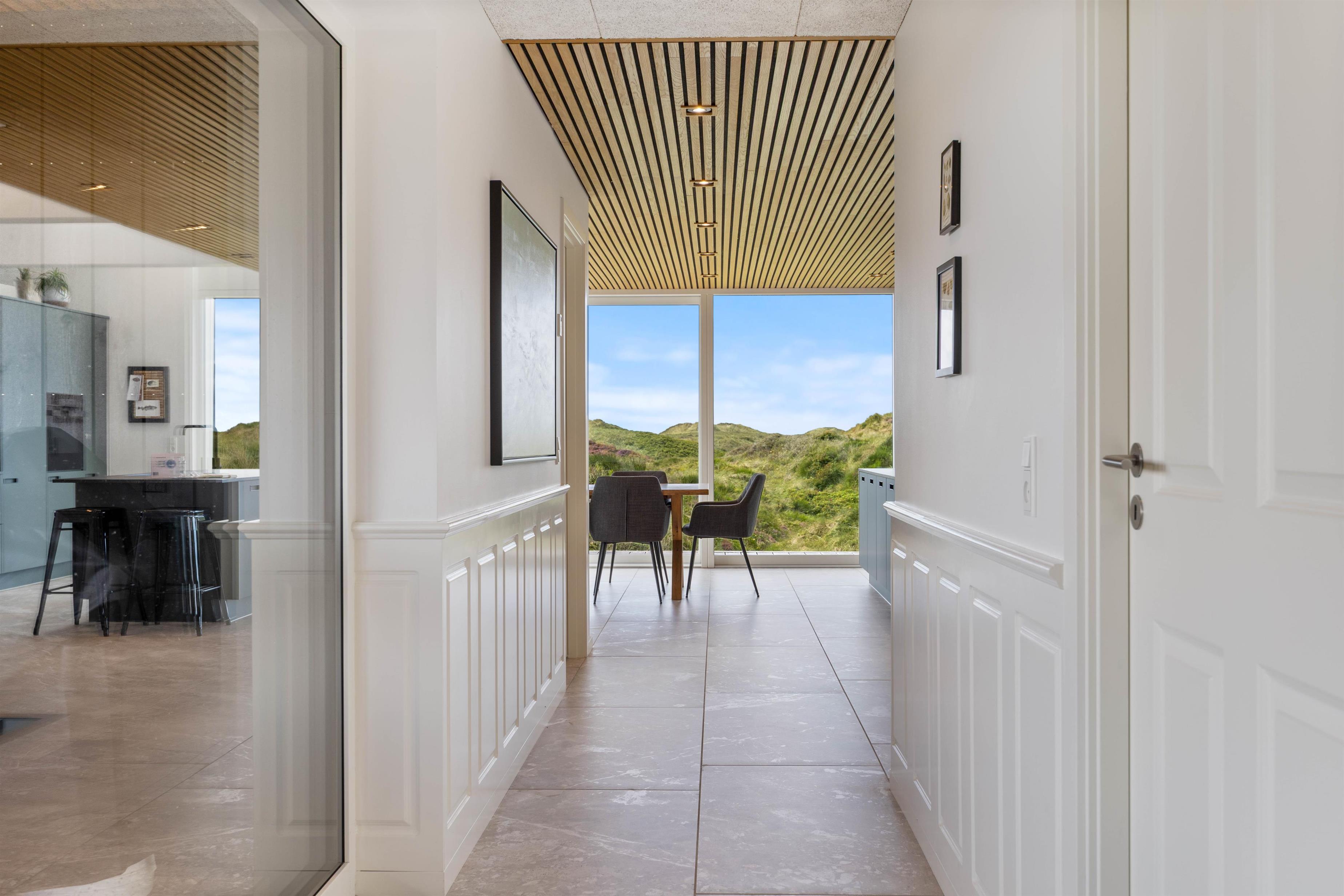 Videre hen kommer de første soveværelser samt et lyst badeværelse, inden I kommer til feriehusets velindrettede køkken og spisestue: de store glaspartier i dette rum giver ikke blot et fantastisk lysindfald, men også en enestående udsigt over klitterne med Vesterhavet i baggrunden.