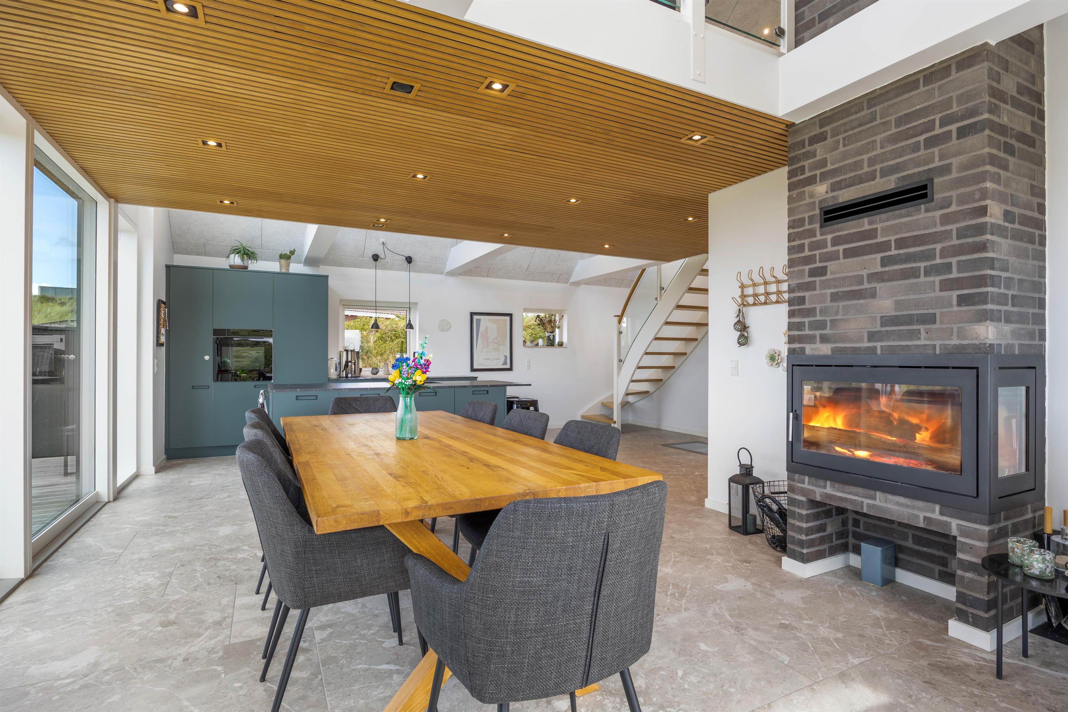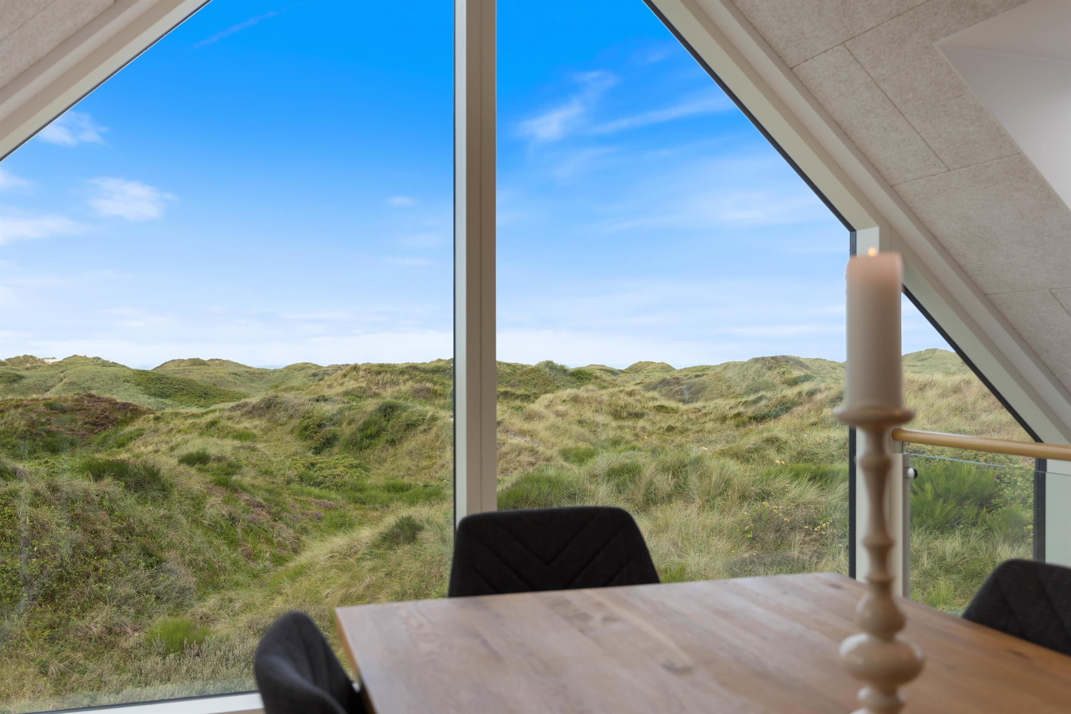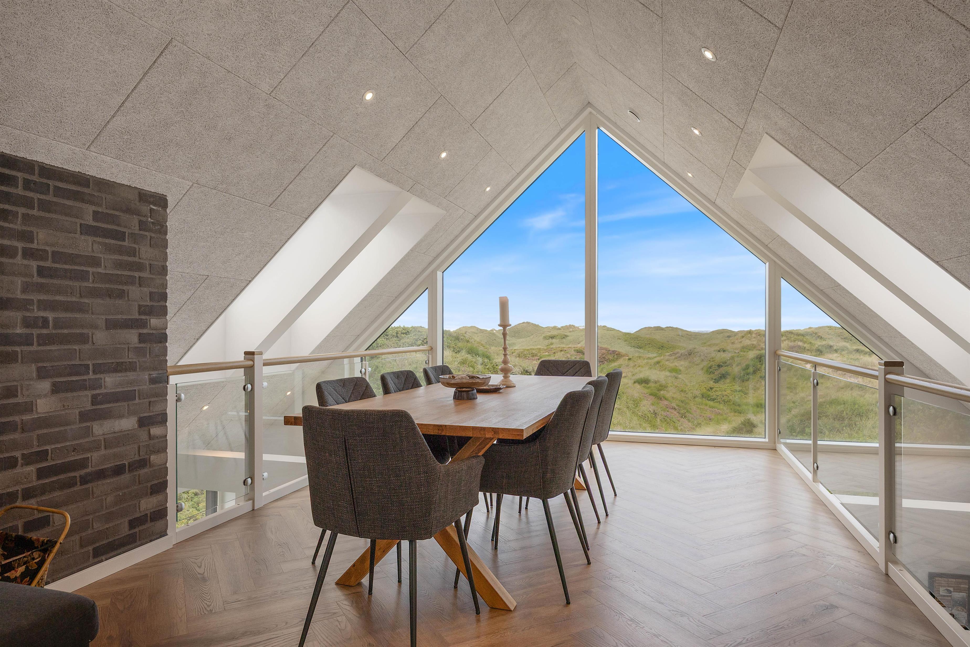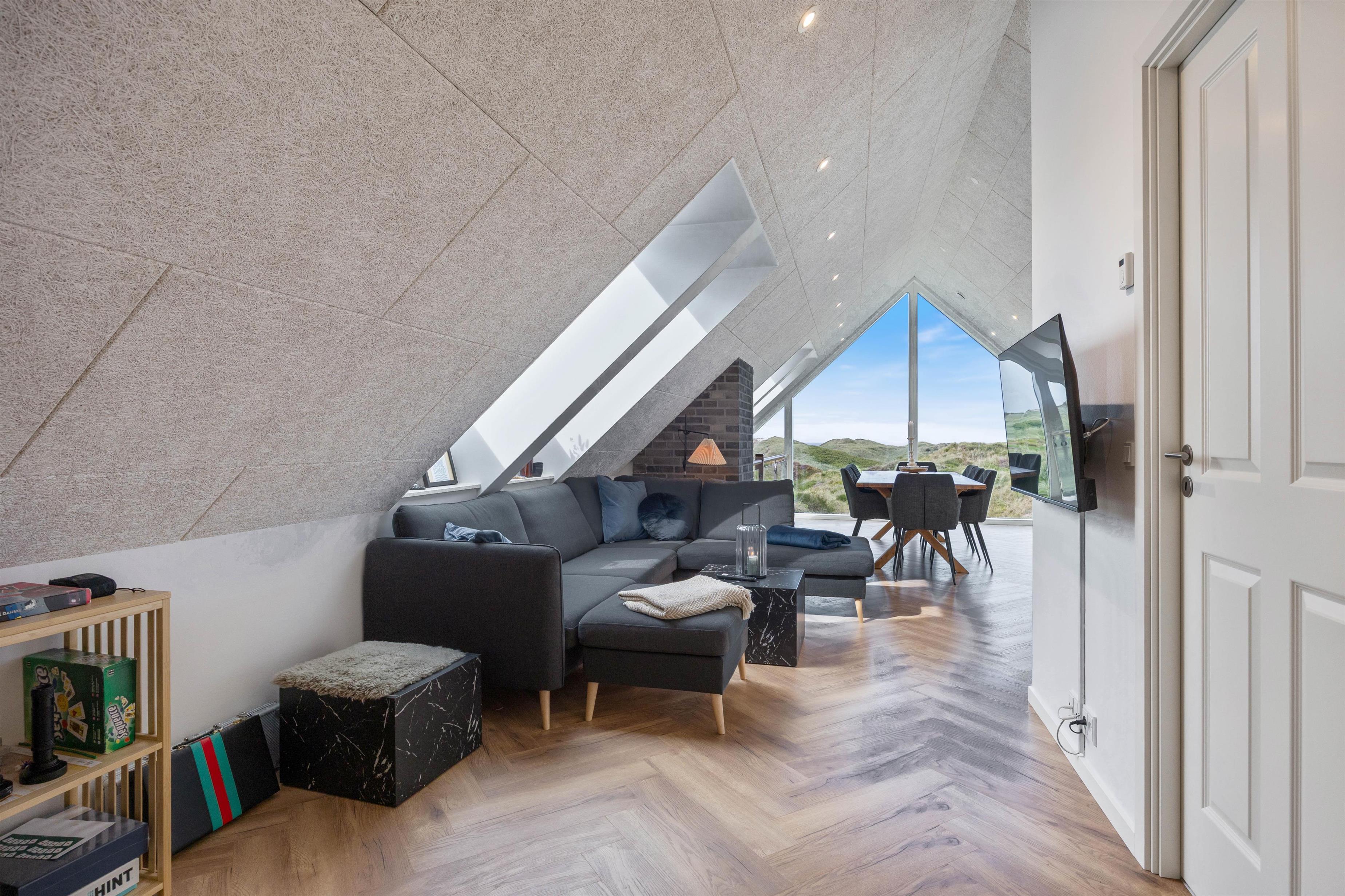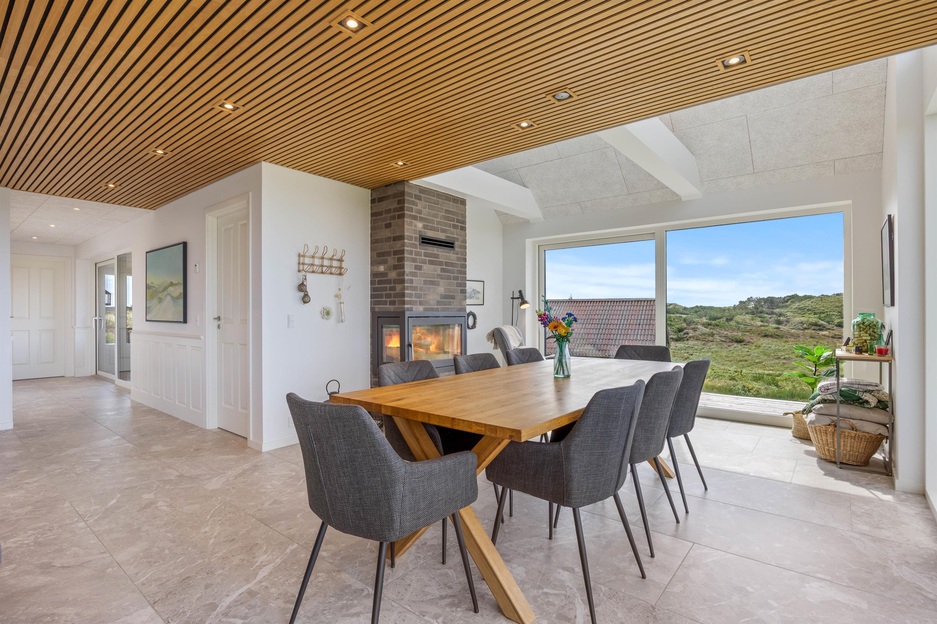 Fra spisestuen fører en trappe jer op på 1. sal, hvor de velplacerede vinduer bidrager til, at den storslåede udsigt over både klitområdet og Vesterhavet også kan nydes herfra: her lægger både sofa og den komfortable spisestue op til hygge med spil og gode snakke, imens I kan betragte landskabet og naturen omkring.
