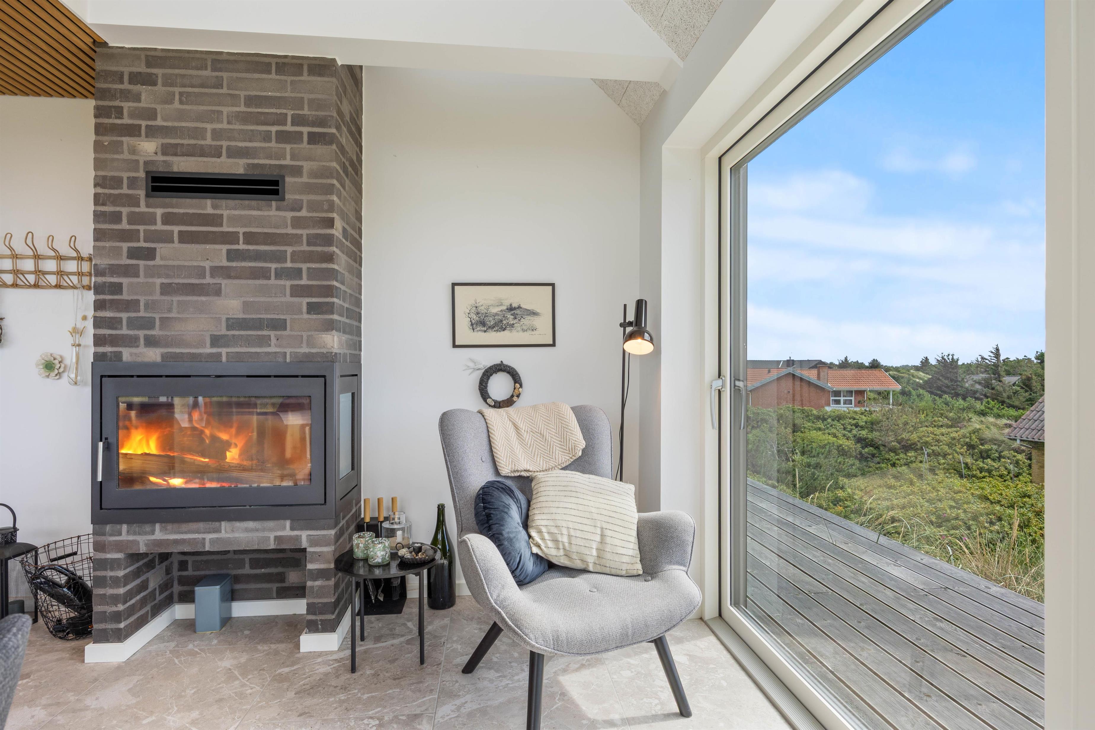 I dette rum forefindes der også feriehusets pejs, og med lænestolen placeret lige ved siden af er det et oplagt sted for at nyde udsigten eller også for at læse en god bog, mens pejsens varme nydes. Udover pejsen er der installeret en varmepumpe, der sørger for en behagelig temperatur i alle rum.