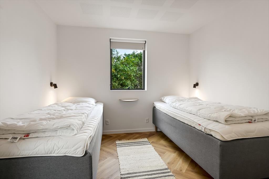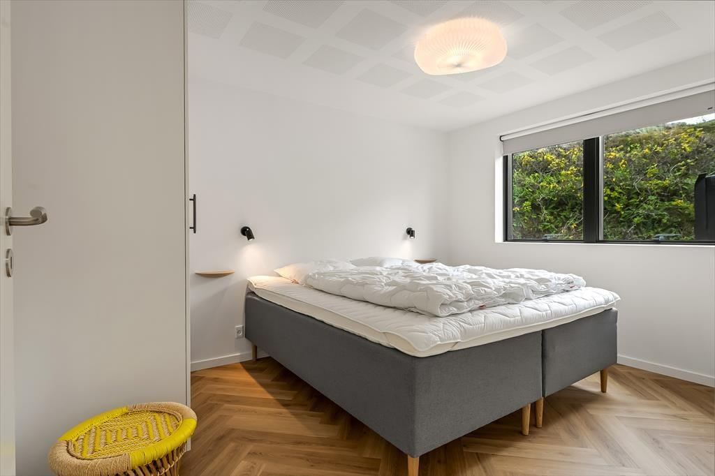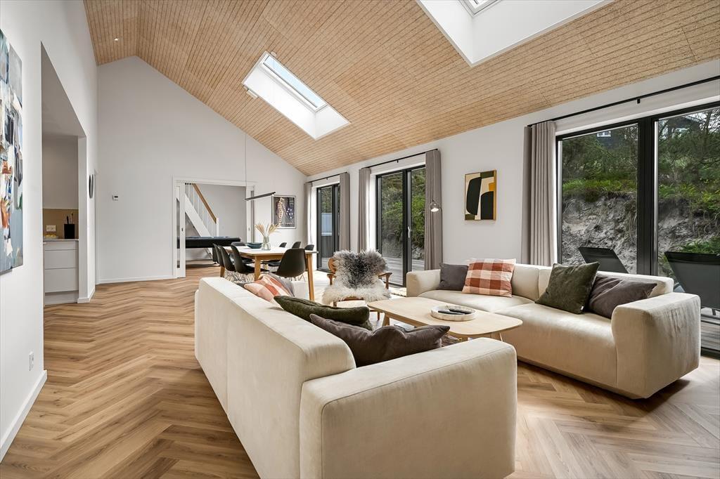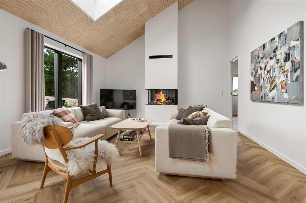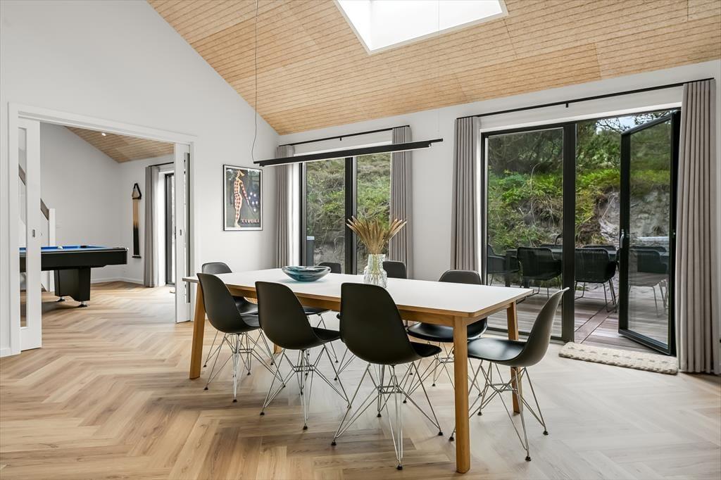 Når du træder ind i sommerhuset, mødes du af en lys og indbydende indretning, der straks sætter feriestemningen. Her kan du samles i det hyggelige opholdsrum, hvor de store vinduer lukker masser af dagslys ind og skaber en åben forbindelse til naturen udenfor. Køkkenet ligger i åben forbindelse med spisepladsen, så I kan være sammen om madlavningen eller nyde en kop kaffe og en god snak, mens maden simrer. Indretningen er skabt til afslapning, hvad enten du vil slænge dig med en bog, spille brætspil med familien eller bare lade tankerne drive. Her er plads til både fælles hygge og små stille stunder, hvor du kan mærke roen brede sig.