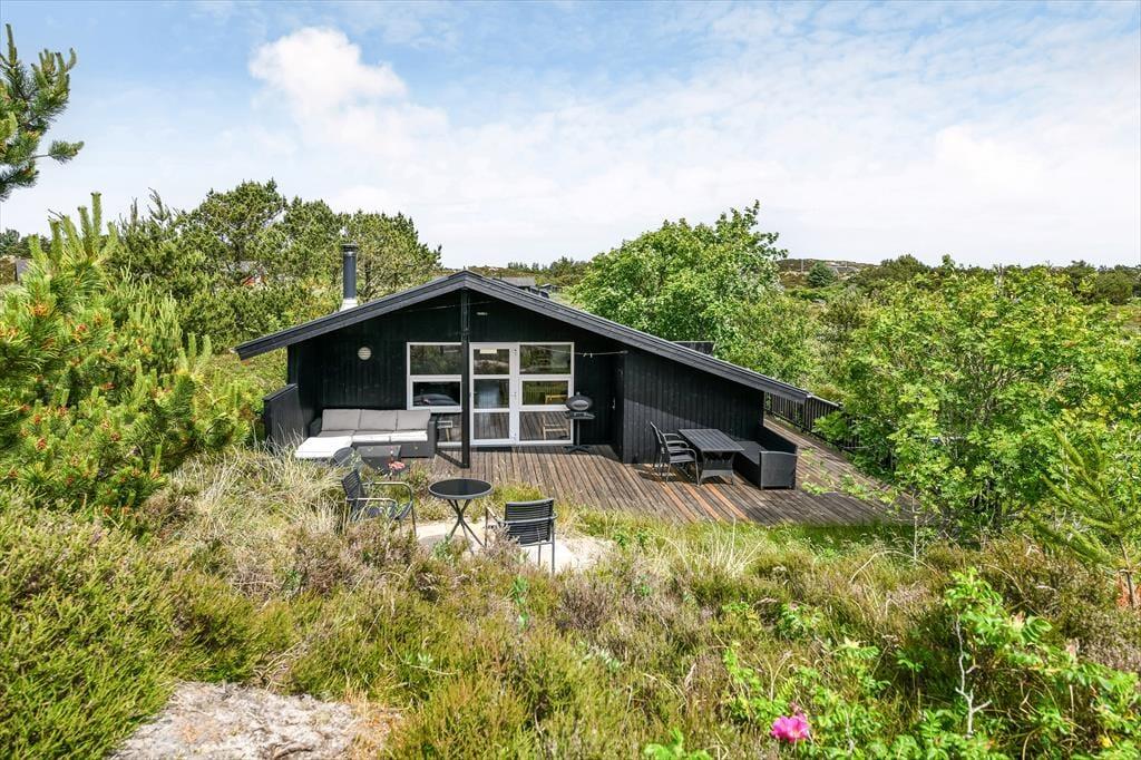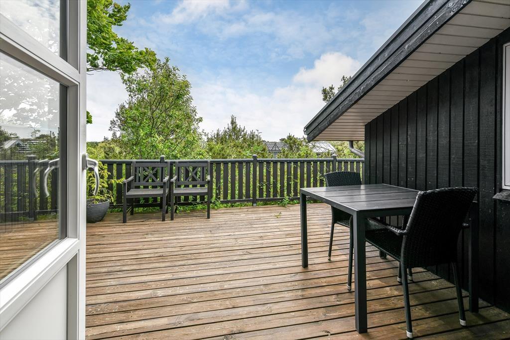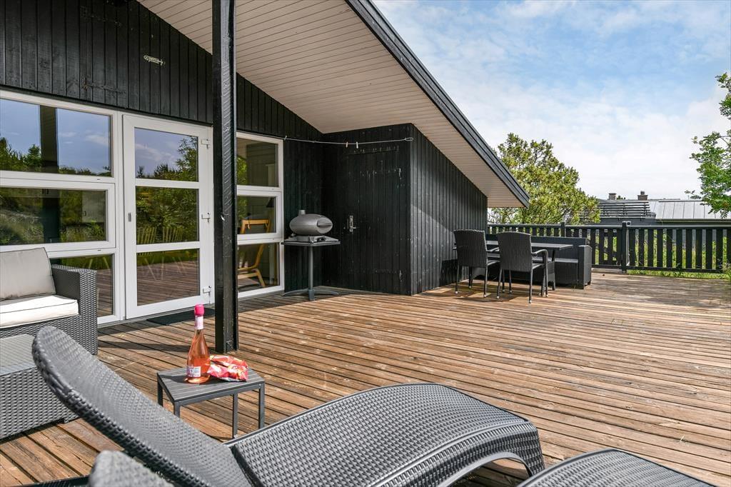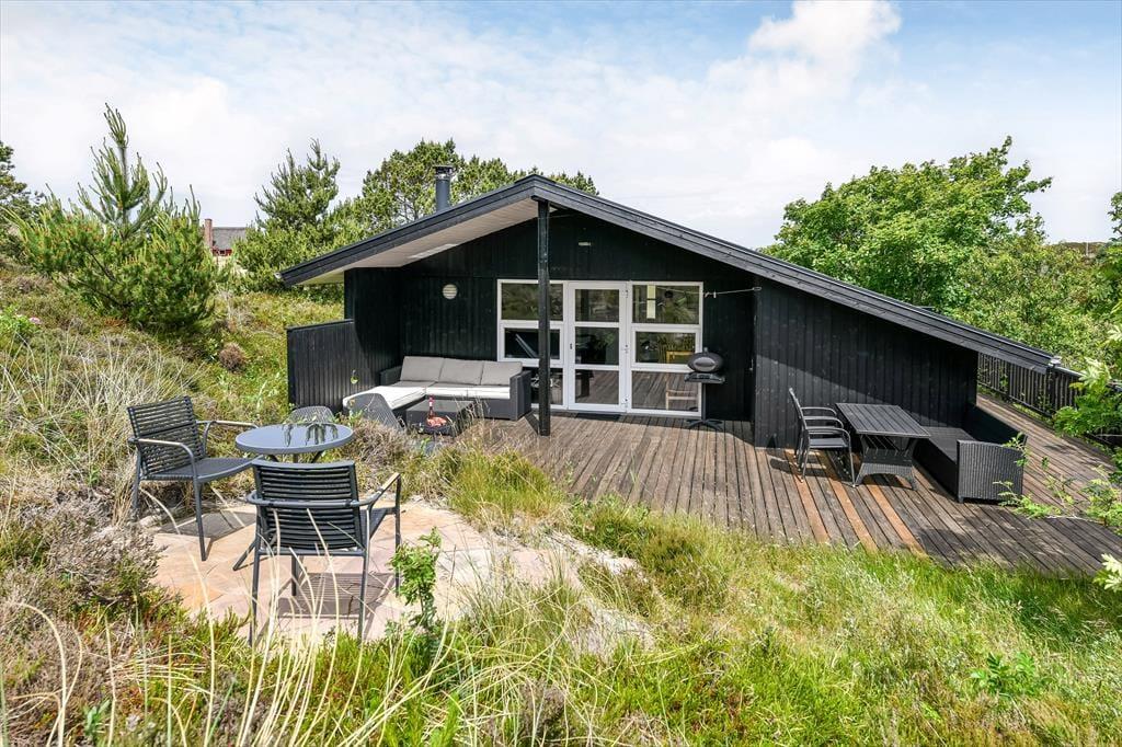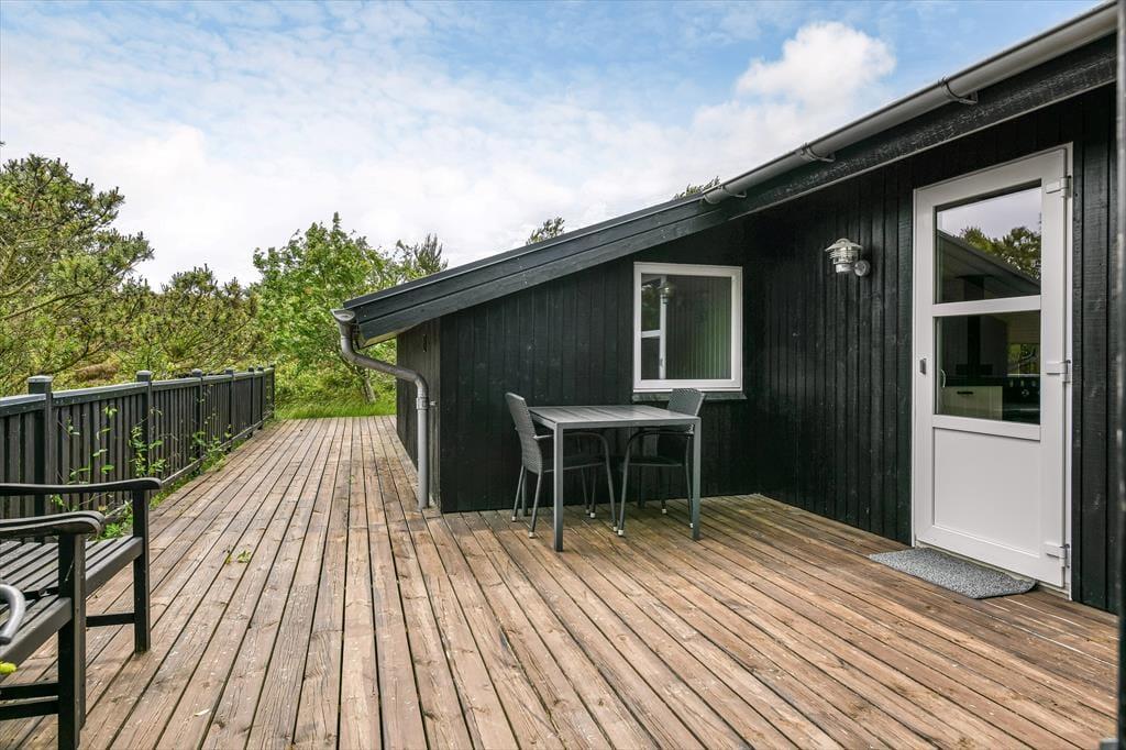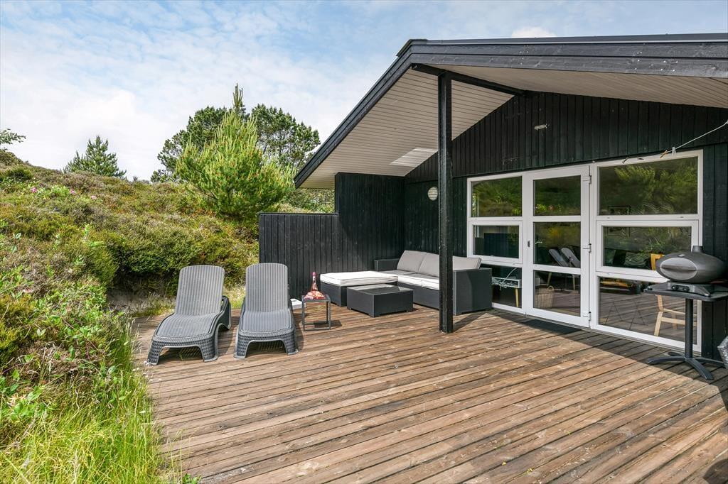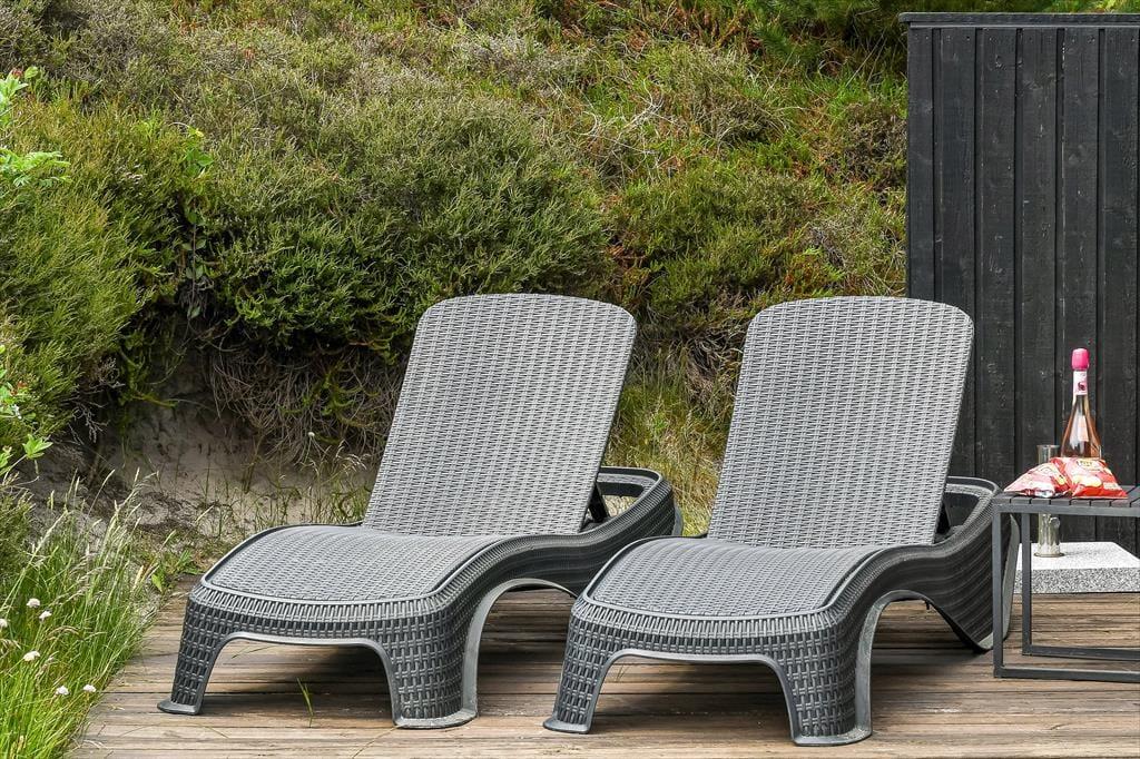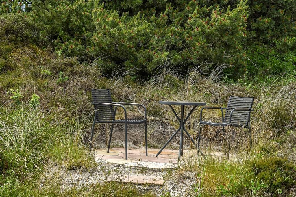 Udenfor venter en dejlig terrasse, som både er delvist overdækket og ligger godt i læ af klitterne – perfekt til udeliv i al slags vejr. Her kan du nyde din morgenmad, mens fuglene kvidrer i baggrunden, eller finde skygge under overdækningen med en god bog på de varme sommerdage. Den ugenerede beliggenhed gør det let at slappe helt af, og du har rig mulighed for at være dig selv i naturens stille selskab. Når solen står højt, kan liggestolene trækkes frem, og du kan læne dig tilbage med udsigt over det bølgende landskab. Aftensmaden smager ekstra godt under åben himmel, og grillen er oplagt at tænde, når du vil forkæle smagsløgene efter en lang dag med strandture og oplevelser. Uanset om du søger ro og fordybelse eller tid med dem, du holder af, skaber terrassen rammen om mange gode feriestunder.