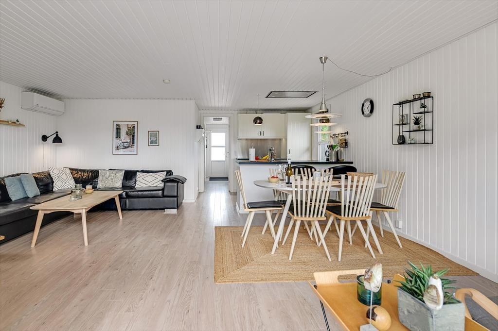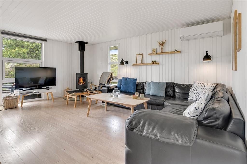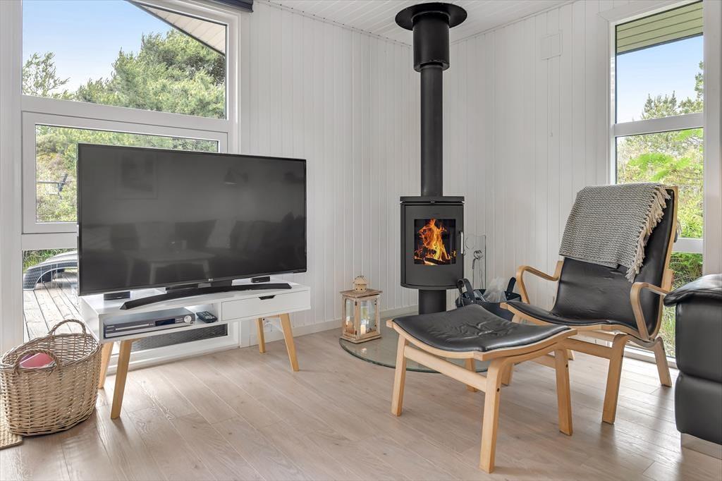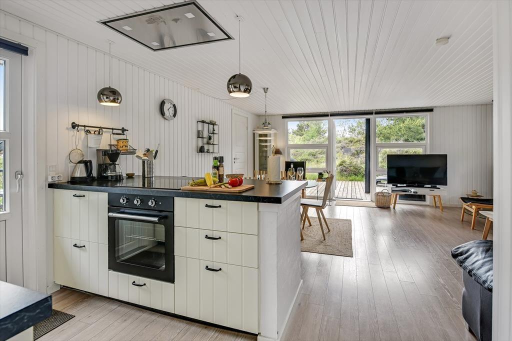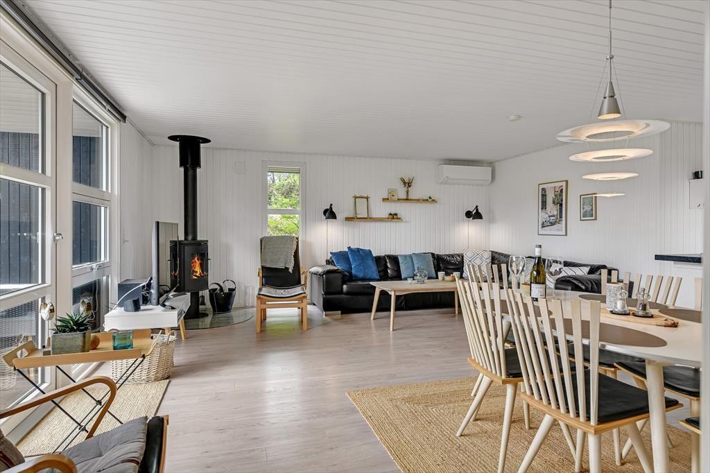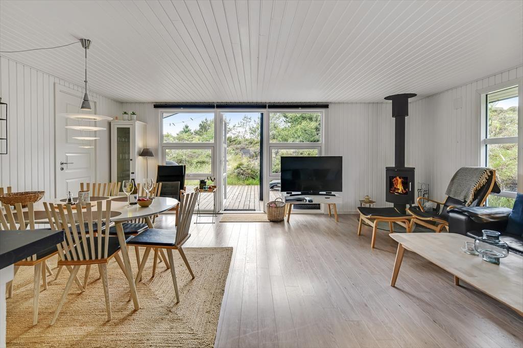 Når du træder ind i sommerhuset, bliver du mødt af en lys og behagelig atmosfære, hvor indretningen inviterer til både afslapning og samvær. Husets naturlige hjerte er det skønne køkken-alrum. Her er der plads til at samle hele familien om morgenbordet, brætspil og ferielivets små stjernestunder. De store vinduespartier trækker lyset indenfor og giver dig mulighed for at nyde den fantastiske udsigt over det omkringliggende klit- og hedelandskab – selv på dage, hvor vejret inviterer til indendørs hygge. Farverne i huset er lyse og naturlige, hvilket understreger fornemmelsen af ro og rummelighed. Uanset om du starter dagen med en stille kop kaffe ved spisebordet eller slutter den i sofaen med en god film og stearinlys på bordet, er der altid udsigt til naturen og plads til fordybelse.