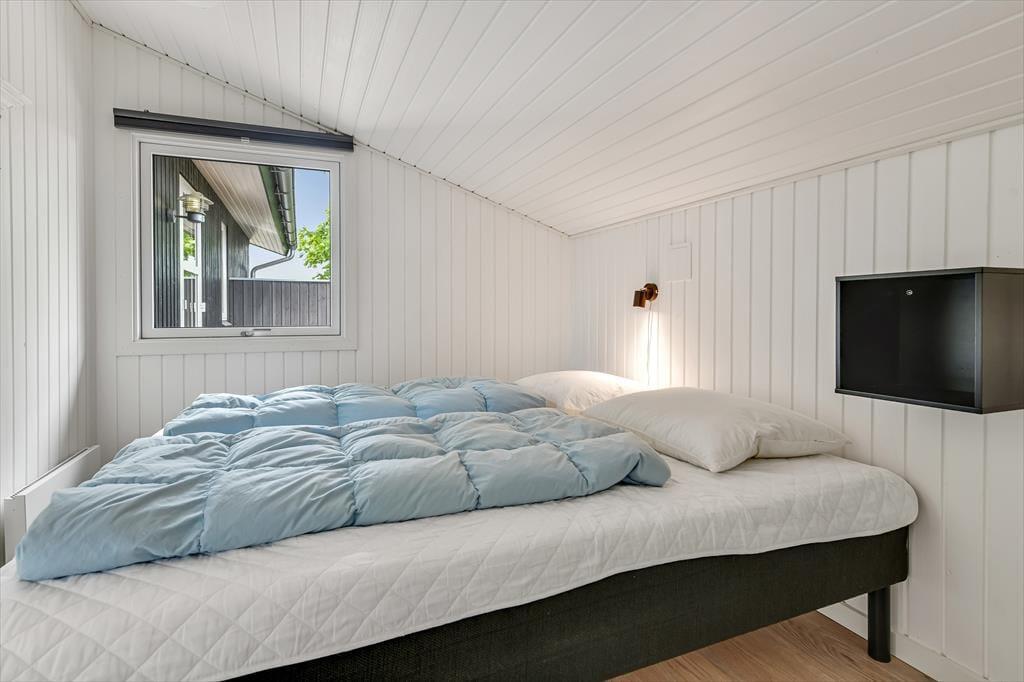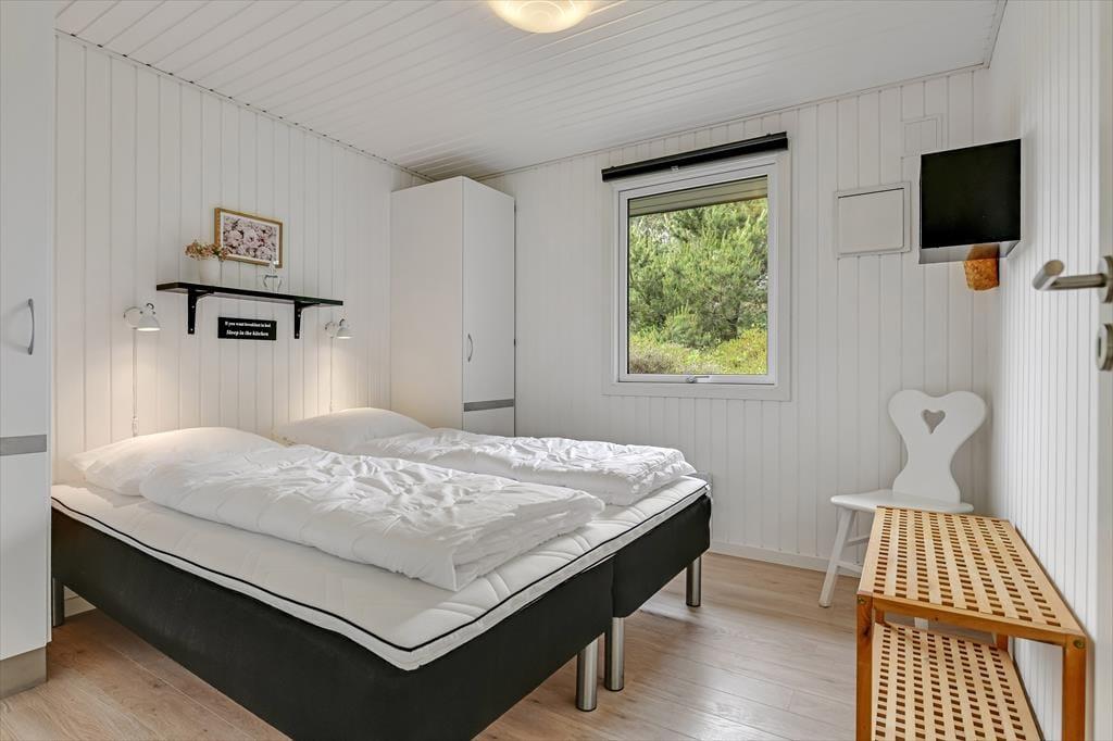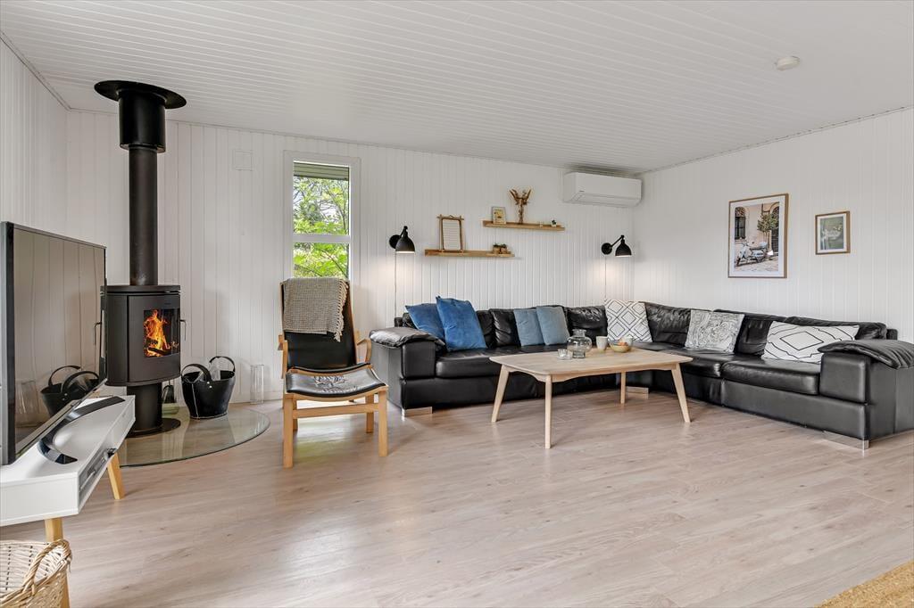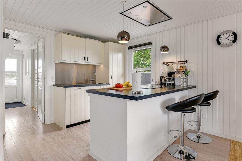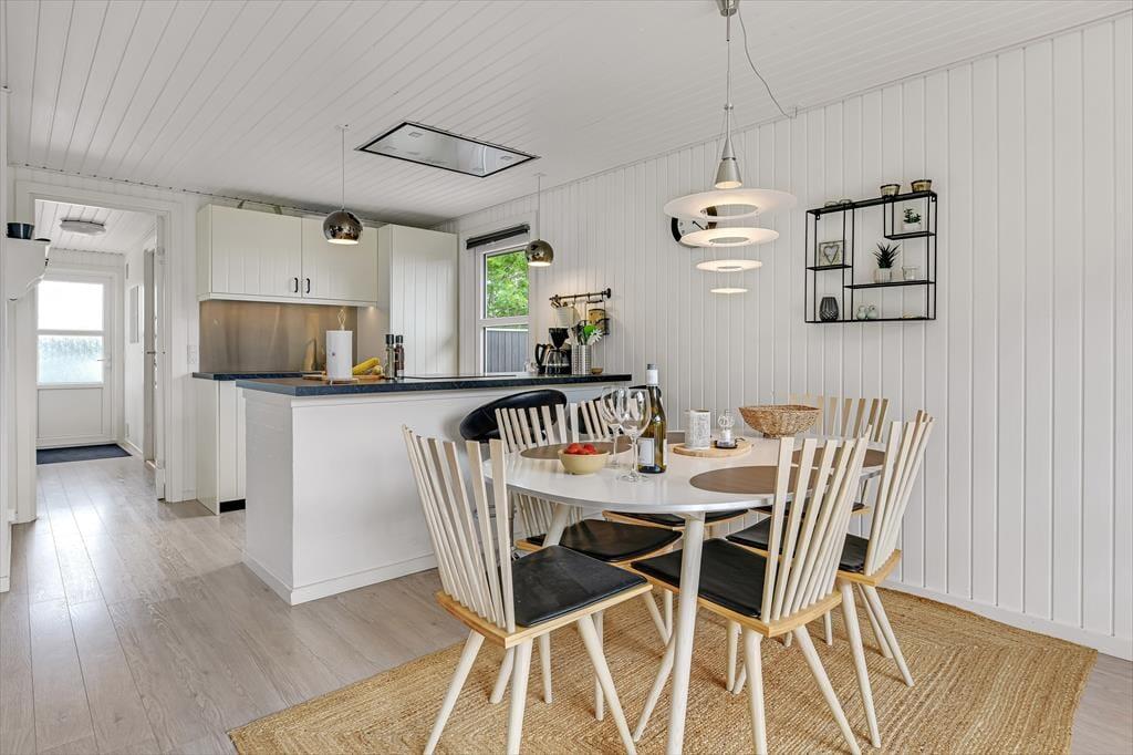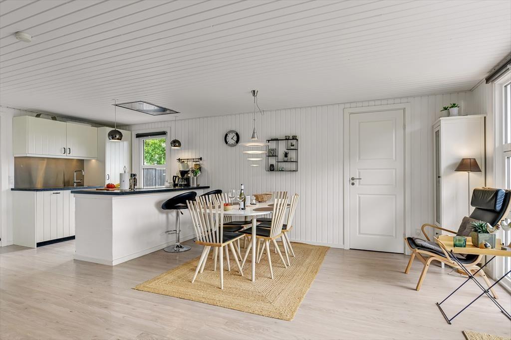 Når du træder ind i sommerhuset, bliver du mødt af en lys og behagelig atmosfære, hvor indretningen inviterer til både afslapning og samvær. Husets naturlige hjerte er det skønne køkken-alrum. Her er der plads til at samle hele familien om morgenbordet, brætspil og ferielivets små stjernestunder. De store vinduespartier trækker lyset indenfor og giver dig mulighed for at nyde den fantastiske udsigt over det omkringliggende klit- og hedelandskab – selv på dage, hvor vejret inviterer til indendørs hygge. Farverne i huset er lyse og naturlige, hvilket understreger fornemmelsen af ro og rummelighed. Uanset om du starter dagen med en stille kop kaffe ved spisebordet eller slutter den i sofaen med en god film og stearinlys på bordet, er der altid udsigt til naturen og plads til fordybelse.