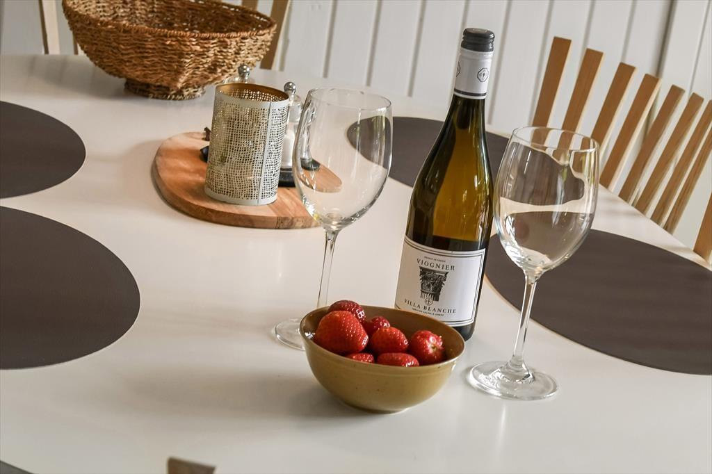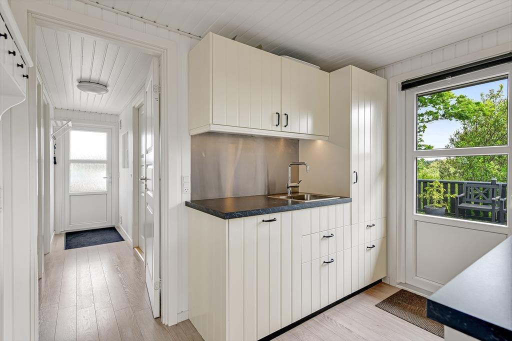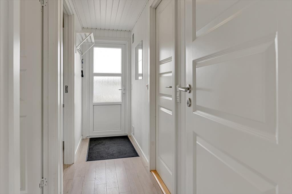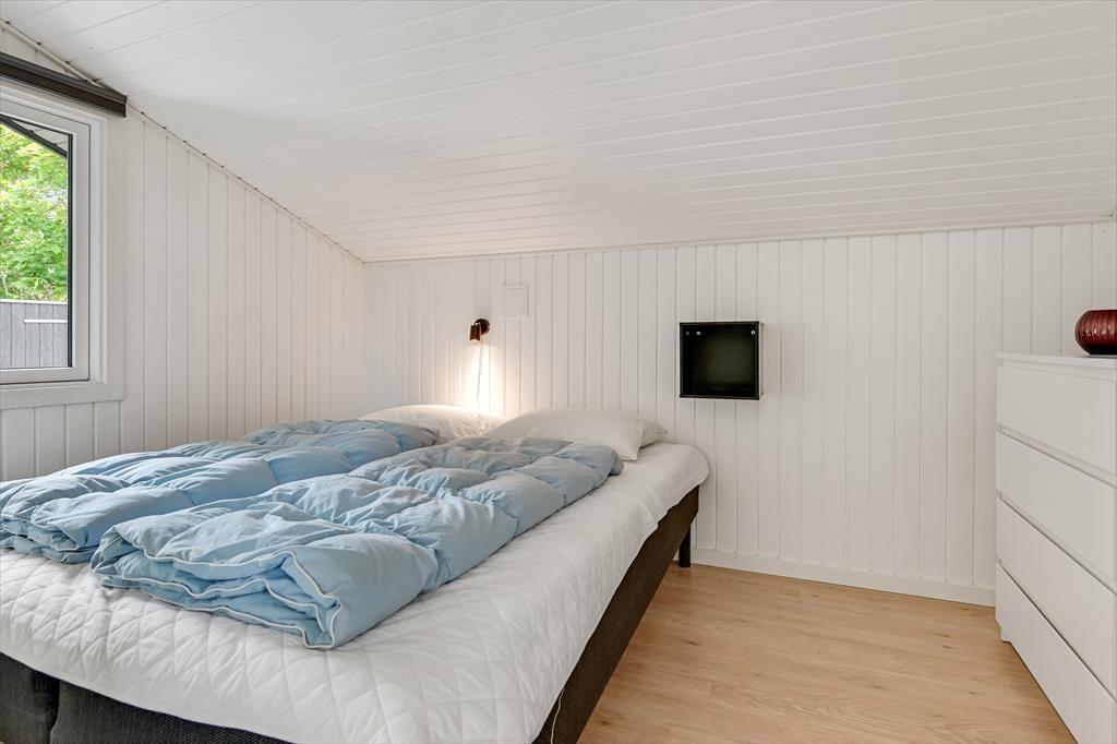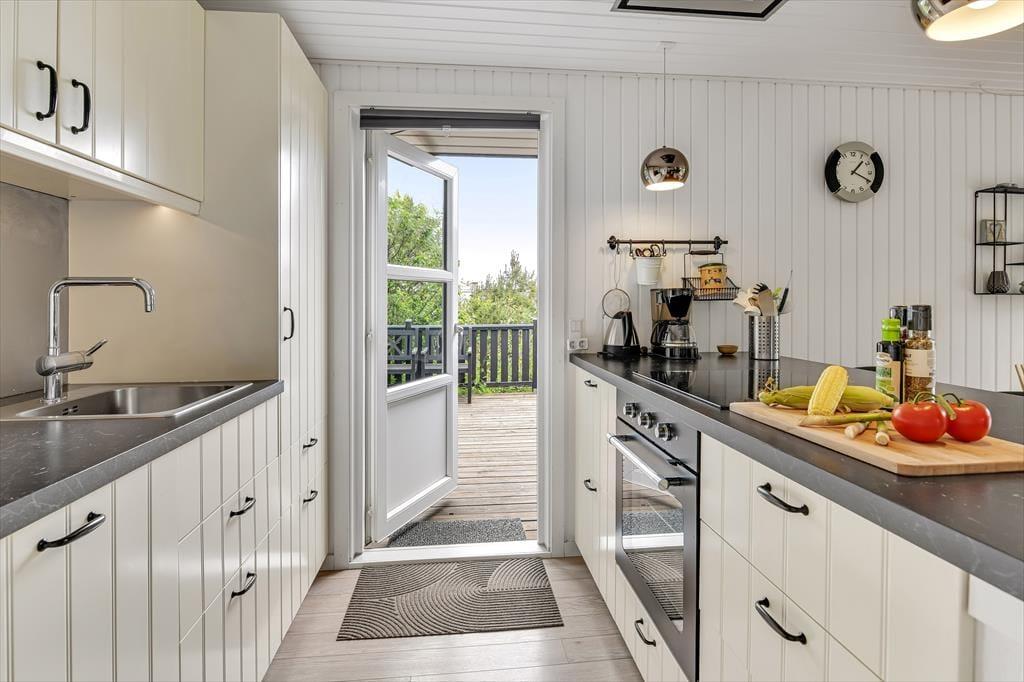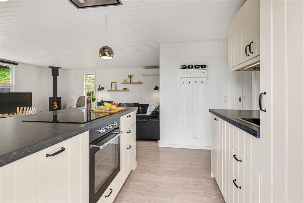 Når du træder ind i sommerhuset, bliver du mødt af en lys og behagelig atmosfære, hvor indretningen inviterer til både afslapning og samvær. Husets naturlige hjerte er det skønne køkken-alrum. Her er der plads til at samle hele familien om morgenbordet, brætspil og ferielivets små stjernestunder. De store vinduespartier trækker lyset indenfor og giver dig mulighed for at nyde den fantastiske udsigt over det omkringliggende klit- og hedelandskab – selv på dage, hvor vejret inviterer til indendørs hygge. Farverne i huset er lyse og naturlige, hvilket understreger fornemmelsen af ro og rummelighed. Uanset om du starter dagen med en stille kop kaffe ved spisebordet eller slutter den i sofaen med en god film og stearinlys på bordet, er der altid udsigt til naturen og plads til fordybelse.